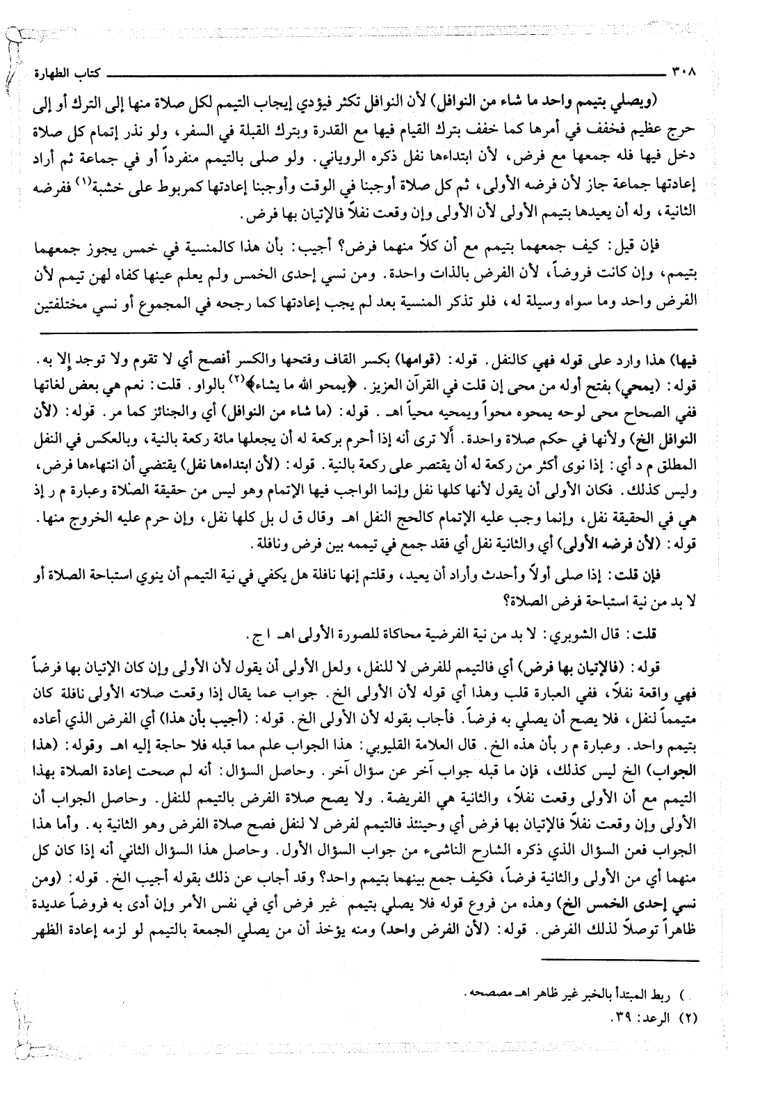وَحَاصِلُ الْجَوَابِ أَنَّ الْأُولَى وَإِنْ وَقَعَتْ نَفْلًا فَالْإِتْيَانُ بِهَا فَرْضٌ أَيْ وَحِينَئِذٍ فَالتَّيَمُّمُ لِفَرْضٍ لَا لِنَفْلٍ فَصَحَّ صَلَاةُ الْفَرْضِ وَهُوَ الثَّانِيَةُ بِهِ. وَأَمَّا هَذَا الْجَوَابُ فَعَنْ السُّؤَالِ الَّذِي ذَكَرَهُ الشَّارِحُ النَّاشِئُ مِنْ جَوَابِ السُّؤَالِ الْأَوَّلِ. وَحَاصِلُ هَذَا السُّؤَالِ الثَّانِي أَنَّهُ إذَا كَانَ كُلٌّ مِنْهُمَا أَيْ مِنْ الْأُولَى وَالثَّانِيَةِ فَرْضًا، فَكَيْفَ جَمَعَ بَيْنَهُمَا بِتَيَمُّمٍ وَاحِدٍ؟ وَقَدْ أَجَابَ عَنْ ذَلِكَ بِقَوْلِهِ: أُجِيبُ إلَخْ.