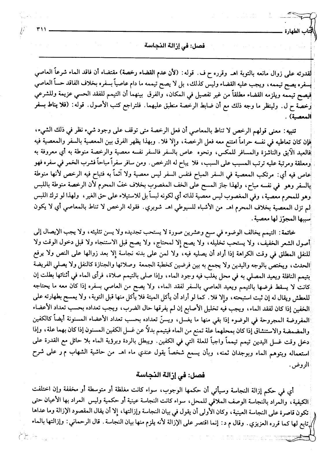 ِ أَيْ فِي حُكْمِ إزَالَةِ النَّجَاسَةِ وَسَيَأْتِي أَنَّ حُكْمَهَا الْوُجُوبُ، سَوَاءٌ كَانَتْ مُغَلَّظَةً أَوْ مُتَوَسِّطَةً أَوْ مُخَفَّفَةً، وَإِنْ اخْتَلَفَتْ الْكَيْفِيَّةُ، وَالْمُرَادُ بِالنَّجَاسَةِ الْوَصْفُ الْمُلَاقِي لِلْمَحَلِّ، سَوَاءٌ كَانَتْ النَّجَاسَةُ عَيْنِيَّةً أَوْ حُكْمِيَّةً، وَلَيْسَ الْمُرَادُ بِهَا الْأَعْيَانَ حَتَّى تَكُونَ قَاصِرَةً عَلَى النَّجَاسَةِ الْعَيْنِيَّةِ، وَكَانَ الْأَوْلَى أَنْ يَقُولَ فِي بَيَانِ النَّجَاسَةِ وَإِزَالَتِهَا، إلَّا أَنْ يُقَالَ الْمَقْصُودُ الْإِزَالَةُ وَمَا عَدَاهَا تَابِعٌ لَهَا كَمَا قَرَّرَهُ الْعَزِيزِيُّ. وَقَالَ م د: إنَّمَا اقْتَصَرَ عَلَى الْإِزَالَةِ؛ لِأَنَّهُ يَلْزَمُ مِنْهَا بَيَانُ النَّجَاسَةِ. قَالَ الرَّحْمَانِيُّ: وَإِزَالَتُهَا بِالْمَاءِ