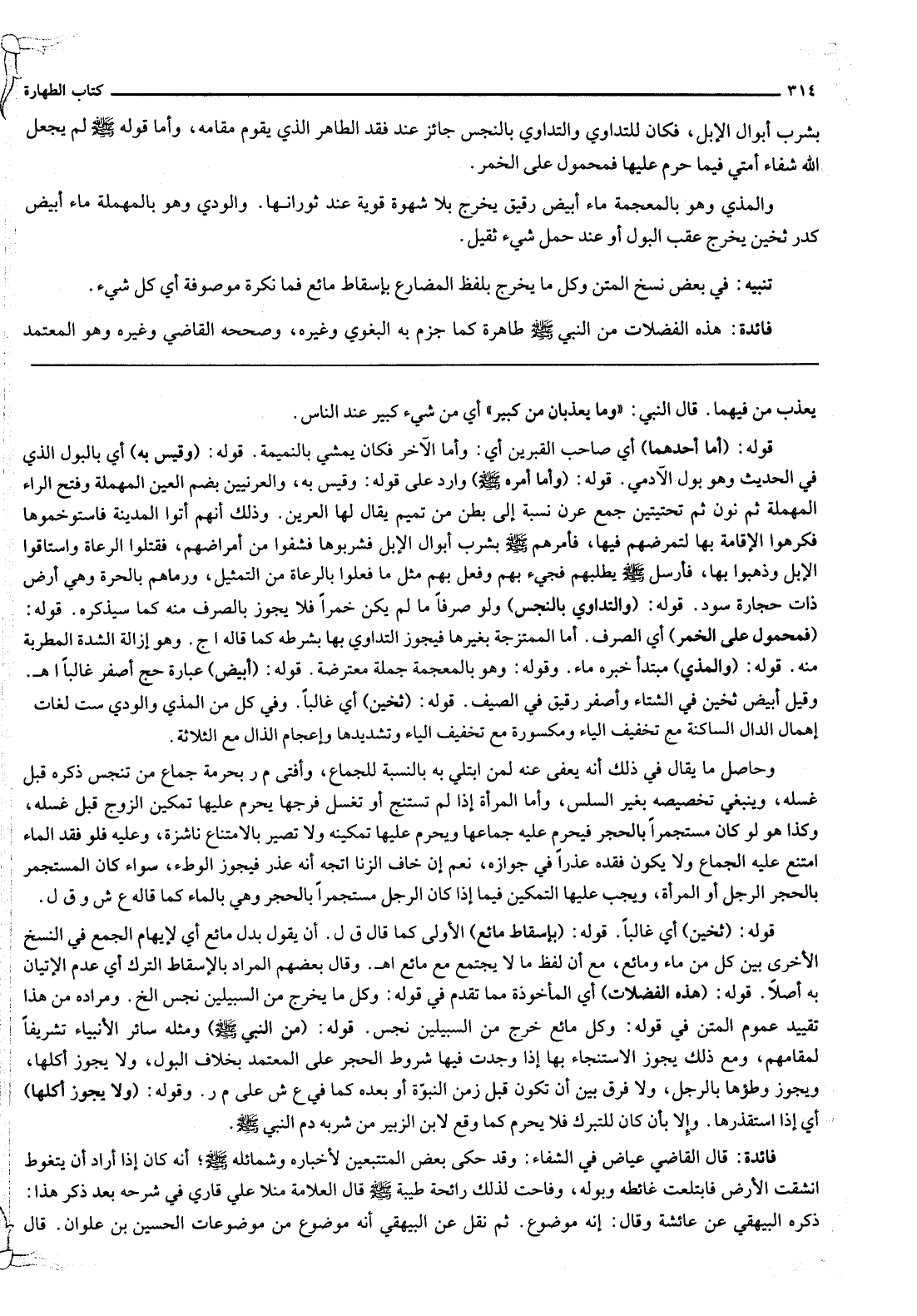 قَوْلُهُ: (وَأَمَّا أَمْرُهُ - صَلَّى اللَّهُ عَلَيْهِ وَسَلَّمَ -) وَارِدٌ عَلَى قَوْلِهِ: وَقِيسَ بِهِ، وَالْعُرَنِيِّينَ بِضَمِّ الْعَيْنِ الْمُهْمَلَةِ وَفَتْحِ الرَّاءِ الْمُهْمَلَةِ ثُمَّ نُونٍ ثُمَّ تَحْتِيَّتَيْنِ جَمْعُ عُرَنِيٍّ نِسْبَةً إلَى بَطْنٍ مِنْ تَمِيمٍ يُقَالُ لَهَا عُرَنَةُ. وَذَلِكَ أَنَّهُمْ «أَتَوْا الْمَدِينَةَ فَاسْتَوْخَمُوهَا فَكَرِهُوا الْإِقَامَةَ بِهَا لِتَمَرُّضِهِمْ فِيهَا، فَأَمَرَهُمْ - صَلَّى اللَّهُ عَلَيْهِ وَسَلَّمَ - بِشُرْبِ أَبْوَالِ الْإِبِلِ فَشَرِبُوهَا فَشُفُوا مِنْ أَمْرَاضِهِمْ، فَقَتَلُوا الرُّعَاةَ وَاسْتَاقُوا الْإِبِلَ وَذَهَبُوا بِهَا، فَأَرْسَلَ - صَلَّى اللَّهُ عَلَيْهِ وَسَلَّمَ - يَطْلُبُهُمْ فَجِيءَ بِهِمْ وَفَعَلَ بِهِمْ مِثْلَ مَا فَعَلُوا بِالرُّعَاةِ مِنْ التَّمْثِيلِ، وَرَمَاهُمْ بِالْحَرَّةِ وَهِيَ أَرْضٌ ذَاتُ حِجَارَةٍ سُودٍ» . قَوْلُهُ: (وَالتَّدَاوِي بِالنَّجِسِ) وَلَوْ صِرْفًا مَا لَمْ يَكُنْ خَمْرًا فَلَا يَجُوزُ بِالصِّرْفِ مِنْهُ كَمَا سَيَذْكُرُهُ. قَوْلُهُ: (فَمَحْمُولٌ عَلَى الْخَمْرِ) أَيْ الصِّرْفُ. أَمَّا الْمُمْتَزِجَةُ بِغَيْرِهَا فَيَجُوزُ التَّدَاوِي بِهَا بِشَرْطِهِ كَمَا قَالَهُ اج. وَهُوَ إزَالَةُ الشِّدَّةِ الْمُطْرِبَةِ مِنْهُ.