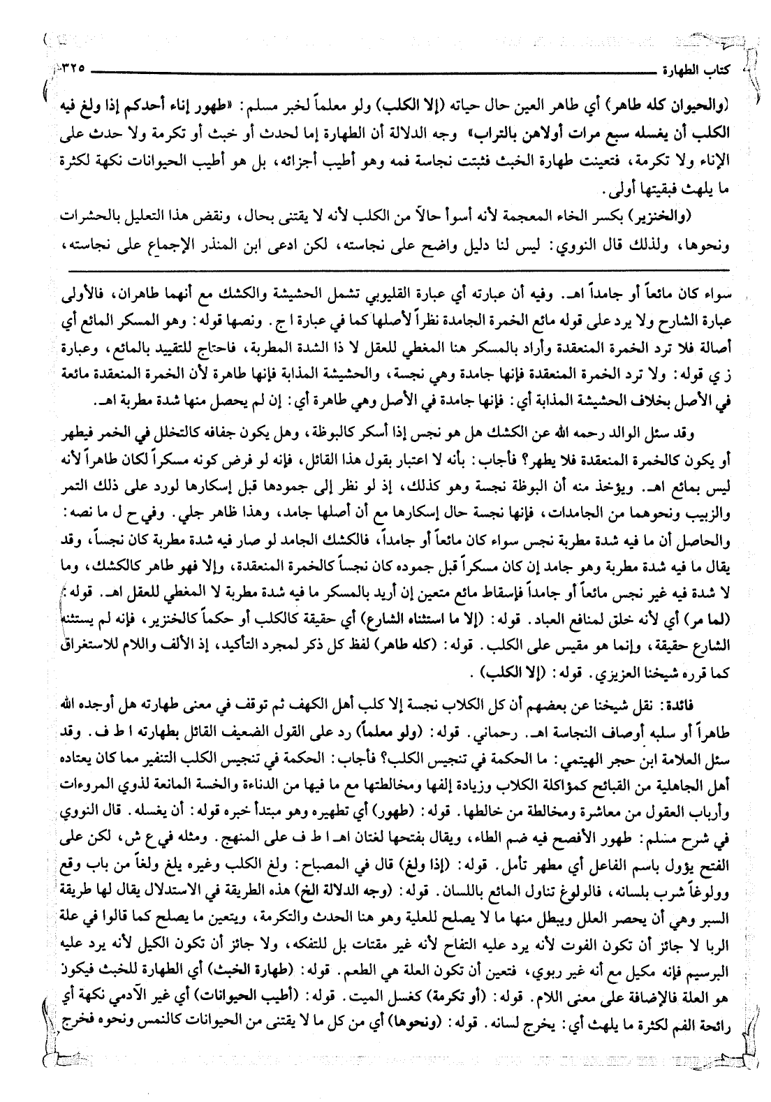 قَوْلُهُ: (إلَّا الْكَلْبَ) . فَائِدَةٌ: نَقَلَ شَيْخُنَا عَنْ بَعْضِهِمْ أَنَّ كُلَّ الْكِلَابِ نَجِسَةٌ إلَّا كَلْبَ أَهْلِ الْكَهْفِ ثُمَّ تَوَقَّفَ فِي مَعْنَى طَهَارَتِهِ هَلْ أَوْجَدَهُ اللَّهُ طَاهِرًا أَوْ سَلَبَهُ أَوْصَافَ النَّجَاسَةِ اهـ. رَحْمَانِيٌّ.