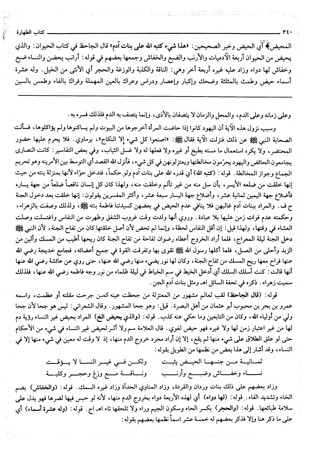 أَيْ الْحَيْضِ وَخَبَرُ الصَّحِيحَيْنِ: «هَذَا شَيْءٌ كَتَبَهُ اللَّهُ عَلَى بَنَاتِ آدَمَ» قَالَ الْجَاحِظُ فِي كِتَابِ الْحَيَوَانِ: وَاَلَّذِي يَحِيضُ مِنْ الْحَيَوَانِ أَرْبَعَةٌ الْآدَمِيَّاتُ وَالْأَرْنَبُ وَالضَّبُعُ وَالْخُفَّاشُ وَجَمَعَهَا بَعْضُهُمْ فِي قَوْلِهِ: