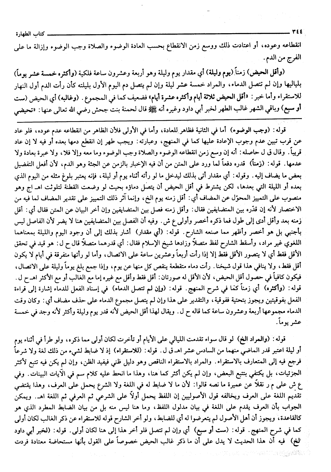 (وَأَقَلُّ الْحَيْضِ) زَمَنًا (يَوْمٌ وَلَيْلَةٌ) أَيْ مِقْدَارُ يَوْمٍ وَلَيْلَةٍ، وَهُوَ أَرْبَعَةٌ وَعِشْرُونَ سَاعَةً فَلَكِيَّةً (وَأَكْثَرُهُ خَمْسَةَ عَشَرَ يَوْمًا) بِلَيَالِيِهَا وَإِنْ لَمْ تَتَّصِلْ الدِّمَاءُ، وَالْمُرَادُ خَمْسَةَ عَشَرَ لَيْلَةً، وَإِنْ لَمْ يَتَّصِلْ دَمُ الْيَوْمِ الْأَوَّلِ بِلَيْلَتِهِ كَأَنْ رَأَتْ الدَّمَ أَوَّلَ النَّهَارِ لِلِاسْتِقْرَاءِ، وَأَمَّا خَبَرُ: «أَقَلُّ الْحَيْضِ ثَلَاثَةُ أَيَّامٍ وَأَكْثَرُهُ عَشْرَةُ أَيَّامٍ» فَضَعِيفٌ كَمَا فِي الْمَجْمُوعِ. (وَغَالِبُهُ) أَيْ الْحَيْضِ (سِتٌّ أَوْ سَبْعٌ) وَبَاقِي الشَّهْرِ غَالِبُ الطُّهْرِ لِخَبَرِ أَبِي دَاوُد وَغَيْرِهِ «أَنَّهُ - صَلَّى اللَّهُ عَلَيْهِ وَسَلَّمَ - قَالَ لِحَمْنَةَ بِنْتِ جَحْشٍ - رَضِيَ اللَّهُ تَعَالَى عَنْهَا -: تَحَيَّضِي