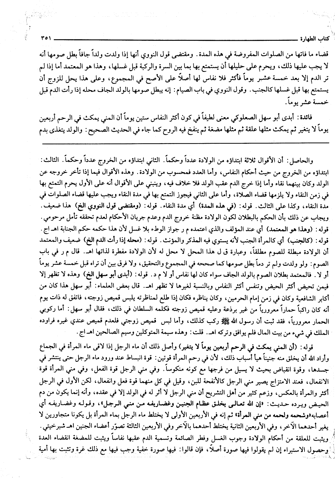 قَضَاءُ مَا فَاتَهَا مِنْ الصَّلَوَاتِ الْمَفْرُوضَةِ فِي هَذِهِ الْمُدَّةِ. وَمُقْتَضَى قَوْلِ النَّوَوِيِّ أَنَّهَا إذَا وَلَدَتْ وَلَدًا جَافًّا بَطَلَ صَوْمُهَا أَنَّهُ لَا يَجِبُ عَلَيْهَا ذَلِكَ، وَيَحْرُمُ عَلَى حَلِيلِهَا أَنْ يَسْتَمْتِعَ بِهَا بِمَا بَيْنَ السُّرَّةِ وَالرُّكْبَةِ قَبْلَ غُسْلِهَا، وَهَذَا هُوَ الْمُعْتَمَدُ أَمَّا إذَا لَمْ تَرَ الدَّمَ إلَّا بَعْدَ خَمْسَةَ عَشَرَ يَوْمًا فَأَكْثَرَ فَلَا نِفَاسَ لَهَا أَصْلًا عَلَى الْأَصَحِّ فِي الْمَجْمُوعِ، وَعَلَى هَذَا يَحِلُّ لِلزَّوْجِ أَنْ يَسْتَمْتِعَ بِهَا قَبْلَ غُسْلِهَا كَالْجُنُبِ. وَقَوْلُ النَّوَوِيِّ فِي بَابِ الصِّيَامِ: إنَّهُ يَبْطُلُ صَوْمُهَا بِالْوَلَدِ الْجَافِّ مَحَلُّهُ إذَا رَأَتْ الدَّمَ قَبْلَ خَمْسَةَ عَشَرَ يَوْمًا. فَائِدَةٌ: أَبْدَى أَبُو سَهْلٍ الصُّعْلُوكِيُّ مَعْنًى لَطِيفًا فِي كَوْنِ أَكْثَرِ النِّفَاسِ سِتِّينَ يَوْمًا أَنَّ الْمَنِيَّ يَمْكُثُ فِي الرَّحِمِ أَرْبَعِينَ يَوْمًا لَا يَتَغَيَّرُ ثُمَّ يَمْكُثُ مِثْلَهَا عَلَقَةً ثُمَّ مِثْلَهَا مُضْغَةً ثُمَّ يُنْفَخُ فِيهِ الرُّوحُ كَمَا جَاءَ فِي الْحَدِيثِ الصَّحِيحِ: وَالْوَلَدُ يَتَغَذَّى بِدَمِ