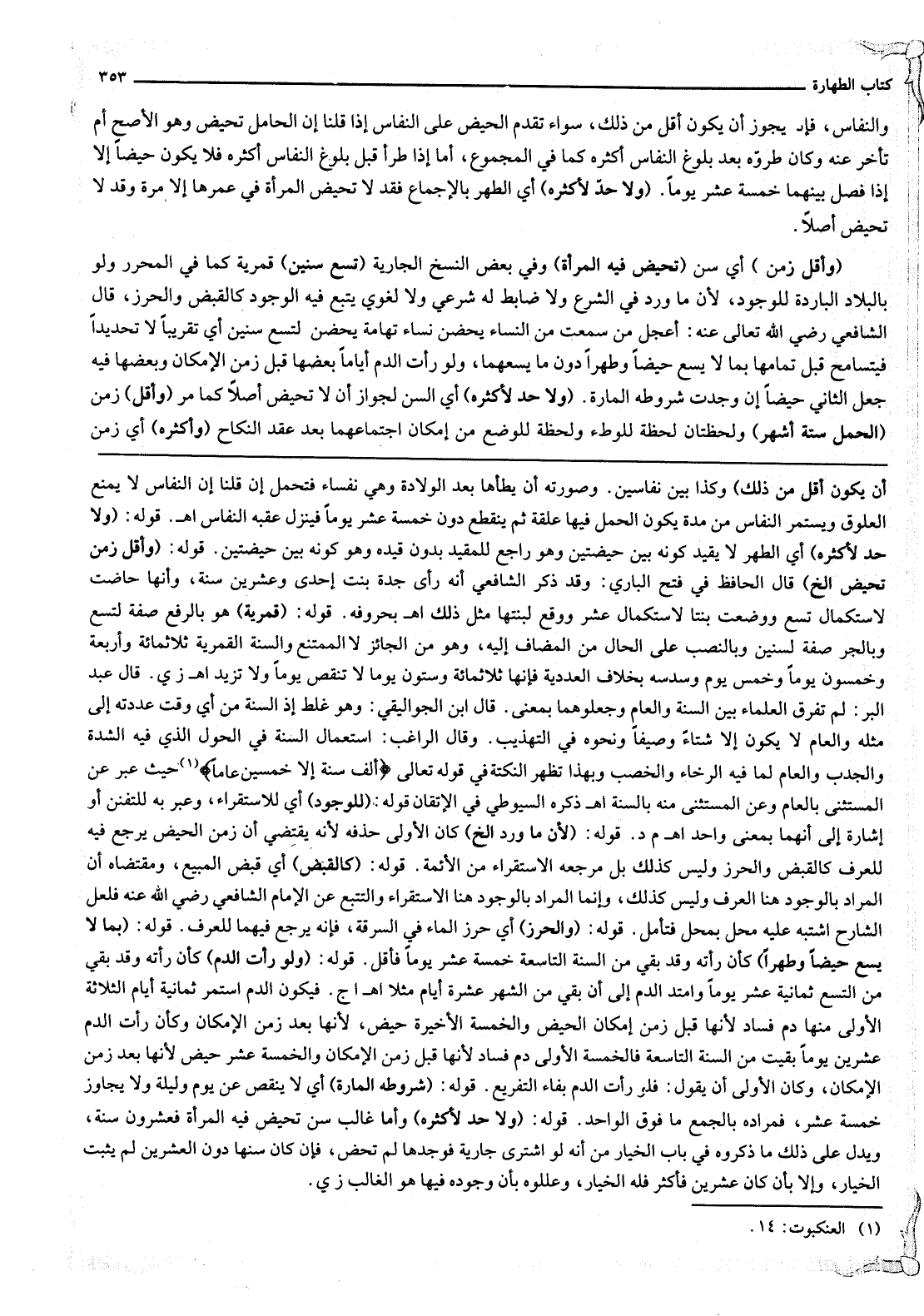 قَوْلُهُ: (شُرُوطُهُ الْمَارَّةُ) أَيْ لَا يَنْقُصُ عَنْ يَوْمٍ وَلَيْلَةٍ وَلَا يُجَاوِزُ خَمْسَةَ عَشَرَ، فَمُرَادُهُ بِالْجَمْعِ مَا فَوْقَ الْوَاحِدِ. قَوْلُهُ: (وَلَا حَدَّ لِأَكْثَرِهِ) وَأَمَّا غَالِبُ سِنٍّ تَحِيضُ فِيهِ الْمَرْأَةُ فَعِشْرُونَ سَنَةً، وَيَدُلُّ عَلَى ذَلِكَ مَا ذَكَرُوهُ فِي بَابِ الْخِيَارِ مِنْ أَنَّهُ لَوْ اشْتَرَى جَارِيَةً فَوَجَدَهَا لَمْ تَحِضْ، فَإِنْ كَانَ سِنُّهَا دُونَ الْعِشْرِينَ لَمْ يَثْبُتْ الْخِيَارُ، وَإِلَّا بِأَنْ كَانَ عِشْرِينَ فَأَكْثَرَ فَلَهُ الْخِيَارُ، وَعَلَّلُوهُ بِأَنَّ وُجُودَهُ فِيهَا هُوَ الْغَالِبُ ز ي.