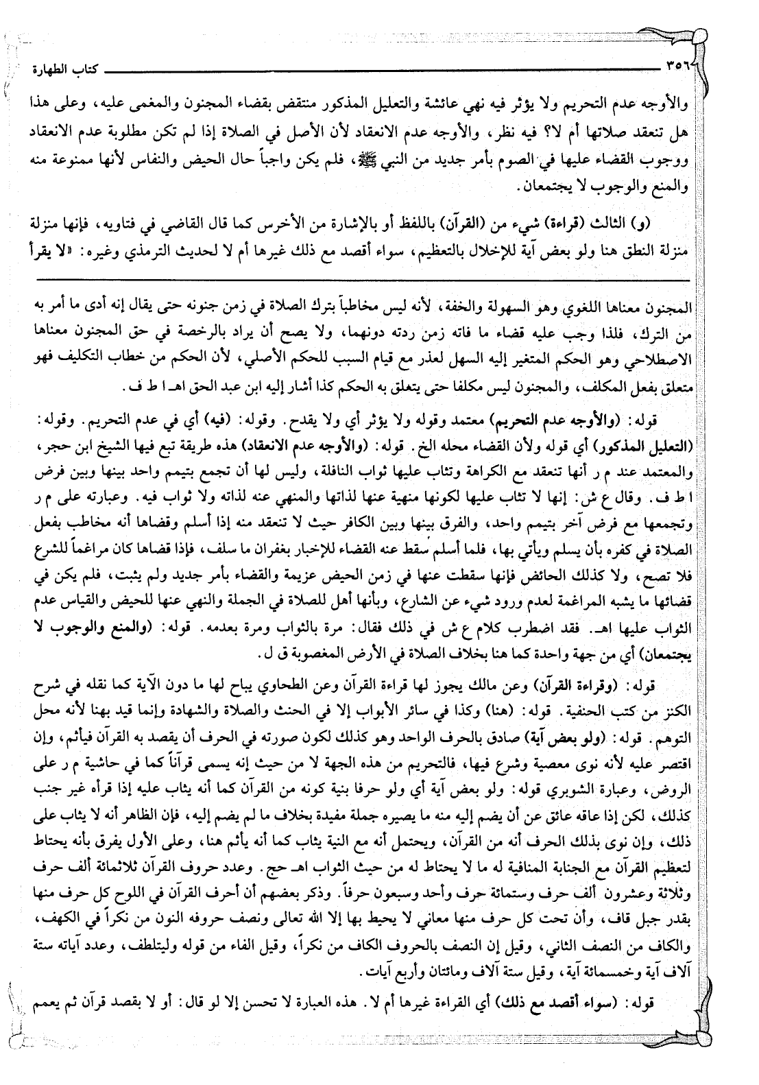 قَوْلُهُ: (وَقِرَاءَةُ الْقُرْآنِ) وَعَنْ مَالِكٍ: يَجُوزُ لَهَا قِرَاءَةُ الْقُرْآنِ، وَعَنْ الطَّحَاوِيِّ يُبَاحُ لَهَا مَا دُونَ الْآيَةِ كَمَا نَقَلَهُ فِي شَرْحِ الْكَنْزِ مِنْ كُتُبِ الْحَنَفِيَّةِ. قَوْلُهُ: (هُنَا) وَكَذَا فِي سَائِرِ الْأَبْوَابِ إلَّا فِي الْحِنْثِ وَالصَّلَاةِ وَالشَّهَادَةِ وَإِنَّمَا قَيَّدَ بِ هُنَا؛ لِأَنَّهُ مَحَلُّ التَّوَهُّمِ. قَوْلُهُ: (وَلَوْ بَعْضَ آيَةٍ) صَادِقٌ بِالْحَرْفِ الْوَاحِدِ وَهُوَ كَذَلِكَ لِكَوْنِ صُورَتِهِ فِي الْحَرْفِ أَنْ يَقْصِدَ بِهِ الْقُرْآنَ فَيَأْثَمَ، وَإِنْ اقْتَصَرَ عَلَيْهِ؛ لِأَنَّهُ نَوَى مَعْصِيَةً وَشَرَعَ فِيهَا، فَالتَّحْرِيمُ مِنْ هَذِهِ الْجِهَةِ لَا مِنْ حَيْثُ إنَّهُ يُسَمَّى قُرْآنًا كَمَا فِي حَاشِيَةِ م ر عَلَى الرَّوْضِ، وَعِبَارَةُ الشَّوْبَرِيِّ قَوْلُهُ: وَلَوْ بَعْضَ آيَةٍ أَيْ وَلَوْ حَرْفًا بِنِيَّةِ كَوْنِهِ مِنْ الْقُرْآنِ كَمَا أَنَّهُ يُثَابُ عَلَيْهِ إذَا قَرَأَهُ غَيْرُ جُنُبٍ كَذَلِكَ، لَكِنْ إذَا عَاقَهُ عَائِقٌ عَنْ أَنْ يَضُمَّ إلَيْهِ مِنْهُ مَا يُصَيِّرُهُ جُمْلَةً مُفِيدَةً بِخِلَافِ مَا لَمْ يَضُمَّ إلَيْهِ، فَإِنَّ الظَّاهِرَ أَنَّهُ لَا يُثَابُ عَلَى ذَلِكَ، وَإِنْ نَوَى بِذَلِكَ الْحَرْفِ أَنَّهُ مِنْ الْقُرْآنِ، وَيُحْتَمَلُ أَنَّهُ مَعَ النِّيَّةِ يُثَابُ كَمَا أَنَّهُ يَأْثَمُ هُنَا، وَعَلَى الْأَوَّلِ يُفَرَّقُ بِأَنَّهُ يُحْتَاطُ لِتَعْظِيمِ الْقُرْآنِ مَعَ الْجَنَابَةِ الْمُنَافِيَةِ لَهُ مَا لَا يُحْتَاطُ لَهُ مِنْ حَيْثُ الثَّوَابُ اهـ حَجّ. وَعَدَدُ حُرُوفِ الْقُرْآنِ ثَلَاثُمِائَةِ أَلْفِ حَرْفٍ وَثَلَاثَةٌ وَعِشْرُونَ أَلْفَ حَرْفٍ وَسِتُّمِائَةِ حَرْفٍ وَأَحَدٌ وَسَبْعُونَ حَرْفًا. وَذَكَرَ بَعْضُهُمْ أَنَّ أَحْرُفَ الْقُرْآنِ فِي اللَّوْحِ كُلُّ حَرْفٍ مِنْهَا بِقَدْرِ جَبَلِ قَافٍ، وَأَنَّ تَحْتَ كُلِّ حَرْفٍ مِنْهَا مَعَانِيَ لَا يُحِيطُ بِهَا إلَّا اللَّهُ تَعَالَى، وَنِصْفُ حُرُوفِهِ النُّونُ مِنْ نُكْرًا فِي الْكَهْفِ، وَالْكَافُ مِنْ النِّصْفِ الثَّانِي، وَقِيلَ إنَّ النِّصْفَ بِالْحُرُوفِ الْكَافُ مِنْ نُكْرًا، وَقِيلَ الْفَاءُ مِنْ قَوْلِهِ وَلْيَتَلَطَّفْ، وَعَدَدُ آيَاتِهِ سِتَّةُ آلَافِ آيَةٍ وَخَمْسُمِائَةِ آيَةٍ، وَقِيلَ سِتَّةُ آلَافٍ وَمِائَتَانِ وَأَرْبَعُ آيَاتٍ.