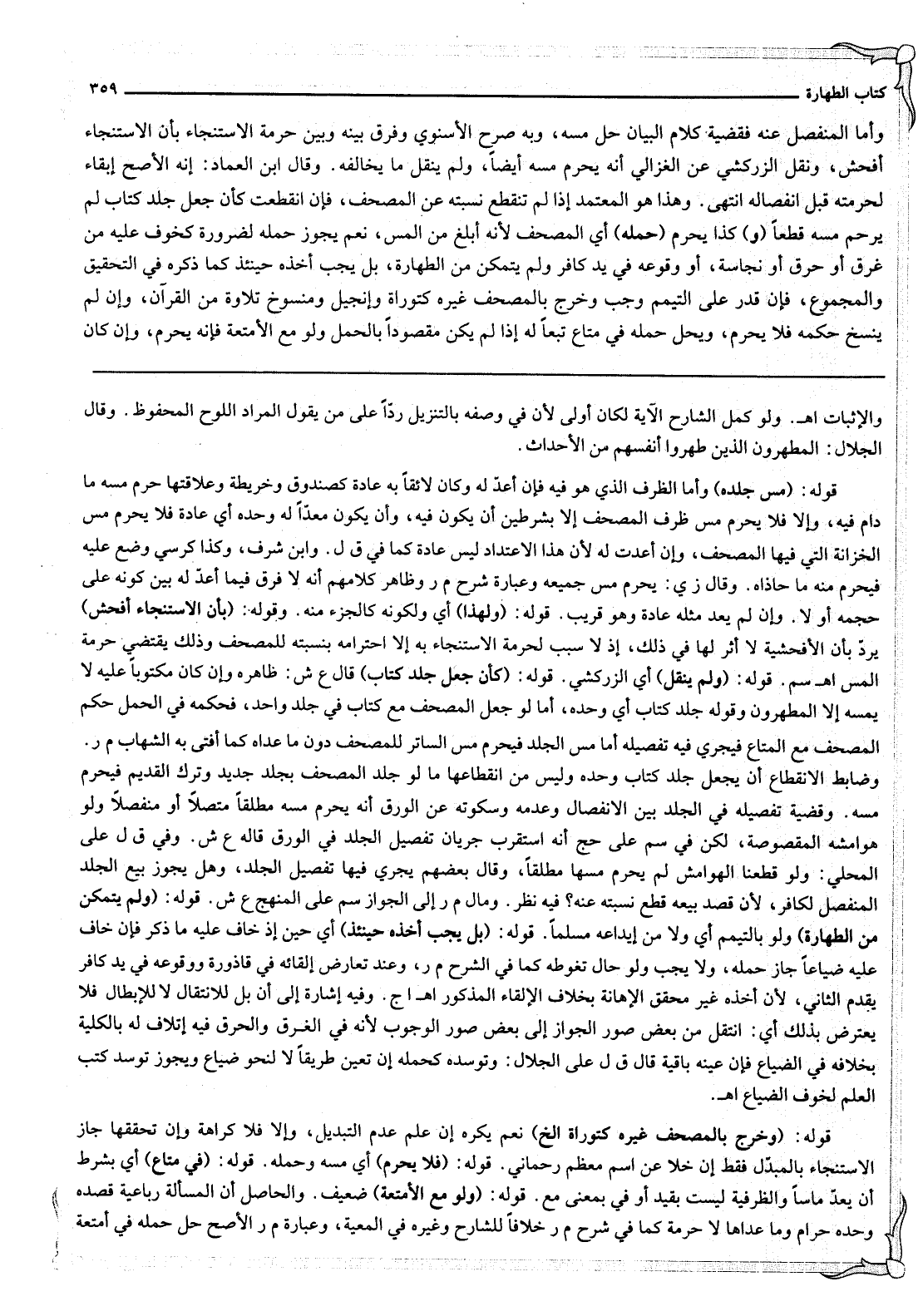 وَأَمَّا الْمُنْفَصِلُ عَنْهُ فَقَضِيَّةُ كَلَامِ الْبَيَانِ حِلُّ مَسِّهِ، وَبِهِ صَرَّحَ الْإِسْنَوِيُّ وَفَرَّقَ بَيْنَهُ وَبَيْنَ حُرْمَةِ الِاسْتِنْجَاءِ بِأَنَّ الِاسْتِنْجَاءَ أَفْحَشُ، وَنَقَلَ الزَّرْكَشِيّ عَنْ الْغَزَالِيِّ أَنَّهُ يَحْرُمُ مَسُّهُ أَيْضًا، وَلَمْ يَنْقُلْ مَا يُخَالِفُهُ. وَقَالَ ابْنُ الْعِمَادِ: إنَّهُ الْأَصَحُّ إبْقَاءً لِحُرْمَتِهِ قَبْلَ انْفِصَالِهِ انْتَهَى. وَهَذَا هُوَ الْمُعْتَمَدُ إذَا لَمْ تَنْقَطِعْ نِسْبَتُهُ عَنْ الْمُصْحَفِ، فَإِنْ انْقَطَعَتْ كَأَنْ جَعَلَ جِلْدَ كِتَابٍ لَمْ يَحْرُمْ مَسُّهُ قَطْعًا (وَ) كَذَا يَحْرُمُ (حَمْلُهُ) أَيْ الْمُصْحَفِ؛ لِأَنَّهُ أَبْلَغُ مِنْ الْمَسِّ، نَعَمْ يَجُوزُ حَمْلُهُ لِضَرُورَةٍ كَخَوْفٍ عَلَيْهِ مِنْ غَرَقٍ أَوْ حَرَقٍ أَوْ نَجَاسَةٍ، أَوْ وُقُوعِهِ فِي يَدِ كَافِرٍ، وَلَمْ يَتَمَكَّنْ مِنْ الطَّهَارَةِ، بَلْ يَجِبُ أَخْذُهُ حِينَئِذٍ كَمَا ذَكَرَهُ فِي التَّحْقِيقِ وَالْمَجْمُوعِ، فَإِنْ قَدَرَ عَلَى التَّيَمُّمِ وَجَبَ وَخَرَجَ بِالْمُصْحَفِ غَيْرُهُ كَتَوْرَاةٍ وَإِنْجِيلٍ وَمَنْسُوخِ تِلَاوَةٍ مِنْ الْقُرْآنِ، وَإِنْ لَمْ يُنْسَخْ حُكْمُهُ فَلَا يَحْرُمُ، وَيَحِلُّ حَمْلُهُ فِي مَتَاعٍ تَبَعًا لَهُ إذَا لَمْ يَكُنْ مَقْصُودًا بِالْحَمْلِ وَلَوْ مَعَ الْأَمْتِعَةِ فَإِنَّهُ يَحْرُمُ، وَإِنْ كَانَ