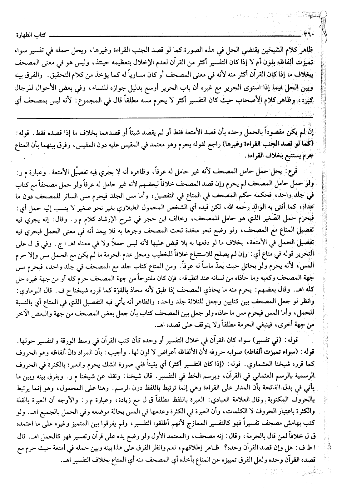 ظَاهِرُ كَلَامِ الشَّيْخَيْنِ يَقْتَضِي الْحِلَّ فِي هَذِهِ الصُّورَةِ كَمَا لَوْ قَصَدَ الْجُنُبُ الْقِرَاءَةَ وَغَيْرَهَا، وَيَحِلُّ حَمْلُهُ فِي تَفْسِيرٍ سَوَاءٌ تَمَيَّزَتْ أَلْفَاظُهُ بِلَوْنٍ أَمْ لَا إذَا كَانَ التَّفْسِيرُ أَكْثَرَ مِنْ الْقُرْآنِ لِعَدَمِ الْإِخْلَالِ بِتَعْظِيمِهِ حِينَئِذٍ، وَلَيْسَ هُوَ فِي مَعْنَى الْمُصْحَفِ بِخِلَافِ مَا إذَا كَانَ الْقُرْآنُ أَكْثَرَ مِنْهُ؛ لِأَنَّهُ فِي مَعْنَى الْمُصْحَفِ، أَوْ كَانَ مُسَاوِيًا لَهُ كَمَا يُؤْخَذُ مِنْ كَلَامِ التَّحْقِيقِ. وَالْفَرْقُ بَيْنَهُ وَبَيْنَ الْحِلِّ فِيمَا إذَا اسْتَوَى الْحَرِيرُ مَعَ غَيْرِهِ أَنَّ بَابَ الْحَرِيرِ أَوْسَعُ بِدَلِيلِ جَوَازِهِ لِلنِّسَاءِ، وَفِي بَعْضِ الْأَحْوَالِ لِلرِّجَالِ كَبَرْدٍ، وَظَاهِرُ كَلَامِ الْأَصْحَابِ حَيْثُ كَانَ التَّفْسِيرُ أَكْثَرَ لَا يَحْرُمُ مَسُّهُ مُطْلَقًا قَالَ فِي الْمَجْمُوعِ: لِأَنَّهُ لَيْسَ بِمُصْحَفٍ أَيْ