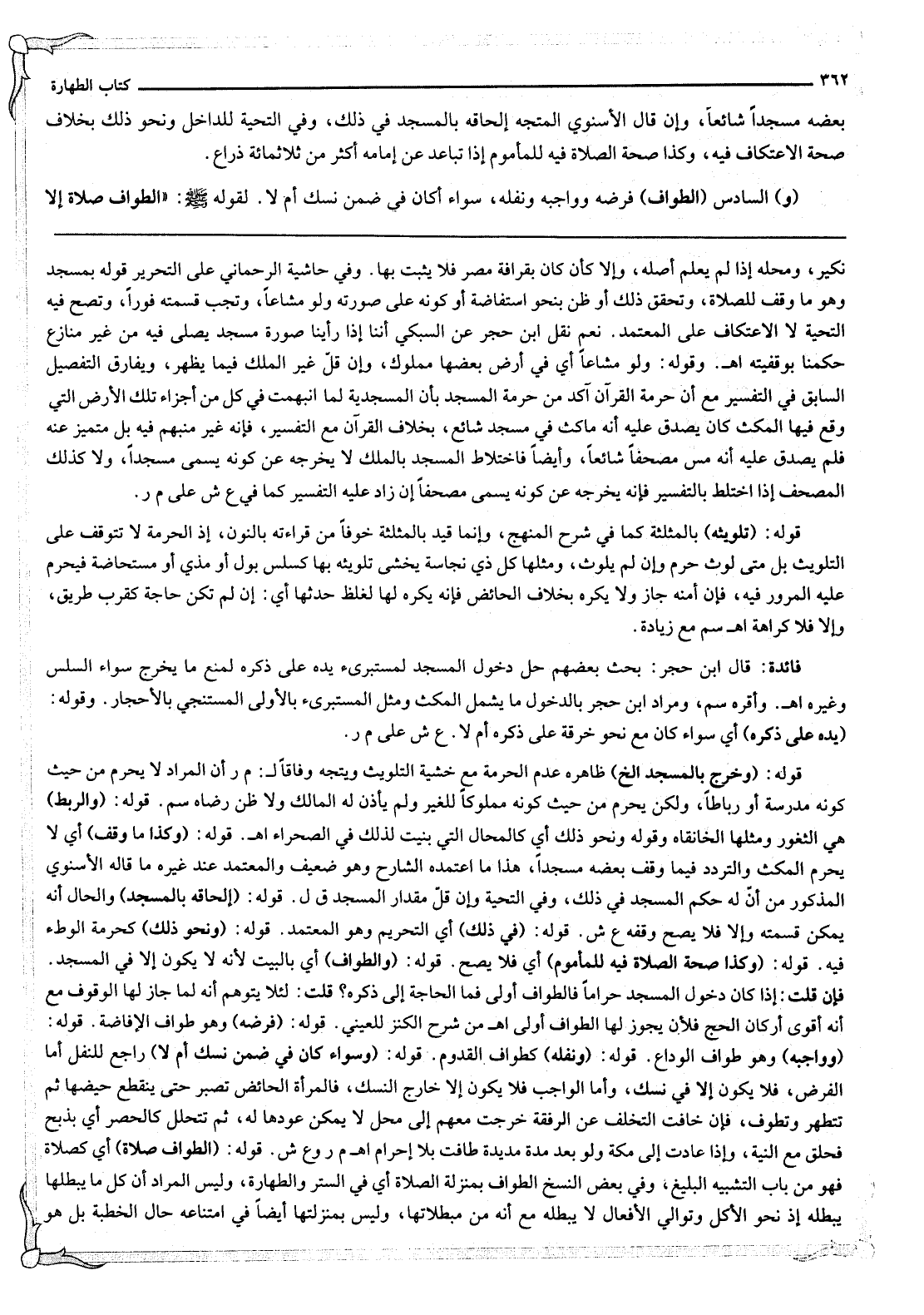 ـــــــــــــــــــــــــــــQنَكِيرٍ، وَمَحَلُّهُ إذَا لَمْ يَعْلَمْ أَصْلَهُ، وَإِلَّا كَأَنْ كَانَ بِقَرَافَةِ مِصْرَ فَلَا يَثْبُتُ بِهَا. وَفِي حَاشِيَةِ الرَّحْمَانِيِّ عَلَى التَّحْرِيرِ قَوْلُهُ بِمَسْجِدٍ وَهُوَ مَا وُقِفَ لِلصَّلَاةِ، وَتُحَقِّقَ ذَلِكَ أَوْ ظُنَّ بِنَحْوِ اسْتِفَاضَةٍ أَوْ كَوْنِهِ عَلَى صُورَتِهِ وَلَوْ مُشَاعًا، وَتَجِبُ قِسْمَتُهُ فَوْرًا، وَتَصِحُّ فِيهِ التَّحِيَّةُ لَا الِاعْتِكَافُ عَلَى الْمُعْتَمَدِ. نَعَمْ نَقَلَ ابْنُ حَجَرٍ عَنْ السُّبْكِيّ أَنَّنَا إذَا رَأَيْنَا صُورَةَ مَسْجِدٍ يُصَلَّى فِيهِ مِنْ غَيْرِ مُنَازِعٍ حَكَمْنَا بِوَقْفِيَّتِهِ اهـ. وَقَوْلُهُ: وَلَوْ مُشَاعًا أَيْ فِي أَرْضٍ بَعْضُهَا مَمْلُوكٌ، وَإِنْ قَلَّ غَيْرُ الْمِلْكِ فِيمَا يَظْهَرُ، وَيُفَارِقُ التَّفْصِيلَ السَّابِقَ فِي التَّفْسِيرِ مَعَ أَنَّ حُرْمَةَ الْقُرْآنِ آكَدُ مِنْ حُرْمَةِ الْمَسْجِدِ بِأَنَّ الْمَسْجِدِيَّةَ لَمَّا انْبَهَمَتْ فِي كُلٍّ مِنْ أَجْزَاءِ تِلْكَ الْأَرْضِ الَّتِي وَقَعَ فِيهَا الْمُكْثُ كَانَ يَصْدُقُ عَلَيْهِ أَنَّهُ مَاكِثٌ فِي مَسْجِدٍ شَائِعٍ، بِخِلَافِ الْقُرْآنِ مَعَ التَّفْسِيرِ، فَإِنَّهُ غَيْرُ مُنْبَهِمٍ فِيهِ بَلْ مُتَمَيِّزٌ عَنْهُ فَلَمْ يَصْدُقُ عَلَيْهِ أَنَّهُ مَسَّ مُصْحَفًا شَائِعًا، وَأَيْضًا فَاخْتِلَاطُ الْمَسْجِدِ بِالْمِلْكِ لَا يُخْرِجُهُ عَنْ كَوْنِهِ يُسَمَّى مَسْجِدًا، وَلَا كَذَلِكَ الْمُصْحَفُ إذَا اخْتَلَطَ بِالتَّفْسِيرِ فَإِنَّهُ يُخْرِجُهُ عَنْ كَوْنِهِ يُسَمَّى مُصْحَفًا إنْ زَادَ عَلَيْهِ التَّفْسِيرُ كَمَا فِي ع ش عَلَى م ر.