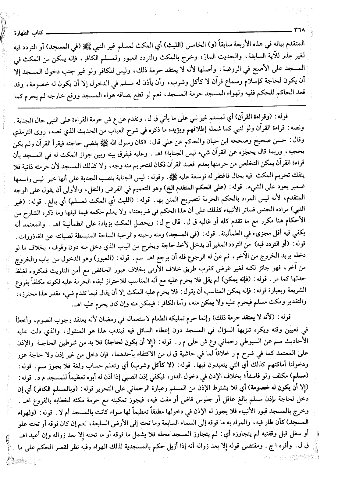 الْمُتَقَدِّمِ بَيَانُهُ فِي هَذِهِ الْأَرْبَعَةِ سَابِقًا (وَ) الْخَامِسُ (اللُّبْثُ) أَيْ الْمُكْثُ لِمُسْلِمٍ غَيْرَ النَّبِيِّ - صَلَّى اللَّهُ عَلَيْهِ وَسَلَّمَ - (فِي الْمَسْجِدِ) أَوْ التَّرَدُّدُ فِيهِ لِغَيْرِ عُذْرٍ لِلْآيَةِ السَّابِقَةِ، وَالْحَدِيثِ الْمَارِّ، وَخَرَجَ بِالْمُكْثِ وَالتَّرَدُّدِ الْعُبُورُ لِمُسْلِمٍ وَالْكَافِرُ، فَإِنَّهُ يُمَكَّنُ مِنْ الْمُكْثِ فِي الْمَسْجِدِ عَلَى الْأَصَحِّ فِي الرَّوْضَةِ، وَأَصْلِهَا لِأَنَّهُ لَا يَعْتَقِدُ حُرْمَةَ ذَلِكَ، وَلَيْسَ لِلْكَافِرِ وَلَوْ غَيْرَ جُنُبٍ دُخُولُ الْمَسْجِدِ إلَّا أَنْ يَكُونَ لِحَاجَةٍ كَإِسْلَامٍ وَسَمَاعِ قُرْآنٍ لَا كَأَكْلٍ وَشُرْبٍ، وَأَنْ يَأْذَنَ لَهُ مُسْلِمٌ فِي الدُّخُولِ إلَّا أَنْ يَكُونَ لَهُ خُصُومَةٌ، وَقَدْ قَعَدَ الْحَاكِمُ لِلْحُكْمِ فَفِيهِ وَلِهَوَاءِ الْمَسْجِدِ حُرْمَةُ الْمَسْجِدِ، نَعَمْ لَوْ قَطَعَ بُصَاقُهُ هَوَاءَ الْمَسْجِدِ وَوَقَعَ خَارِجَهُ لَمْ يَحْرُمْ كَمَا