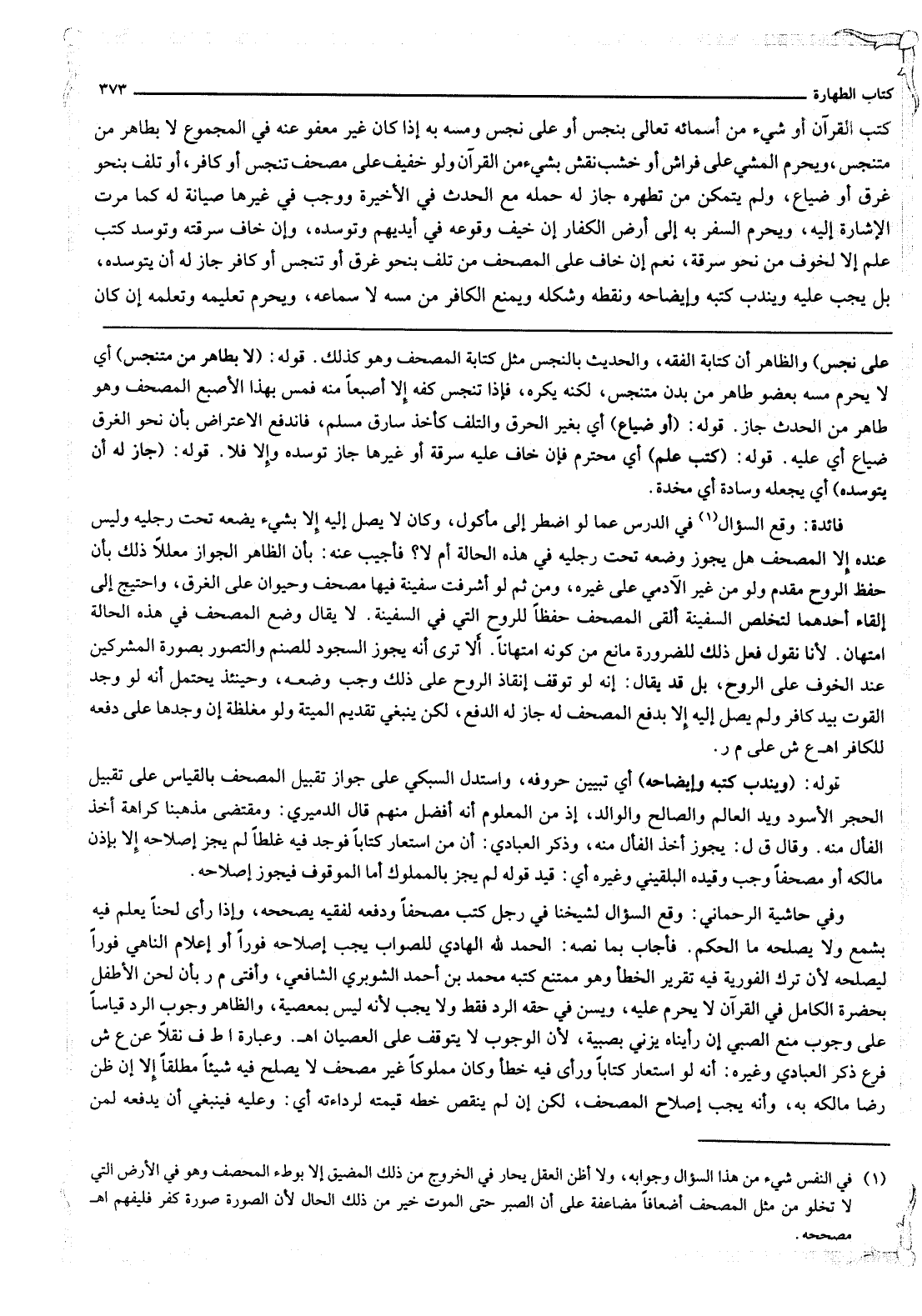 كَتْبُ الْقُرْآنِ أَوْ شَيْءٍ مِنْ أَسْمَائِهِ تَعَالَى بِنَجِسٍ أَوْ عَلَى نَجِس، وَمَسُّهُ بِهِ إذَا كَانَ غَيْرَ مَعْفُوٍّ عَنْهُ فِي الْمَجْمُوعِ لَا بِطَاهِرٍ مِنْ مُتَنَجِّسٍ، وَيَحْرُمُ الْمَشْيُ عَلَى فِرَاشٍ أَوْ خَشَبٍ نُقِشَ بِشَيْءٍ مِنْ الْقُرْآنِ وَلَوْ خِيفَ عَلَى مُصْحَفٍ تَنَجُّسٌ أَوْ كَافِرٌ، أَوْ تَلَفٌ بِنَحْوِ غَرَقٍ أَوْ ضَيَاعٍ، وَلَمْ يَتَمَكَّنْ مِنْ تَطَهُّرِهِ جَازَ لَهُ حَمْلُهُ مَعَ الْحَدَثِ فِي الْأَخِيرَةِ وَوَجَبَ فِي غَيْرِهَا صِيَانَةً لَهُ كَمَا مَرَّتْ الْإِشَارَةُ إلَيْهِ، وَيَحْرُمُ السَّفَرُ بِهِ إلَى أَرْضِ الْكُفَّارِ إنْ خِيفَ وُقُوعُهُ فِي أَيْدِيهِمْ وَتَوَسُّدُهُ، وَإِنْ خَافَ سَرِقَتَهُ وَتَوَسُّدُ كُتُبِ عِلْمٍ إلَّا لِخَوْفٍ مِنْ نَحْوِ سَرِقَةٍ، نَعَمْ إنْ خَافَ عَلَى الْمُصْحَفِ مِنْ تَلَفٍ بِنَحْوِ غَرَقٍ أَوْ تَنَجُّسٍ أَوْ كَافِرٍ جَازَ لَهُ أَنْ يَتَوَسَّدَهُ، بَلْ يَجِبُ عَلَيْهِ وَيُنْدَبُ كَتْبُهُ وَإِيضَاحُهُ وَنَقْطُهُ وَشَكْلُهُ وَيُمْنَعُ الْكَافِرُ مِنْ مَسِّهِ لَا سَمَاعِهِ، وَيَحْرُمُ تَعْلِيمُهُ وَتَعَلُّمُهُ إنْ كَانَ