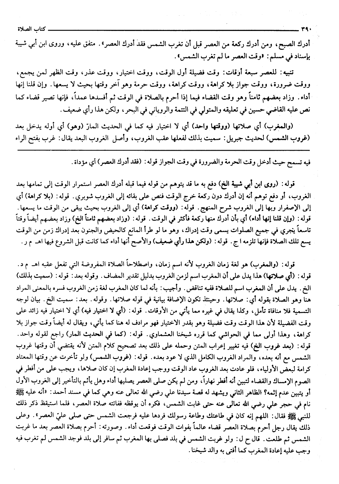 أَدْرَكَ الصُّبْحَ، وَمَنْ أَدْرَكَ رَكْعَةً مِنْ الْعَصْرِ قَبْلَ أَنْ تَغْرُبَ الشَّمْسُ فَقَدْ أَدْرَكَ الْعَصْرَ» . مُتَّفَقٌ عَلَيْهِ، وَرَوَى ابْنُ أَبِي شَيْبَةَ بِإِسْنَادٍ فِي مُسْلِمٍ: «وَقْتُ الْعَصْرِ مَا لَمْ تَغْرُبْ الشَّمْسُ» . تَنْبِيهٌ: لِلْعَصْرِ سَبْعَةُ أَوْقَاتٍ: وَقْتُ فَضِيلَةٍ أَوَّلَ الْوَقْتِ، وَوَقْتُ اخْتِيَارٍ، وَوَقْتُ عُذْرٍ، وَقْتُ الظُّهْرِ لِمَنْ يَجْمَعُ، وَوَقْتُ ضَرُورَةٍ، وَوَقْتُ جَوَازٍ بِلَا كَرَاهَةٍ، وَوَقْتُ كَرَاهَةٍ، وَوَقْتُ حُرْمَةٍ، وَهُوَ آخِرُ وَقْتِهَا بِحَيْثُ لَا يَسَعُهَا. وَإِنْ قُلْنَا إنَّهَا أَدَاءٌ. وَزَادَ بَعْضُهُمْ ثَامِنًا وَهُوَ وَقْتُ الْقَضَاءِ فِيمَا إذَا أَحْرَمَ بِالصَّلَاةِ فِي الْوَقْتِ ثُمَّ أَفْسَدَهَا عَمْدًا، فَإِنَّهَا تَصِيرُ قَضَاءً كَمَا نَصَّ عَلَيْهِ الْقَاضِي حُسَيْنٌ فِي تَعْلِيقِهِ وَالْمُتَوَلِّي فِي التَّتِمَّةِ وَالرُّويَانِيُّ فِي الْبَحْرِ، وَلَكِنَّ هَذَا رَأْيٌ ضَعِيفٌ.