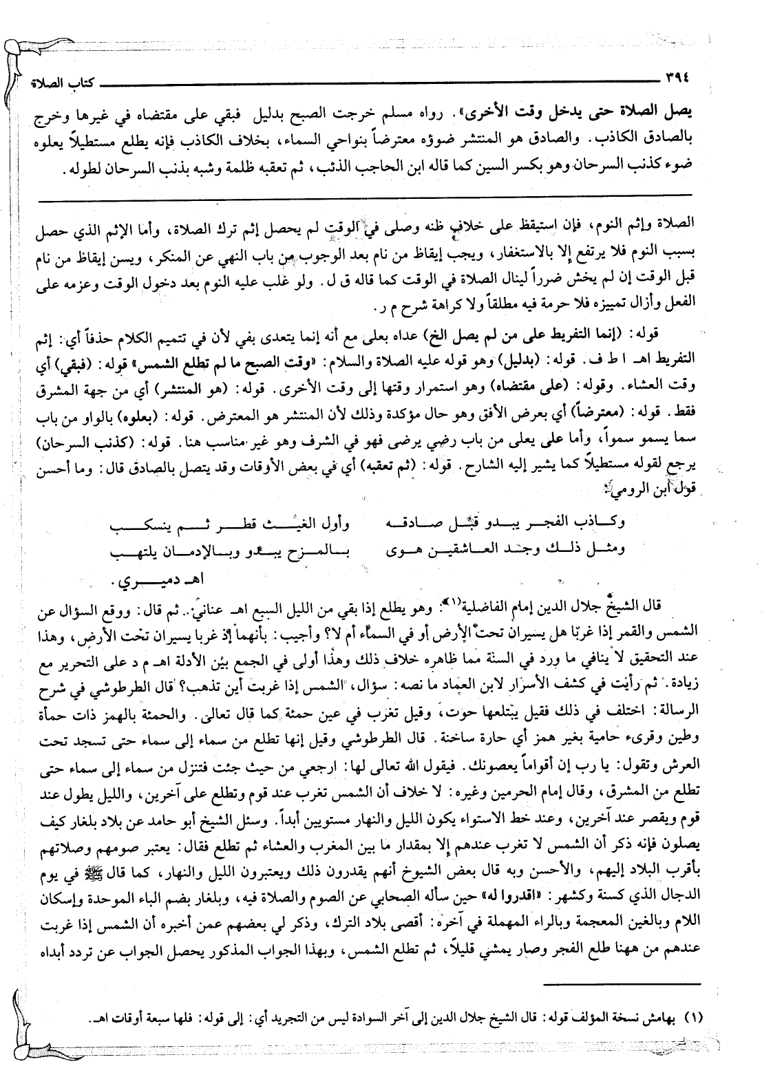 يُصَلِّ الصَّلَاةَ حَتَّى يَدْخُلَ وَقْتُ الْأُخْرَى» . رَوَاهُ مُسْلِمٌ خَرَجَتْ الصُّبْحُ بِدَلِيلِ فَبَقِيَ عَلَى مُقْتَضَاهُ فِي غَيْرِهَا وَخَرَجَ بِالصَّادِقِ الْكَاذِبُ. وَالصَّادِقُ هُوَ الْمُنْتَشِرُ ضَوْءُهُ مُعْتَرِضًا بِنَوَاحِي السَّمَاءِ، بِخِلَافِ الْكَاذِبِ فَإِنَّهُ يَطْلُعُ مُسْتَطِيلًا يَعْلُوهُ ضَوْءٌ كَذَنَبِ السِّرْحَانِ وَهُوَ بِكَسْرِ السِّينِ كَمَا قَالَهُ ابْنُ الْحَاجِبِ الذِّئْبُ، ثُمَّ تَعْقُبُهُ ظُلْمَةٌ وَشُبِّهَ بِذَنَبِ السِّرْحَانِ لِطُولِهِ