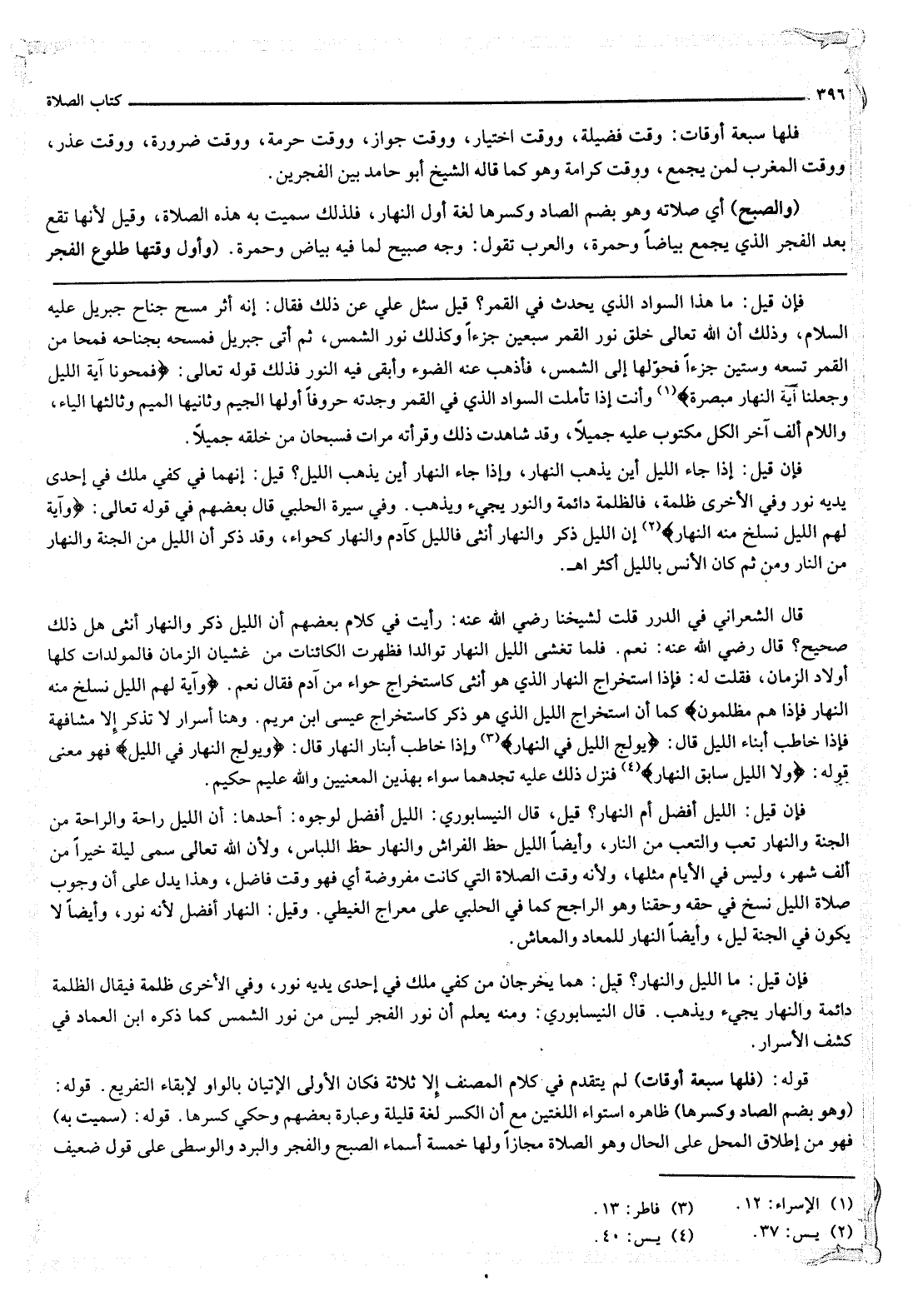 فَإِنْ قِيلَ: اللَّيْلُ أَفْضَلُ أَمْ النَّهَارُ؟ قِيلَ، قَالَ النَّيْسَابُورِيُّ: اللَّيْلُ أَفْضَلُ لِوُجُوهٍ: أَحَدُهَا: أَنَّ اللَّيْلَ رَاحَةٌ وَالرَّاحَةُ مِنْ الْجَنَّةِ وَالنَّهَارَ تَعَبٌ وَالتَّعَبُ مِنْ النَّارِ، وَأَيْضًا اللَّيْلُ حَظُّ الْفِرَاشِ وَالنَّهَارُ حَظُّ اللِّبَاسِ؛ وَلِأَنَّ اللَّهَ تَعَالَى سَمَّى لَيْلَةً خَيْرًا مِنْ أَلْفِ شَهْرٍ، وَلَيْسَ فِي الْأَيَّامِ مِثْلُهَا؛ وَلِأَنَّهُ وَقْتُ الصَّلَاةِ الَّتِي كَانَتْ مَفْرُوضَةً أَيْ فَهُوَ وَقْتٌ فَاضِلٌ، وَهَذَا يَدُلُّ عَلَى أَنَّ وُجُوبَ صَلَاةِ اللَّيْلِ نُسِخَ فِي حَقِّهِ وَحَقِّنَا وَهُوَ الرَّاجِحُ كَمَا فِي الْحَلَبِيِّ عَلَى مِعْرَاجِ الْغَيْطِيِّ. وَقِيلَ: النَّهَارُ أَفْضَلُ؛ لِأَنَّهُ نُورٌ، وَأَيْضًا لَا يَكُونُ فِي الْجَنَّةِ لَيْلٌ، وَأَيْضًا النَّهَارُ لِلْمَعَادِ وَالْمَعَاشِ. فَإِنْ قِيلَ: مَا اللَّيْلُ وَالنَّهَارُ؟ قِيلَ: هُمَا يَخْرُجَانِ مِنْ كَفَّيْ مَلَكٍ فِي إحْدَى يَدَيْهِ نُورٌ، وَفِي الْأُخْرَى ظُلْمَةٌ فَيُقَالُ الظُّلْمَةُ دَائِمَةٌ وَالنَّهَارُ يَجِيءُ وَيَذْهَبُ. قَالَ النَّيْسَابُورِيُّ: وَمِنْهُ يُعْلَمُ أَنَّ نُورَ الْفَجْرِ لَيْسَ مِنْ نُورِ الشَّمْسِ كَمَا ذَكَرَهُ ابْنُ الْعِمَادِ فِي كَشْفِ الْأَسْرَارِ.