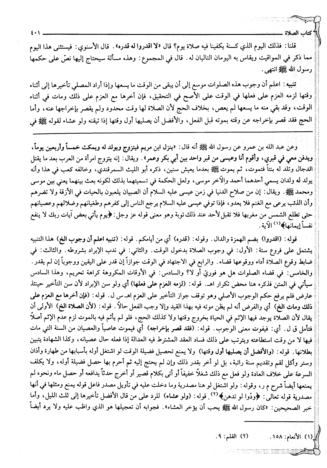 قُلْنَا: فَذَلِكَ الْيَوْمُ الَّذِي كَسَنَةٍ يَكْفِينَا فِيهِ صَلَاةُ يَوْمٍ؟ قَالَ لَا اُقْدُرُوا لَهُ قَدْرَهُ» . قَالَ الْإِسْنَوِيُّ: فَيُسْتَثْنَى هَذَا الْيَوْمُ مِمَّا ذُكِرَ فِي الْمَوَاقِيتِ وَيُقَاسُ بِهِ الْيَوْمَانِ التَّالِيَانِ لَهُ. قَالَ فِي الْمَجْمُوعِ: وَهَذِهِ مَسْأَلَةٌ سَيُحْتَاجُ إلَيْهَا نَصَّ عَلَى حُكْمِهَا رَسُولُ اللَّهِ - صَلَّى اللَّهُ عَلَيْهِ وَسَلَّمَ - انْتَهَى.