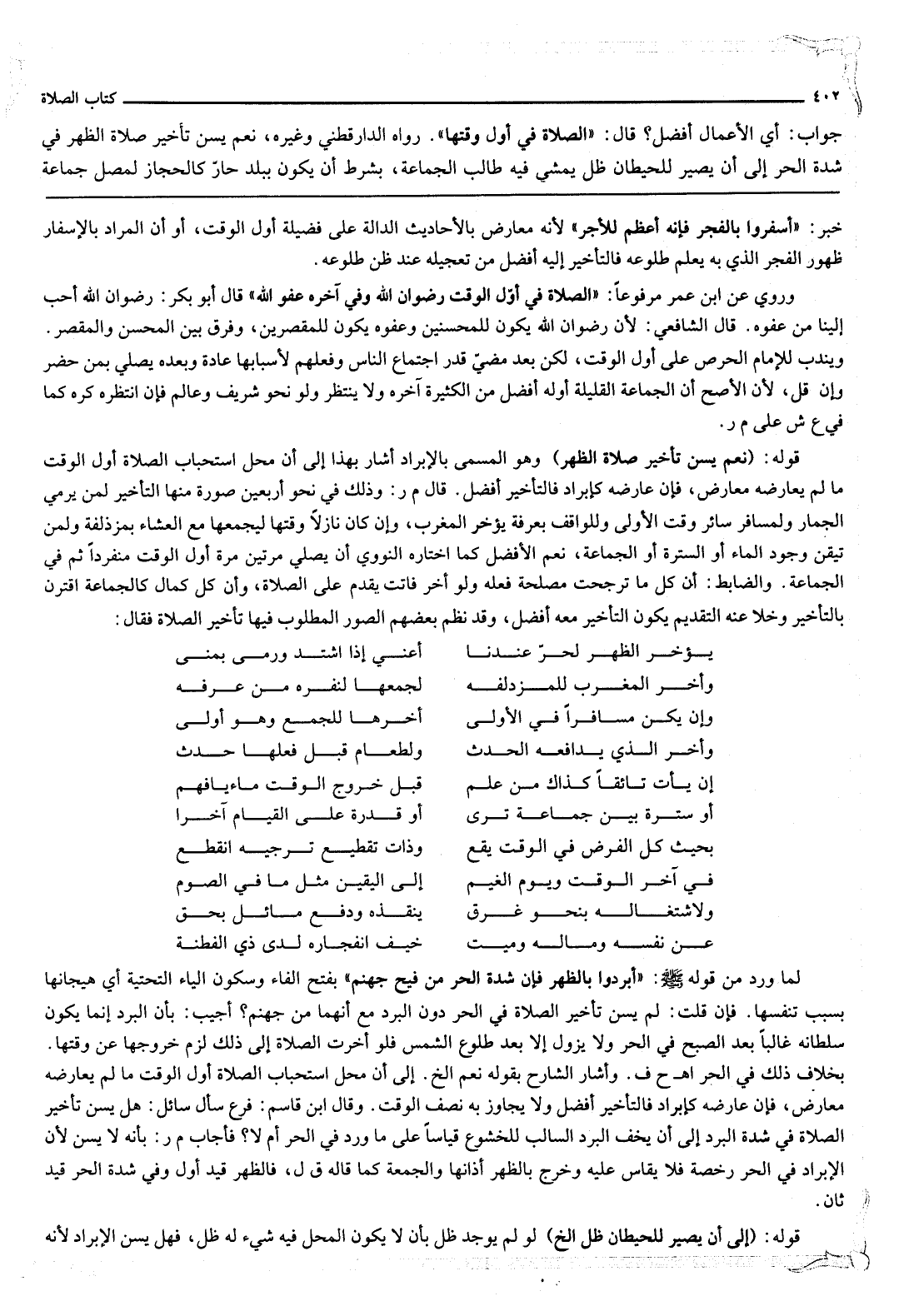 جَوَابِ: «أَيُّ الْأَعْمَالِ أَفْضَلُ؟ قَالَ: الصَّلَاةُ فِي أَوَّلِ وَقْتِهَا» . رَوَاهُ الدَّارَقُطْنِيُّ وَغَيْرُهُ، نَعَمْ يُسَنُّ تَأْخِيرُ صَلَاةِ الظُّهْرِ فِي شِدَّةِ الْحَرِّ إلَى أَنْ يَصِيرَ لِلْحِيطَانِ ظِلٌّ يَمْشِي فِيهِ طَالِبُ الْجَمَاعَةِ، بِشَرْطِ أَنْ يَكُونَ بِبَلَدٍ حَارٍّ كَالْحِجَازِ لِمُصَلٍّ جَمَاعَةً