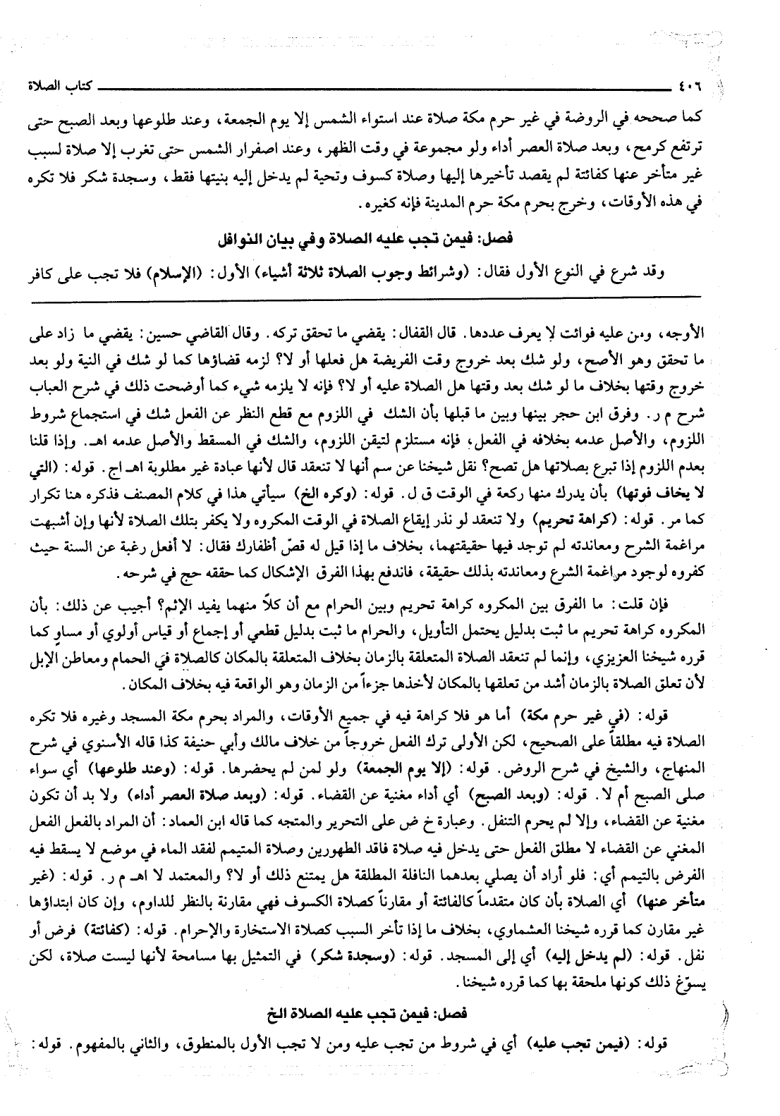 قَوْلُهُ: (وَكُرِهَ إلَخْ) سَيَأْتِي هَذَا فِي كَلَامِ الْمُصَنِّفِ فَذِكْرُهُ هُنَا تَكْرَارٌ كَمَا مَرَّ. قَوْلُهُ: (كَرَاهَةُ تَحْرِيمٍ) وَلَا تَنْعَقِدُ لَوْ نَذَرَ إيقَاعَ الصَّلَاةِ فِي الْوَقْتِ الْمَكْرُوهِ وَلَا يَكْفُرُ بِتِلْكَ الصَّلَاةِ؛ لِأَنَّهَا وَإِنْ أَشْبَهَتْ مُرَاغَمَةَ الشَّرْحِ وَمُعَانَدَتَهُ لَمْ تُوجَدْ فِيهَا حَقِيقَتُهُمَا، بِخِلَافِ مَا إذَا قِيلَ لَهُ قُصَّ أَظْفَارَك فَقَالَ: لَا أَفْعَلُ رَغْبَةً عَنْ السُّنَّةِ حَيْثُ كَفَّرُوهُ لِوُجُودِ مُرَاغَمَةِ الشَّرْعِ وَمُعَانَدَتِهِ بِذَلِكَ حَقِيقَةً، فَانْدَفَعَ بِهَذَا الْفَرْقِ الْإِشْكَالُ كَمَا حَقَّقَهُ حَجّ فِي شَرْحِهِ.