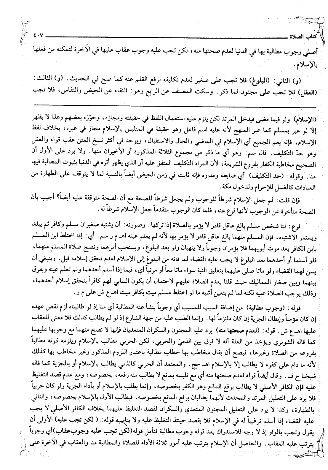 ـــــــــــــــــــــــــــــQالْإِسْلَامُ) وَلَوْ فِيمَا مَضَى فَيَدْخُلُ الْمُرْتَدُّ لَكِنْ يَلْزَمُ عَلَيْهِ اسْتِعْمَالُ اللَّفْظِ فِي حَقِيقَتِهِ وَمَجَازِهِ، وَجَوَّزَهُ بَعْضُهُمْ وَهَذَا لَا يَظْهَرُ إلَّا لَوْ عَبَّرَ بِمُسْلِمٍ كَمَا عَبَّرَ الْمَنْهَجُ؛ لِأَنَّهُ عَلَيْهِ اسْمُ فَاعِلٍ وَهُوَ حَقِيقَةٌ فِي الْمُتَلَبِّسِ بِالْإِسْلَامِ مَجَازٌ فِي غَيْرِهِ، بِخِلَافِ لَفْظِ الْإِسْلَامِ، فَإِنَّهُ يَعُمُّ الْجَمِيعَ أَيْ الْإِسْلَامَ فِي الْمَاضِي وَالْحَالِ وَالِاسْتِقْبَالِ، وَيُوجَدُ فِي أَكْثَرِ نُسَخِ الْمَتْنِ عَقِبَ قَوْلِهِ وَالْعَقْلُ وَهُوَ حَدُّ التَّكْلِيفِ. قَالَ سم: وَهُوَ أَيْ مَا ذَكَرَ مِنْ مَجْمُوعِ الثَّلَاثَةِ الْمَذْكُورَةِ أَوْ الْأَخِيرَانِ مِنْهَا. وَلَا يُرَدُّ عَلَى الْأَوَّلِ أَنَّ الصَّحِيحَ مُخَاطَبَةُ الْكُفَّارِ بِفُرُوعِ الشَّرِيعَةِ؛ لِأَنَّ الْمُرَادَ التَّكْلِيفُ الْمُتَّفَقُ عَلَيْهِ أَوْ الَّذِي يَظْهَرُ أَثَرُهُ فِي الدُّنْيَا بِثُبُوتِ الْمُطَالَبَةِ فِيهَا مِنَّا. وَقَوْلُهُ: (حَدُّ التَّكْلِيفِ) أَيْ ضَابِطُهُ وَمَدَارُهُ فَإِنَّهُ ثَابِتٌ فِي زَمَنِ الْحَيْضِ أَيْضًا بِالنِّسْبَةِ لِمَا لَا يَتَوَقَّفُ عَلَى الطَّهَارَةِ مِنْ الْعِبَادَاتِ كَالْغُسْلِ لِلْإِحْرَامِ وَلِدُخُولِ مَكَّةَ.