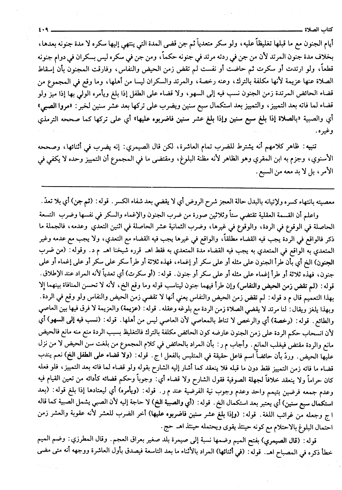 قَوْلُهُ: «وَإِذَا بَلَغَ عَشْرَ سِنِينَ فَاضْرِبُوهُ عَلَيْهَا» ) أَخَّرَ الضَّرْبَ لِلْعَشْرِ؛ لِأَنَّهُ عُقُوبَةٌ وَالْعَشْرُ زَمَنُ احْتِمَالِ الْبُلُوغِ بِالِاحْتِلَامِ مَعَ كَوْنِهِ حِينَئِذٍ يَقْوَى وَيَحْتَمِلُهُ حِينَئِذٍ. اهـ. حَجّ.