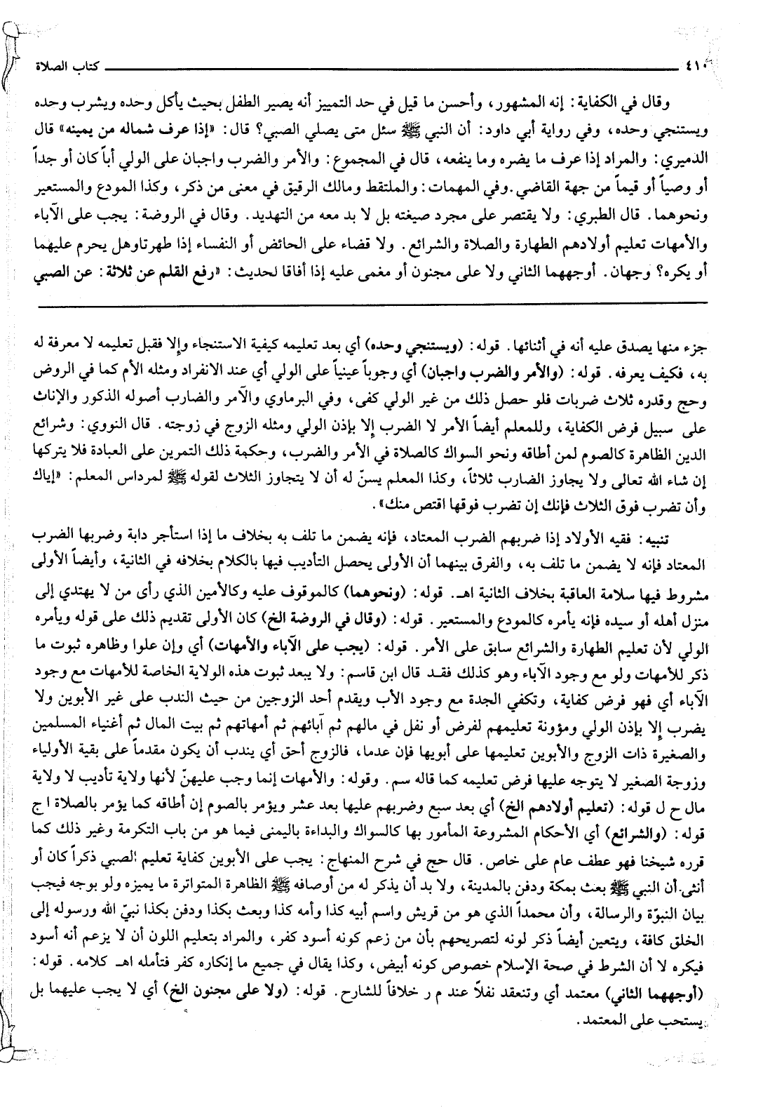وَقَالَ فِي الْكِفَايَةِ: إنَّهُ الْمَشْهُورُ، وَأَحْسَنُ مَا قِيلَ فِي حَدِّ التَّمْيِيزِ أَنَّهُ يَصِيرُ الطِّفْلُ بِحَيْثُ يَأْكُلُ وَحْدَهُ وَيَشْرَبُ وَحْدَهُ وَيَسْتَنْجِي وَحْدَهُ، وَفِي رِوَايَةٍ أَبِي دَاوُد: «أَنَّ النَّبِيَّ - صَلَّى اللَّهُ عَلَيْهِ وَسَلَّمَ - سُئِلَ مَتَى يُصَلِّي الصَّبِيُّ؟ قَالَ: إذَا عَرَفَ شِمَالَهُ مِنْ يَمِينِهِ» قَالَ الدَّمِيرِيُّ: وَالْمُرَادُ إذَا عَرَفَ مَا يَضُرُّهُ وَمَا يَنْفَعُهُ، قَالَ فِي الْمَجْمُوعِ: وَالْأَمْرُ وَالضَّرْبُ وَاجِبَانِ عَلَى الْوَلِيِّ أَبًا كَانَ أَوْ جَدًّا أَوْ وَصِيًّا أَوْ قَيِّمًا مِنْ جِهَةِ الْقَاضِي. وَفِي الْمُهِمَّاتِ: وَالْمُلْتَقِطُ وَمَالِكُ الرَّقِيقِ فِي مَعْنَى مَنْ ذُكِرَ، وَكَذَا الْمُودَعُ وَالْمُسْتَعِيرُ وَنَحْوُهُمَا. قَالَ الطَّبَرِيُّ: وَلَا يَقْتَصِرُ عَلَى مُجَرَّدِ صِيغَتِهِ بَلْ لَا بُدَّ مَعَهُ مِنْ التَّهْدِيدِ. وَقَالَ فِي الرَّوْضَةِ: يَجِبُ عَلَى الْآبَاءِ وَالْأُمَّهَاتِ تَعْلِيمُ أَوْلَادِهِمْ الطَّهَارَةَ وَالصَّلَاةَ وَالشَّرَائِعَ.