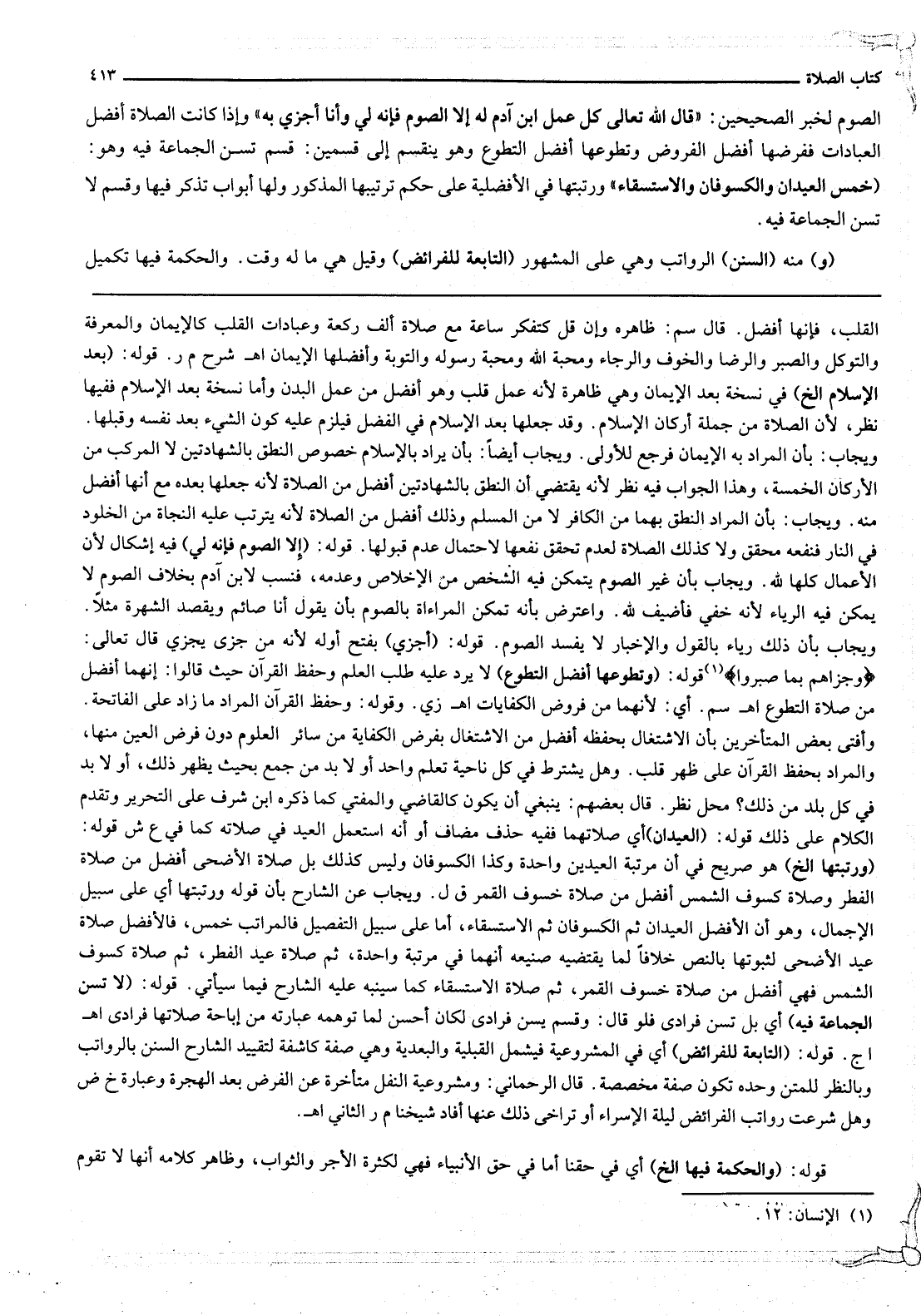 وَيُجَابُ: بِأَنَّ الْمُرَادَ بِهِ الْإِيمَانُ فَرَجَعَ لِلْأُولَى. وَيُجَابُ أَيْضًا: بِأَنْ يُرَادَ بِالْإِسْلَامِ خُصُوصُ النُّطْقِ بِالشَّهَادَتَيْنِ لَا الْمُرَكَّبُ مِنْ الْأَرْكَانِ الْخَمْسَةِ، وَهَذَا الْجَوَابُ فِيهِ نَظَرٌ؛ لِأَنَّهُ يَقْتَضِي أَنَّ النُّطْقَ بِالشَّهَادَتَيْنِ أَفْضَلُ مِنْ الصَّلَاةِ؛ لِأَنَّهُ جَعَلَهَا بَعْدَهُ مَعَ أَنَّهَا أَفْضَلُ مِنْهُ. وَيُجَابُ: بِأَنَّ الْمُرَادَ النُّطْقُ بِهِمَا مِنْ الْكَافِرِ لَا مِنْ الْمُسْلِمِ وَذَلِكَ أَفْضَلُ مِنْ الصَّلَاةِ؛ لِأَنَّهُ يَتَرَتَّبُ عَلَيْهِ النَّجَاةُ مِنْ الْخُلُودِ فِي النَّارِ فَنَفْعُهُ مُحَقَّقٌ وَلَا كَذَلِكَ الصَّلَاةُ لِعَدَمِ تَحَقُّقِ نَفْعِهَا لِاحْتِمَالِ عَدَمِ قَبُولِهَا. قَوْلُهُ: «إلَّا الصَّوْمَ فَإِنَّهُ لِي» ) فِيهِ إشْكَالٌ؛ لِأَنَّ الْأَعْمَالَ كُلَّهَا لِلَّهِ. وَيُجَابُ بِأَنَّ غَيْرَ الصَّوْمِ يَتَمَكَّنُ فِيهِ الشَّخْصُ مِنْ الْإِخْلَاصِ وَعَدَمِهِ، فَنُسِبَ لِابْنِ آدَمَ بِخِلَافِ الصَّوْمِ لَا يُمْكِنُ فِيهِ الرِّيَاءُ؛ لِأَنَّهُ خَفِيٌّ فَأُضِيفَ لِلَّهِ. وَاعْتُرِضَ بِأَنَّهُ تُمْكِنُ الْمُرَاءَاةُ بِالصَّوْمِ بِأَنْ يَقُولَ أَنَا صَائِمٌ وَيَقْصِدُ الشُّهْرَةَ مَثَلًا. وَيُجَابُ بِأَنَّ ذَلِكَ رِيَاءٌ بِالْقَوْلِ وَالْإِخْبَارُ لَا يُفْسِدُ الصَّوْمَ. قَوْلُهُ: «أَجْزِي» ) بِفَتْحِ أَوَّلِهِ؛ لِأَنَّهُ مِنْ جَزَى يَجْزِي قَالَ تَعَالَى: {وَجَزَاهُمْ بِمَا صَبَرُوا} [الإنسان: 12] قَوْلُهُ: (وَتَطَوُّعُهَا أَفْضَلُ التَّطَوُّعِ) لَا يَرِدُ عَلَيْهِ طَلَبُ الْعِلْمِ وَحِفْظُ الْقُرْآنِ حَيْثُ قَالُوا: إنَّهُمَا أَفْضَلُ مِنْ صَلَاةِ التَّطَوُّعِ. اهـ. سم. أَيْ: لِأَنَّهُمَا مِنْ فُرُوضِ الْكِفَايَاتِ. اهـ. ز ي. وَقَوْلُهُ: وَحِفْظُ الْقُرْآنِ الْمُرَادُ مَا زَادَ عَلَى الْفَاتِحَةِ. وَأَفْتَى بَعْضُ الْمُتَأَخِّرِينَ بِأَنَّ الِاشْتِغَالَ بِحِفْظِهِ أَفْضَلُ مِنْ الِاشْتِغَالِ بِفَرْضِ الْكِفَايَةِ مِنْ سَائِرِ الْعُلُومِ دُونَ فَرْضِ الْعَيْنِ مِنْهَا، وَالْمُرَادُ بِحِفْظِ الْقُرْآنِ عَلَى ظَهْرِ قَلْبٍ. وَهَلْ يُشْتَرَطُ فِي كُلِّ نَاحِيَةٍ تَعَلُّمُ وَاحِدٍ أَوْ لَا بُدَّ مِنْ جَمْعٍ بِحَيْثُ يَظْهَرُ ذَلِكَ، أَوْ لَا بُدَّ فِي كُلِّ بَلَدٍ مِنْ ذَلِكَ؟ مَحَلُّ نَظَرٍ. قَالَ بَعْضُهُمْ: يَنْبَغِي أَنْ يَكُونَ كَالْقَاضِي وَالْمُفْتِي كَمَا ذَكَرَهُ ابْنُ شَرَفٍ عَلَى التَّحْرِيرِ وَتَقَدَّمَ الْكَلَامُ عَلَى ذَلِكَ قَوْلُهُ: (الْعِيدَانِ) أَيْ صَلَاتُهُمَا فَفِيهِ حَذْفٌ مُضَافٌ أَوْ أَنَّهُ اسْتَعْمَلَ الْعِيدَ فِي صَلَاتِهِ كَمَا فِي ش قَوْلُهُ: (وَرُتْبَتُهَا إلَخْ) هُوَ صَرِيحٌ فِي أَنَّ مَرْتَبَةَ الْعِيدَيْنِ وَاحِدَةٌ وَكَذَا الْكُسُوفَانِ، وَلَيْسَ كَذَلِكَ بَلْ صَلَاةُ الْأَضْحَى أَفْضَلُ مِنْ صَلَاةِ الْفِطْرِ وَصَلَاةُ كُسُوفِ الشَّمْسِ أَفْضَلُ مِنْ صَلَاةِ خُسُوفِ الْقَمَرِ ق ل. وَيُجَابُ عَنْ الشَّارِحِ بِأَنَّ قَوْلَهُ وَرُتْبَتُهَا أَيْ عَلَى سَبِيلِ الْإِجْمَالِ، وَهُوَ أَنَّ الْأَفْضَلَ الْعِيدَانِ ثُمَّ الْكُسُوفَانِ ثُمَّ الِاسْتِسْقَاءُ، أَمَّا عَلَى سَبِيلِ التَّفْصِيلِ فَالْمَرَاتِبُ خَمْسٌ، فَالْأَفْضَلُ صَلَاةُ عِيدِ الْأَضْحَى لِثُبُوتِهَا بِالنَّصِّ خِلَافًا لِمَا يَقْتَضِيهِ صَنِيعُهُ أَنَّهُمَا فِي مَرْتَبَةٍ وَاحِدَةٍ، ثُمَّ صَلَاةُ عِيدِ الْفِطْرِ، ثُمَّ صَلَاةُ كُسُوفِ الشَّمْسِ فَهِيَ أَفْضَلُ مِنْ صَلَاةِ خُسُوفِ الْقَمَرِ، ثُمَّ صَلَاةُ الِاسْتِسْقَاءِ كَمَا سَيُنَبِّهُ عَلَيْهِ الشَّارِحُ فِيمَا سَيَأْتِي.