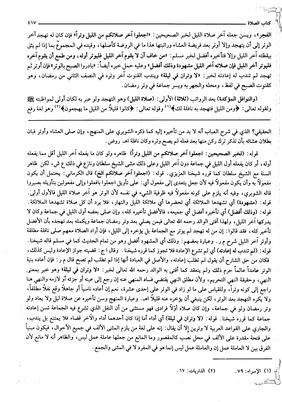 قَوْلُهُ: (لِخَبَرِ الصَّحِيحَيْنِ: اجْعَلُوا آخِرِ صَلَاتِكُمْ مِنْ اللَّيْلِ وِتْرًا) ظَاهِرُهُ وَلَوْ كَانَ مَا يَفْعَلُهُ آخِرَ اللَّيْلِ أَقَلَّ مِمَّا يَفْعَلُهُ أَوَّلَهُ، أَوْ كَانَ يَفْعَلُهُ أَوَّلَ اللَّيْلِ فِي جَمَاعَةٍ دُونَ آخِرِ اللَّيْلِ وَعَلَى ذَلِكَ مَشَى الشَّيْخُ سُلْطَانُ وَنَازَعَ فِي ذَلِكَ ع ش، لَكِنْ ظَاهِرُ السُّنَّةِ مَعَ الشَّيْخِ سُلْطَانَ كَمَا قَرَّرَهُ شَيْخُنَا الْعَزِيزِيُّ.