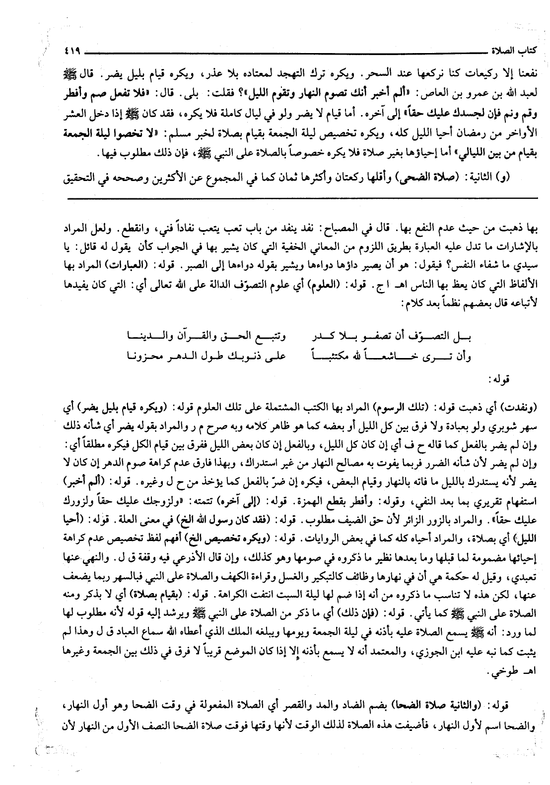 قَوْلُهُ: (وَنَفِدَتْ) أَيْ ذَهَبَتْ قَوْلُهُ: (تِلْكَ الرُّسُومُ) الْمُرَادُ بِهَا الْكُتُبُ الْمُشْتَمِلَةُ عَلَى تِلْكَ الْعُلُومِ قَوْلُهُ: (وَيُكْرَهُ قِيَامٌ بِلَيْلٍ يَضُرُّ) أَيْ سَهَرٌ شَوْبَرِيٌّ وَلَوْ بِعِبَادَةٍ وَلَا فَرْقَ بَيْنَ كُلِّ اللَّيْلِ أَوْ بَعْضِهِ كَمَا هُوَ ظَاهِرُ كَلَامِهِ وَبِهِ صَرَّحَ م ر وَالْمُرَادُ بِقَوْلِهِ يَضُرُّ أَيْ شَأْنُهُ ذَلِكَ، وَإِنْ لَمْ يَضُرَّ بِالْفِعْلِ كَمَا قَالَهُ ح ف أَيْ إنْ كَانَ كُلُّ اللَّيْلِ، وَبِالْفِعْلِ إنْ كَانَ بَعْضُ اللَّيْلِ فَفَرَّقَ بَيْنَ قِيَامِ الْكُلِّ فَيُكْرَهُ مُطْلَقًا أَيْ: وَإِنْ لَمْ يَضُرَّ؛ لِأَنَّ شَأْنَهُ الضَّرَرُ فَرُبَّمَا يَفُوتُ بِهِ مَصَالِحُ النَّهَارِ مِنْ غَيْرِ اسْتِدْرَاكٍ، وَبِهَذَا فَارَقَ عَدَمَ كَرَاهَةِ صَوْمِ الدَّهْرِ إنْ كَانَ لَا يَضُرُّ؛ لِأَنَّهُ يَسْتَدْرِكُ بِاللَّيْلِ مَا فَاتَهُ بِالنَّهَارِ وَقِيَامُ الْبَعْضِ، فَيُكْرَهُ إنْ ضَرَّ بِالْفِعْلِ كَمَا يُؤْخَذُ مِنْ ح ل وَغَيْرِهِ.