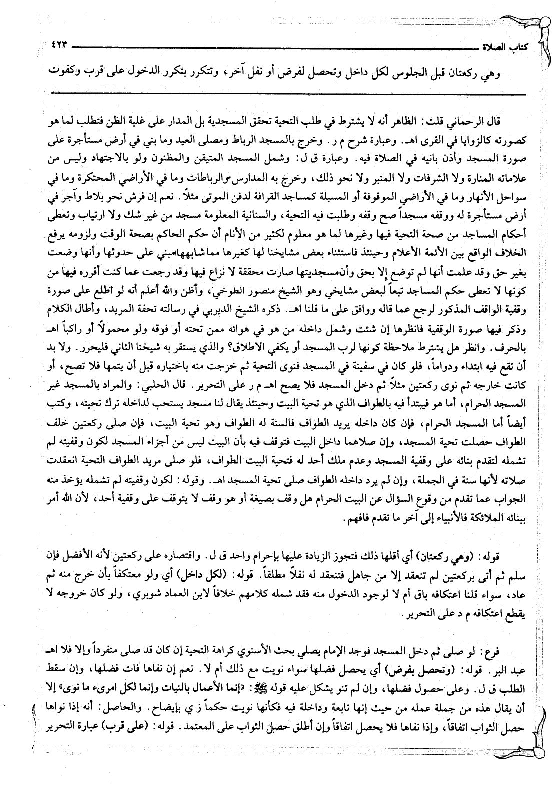 ـــــــــــــــــــــــــــــQقَالَ الرَّحْمَانِيُّ قُلْت: الظَّاهِرُ أَنَّهُ لَا يُشْتَرَطُ فِي طَلَبِ التَّحِيَّةِ تَحَقُّقُ الْمَسْجِدِيَّةِ بَلْ الْمَدَارُ عَلَى غَلَبَةِ الظَّنِّ فَتُطْلَبُ لِمَا هُوَ كَصُورَتِهِ كَالزَّوَايَا فِي الْقُرَى اهـ. وَعِبَارَةُ شَرْحِ م ر. وَخَرَجَ بِالْمَسْجِدِ الرِّبَاطُ وَمُصَلَّى الْعِيدِ وَمَا بُنِيَ فِي أَرْضٍ مُسْتَأْجَرَةٍ عَلَى صُورَةِ الْمَسْجِدِ وَأَذِنَ بَانِيهِ فِي الصَّلَاةِ فِيهِ. وَعِبَارَةُ ق ل: وَشَمِلَ الْمَسْجِدُ الْمُتَيَقَّنَ وَالْمَظْنُونَ وَلَوْ بِالِاجْتِهَادِ وَلَيْسَ مِنْ عَلَامَاتِهِ الْمَنَارَةُ وَلَا الشُّرُفَاتُ وَلَا الْمِنْبَرُ وَلَا نَحْوَ ذَلِكَ، وَخَرَجَ بِهِ الْمَدَارِسُ وَالرِّبَاطَاتُ وَمَا فِي الْأَرَاضِيِ الْمُحْتَكَرَةِ وَمَا فِي سَوَاحِلِ الْأَنْهَارِ وَمَا فِي الْأَرَاضِيِ الْمَوْقُوفَةِ أَوْ الْمُسَبَّلَةِ كَمَسَاجِدِ الْقَرَافَةِ لِدَفْنِ الْمَوْتَى مَثَلًا. نَعَمْ إنْ فَرَشَ نَحْوَ بَلَاطٍ وَآجُرٍّ فِي أَرْضٍ مُسْتَأْجَرَةٍ لَهُ وَوَقَفَهُ مَسْجِدًا صَحَّ وَقْفُهُ وَطُلِبَتْ فِيهِ التَّحِيَّةُ، والسُّنَانِيَّةُ الْمَعْلُومَةُ مَسْجِدٌ مِنْ غَيْرِ شَكٍّ وَلَا ارْتِيَابٍ وَتُعْطَى أَحْكَامَ الْمَسَاجِدِ مِنْ صِحَّةِ التَّحِيَّةِ فِيهَا وَغَيْرِهَا لِمَا هُوَ مَعْلُومٌ لِكَثِيرٍ مِنْ الْأَنَامِ أَنَّ حُكْمَ الْحَاكِمِ بِصِحَّةِ الْوَقْتِ وَلُزُومِهِ يَرْفَعُ الْخِلَافَ الْوَاقِعَ بَيْنَ الْأَئِمَّةِ الْأَعْلَامِ وَحِينَئِذٍ فَاسْتِثْنَاءُ بَعْضِ مَشَايِخِنَا لَهَا كَغَيْرِهَا مِمَّا شَابَهَهَا مَبْنِيٌّ عَلَى حُدُوثِهَا وَأَنَّهَا وُضِعَتْ بِغَيْرِ حَقٍّ وَقَدْ عَلِمْتُ أَنَّهَا لَمْ تُوضَعْ إلَّا بِحَقٍّ وَأَنَّ مَسْجِدِيَّتَهَا صَارَتْ مُحَقَّقَةً لَا نِزَاعَ فِيهَا وَقَدْ رَجَعْتُ عَمَّا كُنْتُ أُقَرِّرُهُ فِيهَا مِنْ كَوْنِهَا لَا تُعْطَى حُكْمَ الْمَسَاجِدِ تَبَعًا لِبَعْضِ مَشَايِخِي وَهُوَ الشَّيْخُ مَنْصُورٌ الطُّوخِيُّ