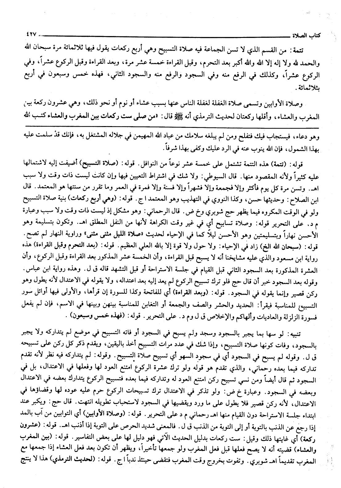 تَتِمَّةٌ: مِنْ الْقِسْمِ الَّذِي لَا تُسَنُّ الْجَمَاعَةُ فِيهِ صَلَاةُ التَّسْبِيحِ وَهِيَ أَرْبَعُ رَكَعَاتٍ يَقُولُ فِيهَا ثَلَاثمِائَةِ مَرَّةٍ سُبْحَانَ اللَّهِ وَالْحَمْدُ لِلَّهِ وَلَا إلَهَ إلَّا اللَّهُ وَاَللَّهُ أَكْبَرُ بَعْدَ التَّحَرُّمِ، وَقَبْلَ الْقِرَاءَةِ خَمْسَةَ عَشَرَ مَرَّةً، وَبَعْدَ الْقِرَاءَةِ وَقَبْلَ الرُّكُوعِ عَشْرًا، وَفِي الرُّكُوعِ عَشْرًا، وَكَذَلِكَ فِي الرَّفْعِ مِنْهُ وَفِي السُّجُودِ وَالرَّفْعِ مِنْهُ وَالسُّجُودِ الثَّانِي، فَهَذِهِ خَمْسٌ وَسَبْعُونَ فِي أَرْبَعٍ بِثَلَاثِمِائَةٍ.