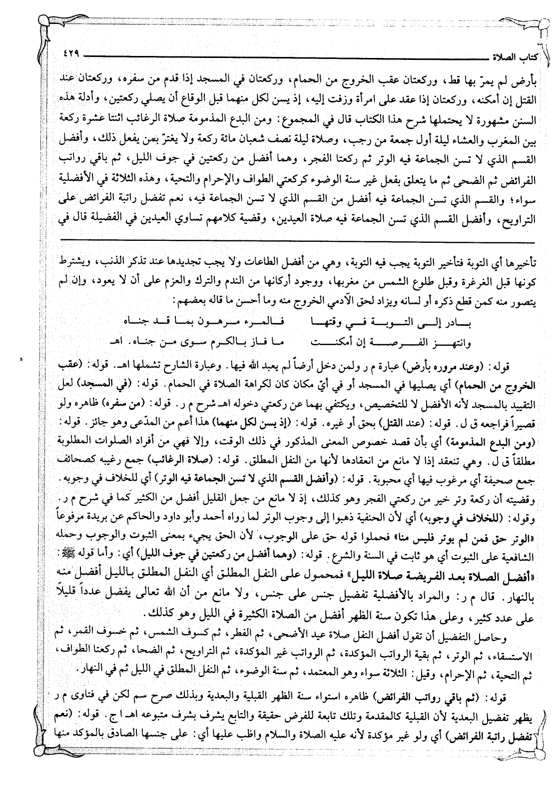 وَأَفْضَلُ الْقِسْمِ الَّذِي لَا تُسَنُّ الْجَمَاعَةُ فِيهِ الْوِتْرُ ثُمَّ رَكْعَتَا الْفَجْرِ، وَهُمَا أَفْضَلُ مِنْ رَكْعَتَيْنِ فِي جَوْفِ اللَّيْلِ، ثُمَّ بَاقِي رَوَاتِبِ الْفَرَائِضِ ثُمَّ الضُّحَى ثُمَّ مَا يَتَعَلَّقُ بِفِعْلٍ غَيْرِ سُنَّةِ الْوُضُوءِ كَرَكْعَتَيْ الطَّوَافِ وَالْإِحْرَامِ وَالتَّحِيَّةِ، وَهَذِهِ الثَّلَاثَةُ فِي الْأَفْضَلِيَّةِ سَوَاءٌ؛ وَالْقِسْمُ الَّذِي تُسَنُّ الْجَمَاعَةُ فِيهِ أَفْضَلُ مِنْ الْقِسْمِ الَّذِي لَا تُسَنُّ الْجَمَاعَةُ فِيهِ، نَعَمْ تَفْضُلُ رَاتِبَةُ الْفَرَائِضِ عَلَى التَّرَاوِيحِ، وَأَفْضَلُ الْقِسْمِ الَّذِي تُسَنُّ الْجَمَاعَةُ فِيهِ صَلَاةُ الْعِيدَيْنِ، وَقَضِيَّةُ كَلَامِهِمْ تُسَاوِي الْعِيدَيْنِ فِي الْفَضِيلَةِ قَالَ فِي