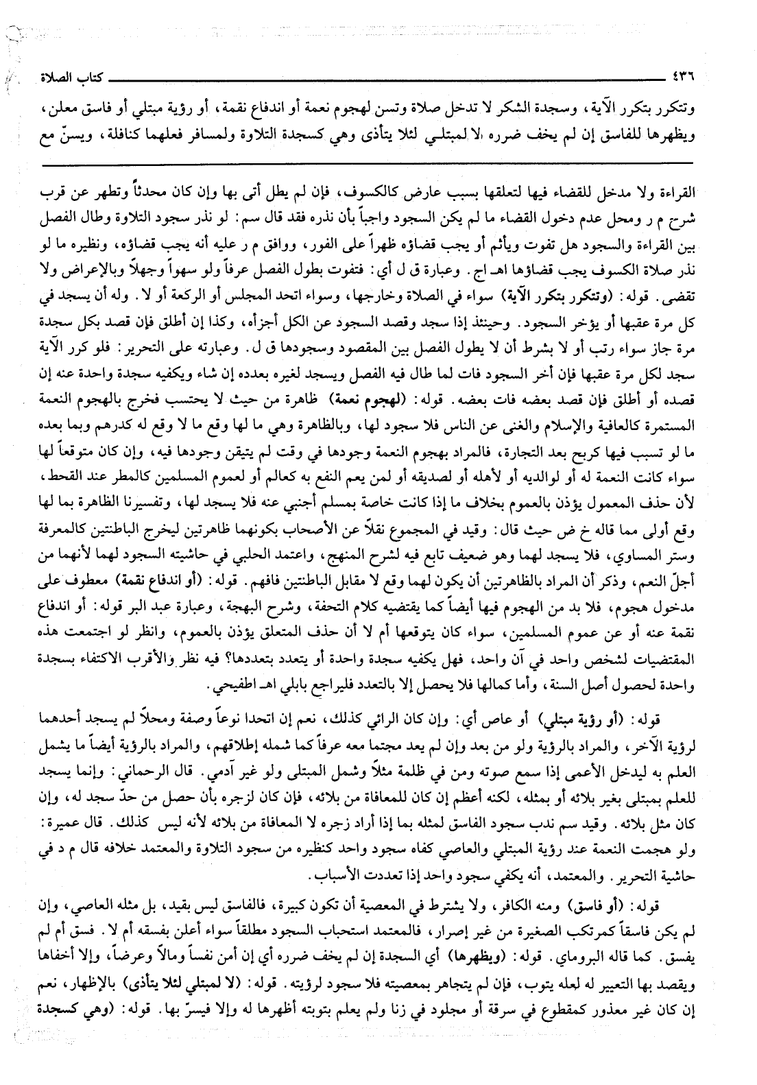 قَوْلُهُ: (أَوْ رُؤْيَةُ مُبْتَلًى) أَوْ عَاصٍ أَيْ: وَإِنْ كَانَ الرَّائِي كَذَلِكَ، نَعَمْ إنْ اتَّحَدَا نَوْعًا وَصِفَةً وَمَحَلًّا لَمْ يَسْجُدْ أَحَدُهُمَا لِرُؤْيَةِ الْآخَرِ، وَالْمُرَادُ بِالرُّؤْيَةِ وَلَوْ مِنْ بُعْدٍ وَإِنْ لَمْ يُعَدَّ مُجْتَمِعًا مَعَهُ عُرْفًا كَمَا شَمِلَهُ إطْلَاقُهُمْ، وَالْمُرَادُ بِالرُّؤْيَةِ أَيْضًا مَا يَشْمَلُ الْعِلْمَ بِهِ لِيَدْخُلَ الْأَعْمَى إذَا سَمِعَ صَوْتَهُ وَمَنْ فِي ظُلْمَةٍ مَثَلًا وَشَمِلَ الْمُبْتَلَى وَلَوْ غَيْرَ آدَمِيٍّ. قَالَ الرَّحْمَانِيُّ: وَإِنَّمَا يَسْجُدُ لِلْعِلْمِ بِمُبْتَلًى بِغَيْرِ بَلَائِهِ أَوْ بِمِثْلِهِ، لَكِنَّهُ أَعْظَمُ إنْ كَانَ لِلْمُعَافَاةِ مِنْ بَلَائِهِ، فَإِنْ كَانَ لِزَجْرِهِ بِأَنْ حَصَلَ مِنْ حَدٍّ سَجَدَ لَهُ، وَإِنْ كَانَ مِثْلَ بَلَائِهِ. وَقَيَّدَ سم نَدْبَ سُجُودِ الْفَاسِقِ لِمِثْلِهِ بِمَا إذَا أَرَادَ زَجْرَهُ لَا الْمُعَافَاةَ مِنْ بَلَائِهِ؛ لِأَنَّهُ لَيْسَ كَذَلِكَ. قَالَ عَمِيرَةُ: وَلَوْ هَجَمَتْ النِّعْمَةُ عِنْدَ رُؤْيَةِ الْمُبْتَلَى وَالْعَاصِي كَفَاهُ سُجُودُ وَاحِدٍ كَنَظِيرِهِ مِنْ سُجُودِ التِّلَاوَةِ وَالْمُعْتَمَدُ خِلَافُهُ قَالَ م د فِي حَاشِيَةِ التَّحْرِيرِ. وَالْمُعْتَمَدُ، أَنَّهُ يَكْفِي سُجُودٌ وَاحِدٌ إذَا تَعَدَّدَتْ الْأَسْبَابُ.