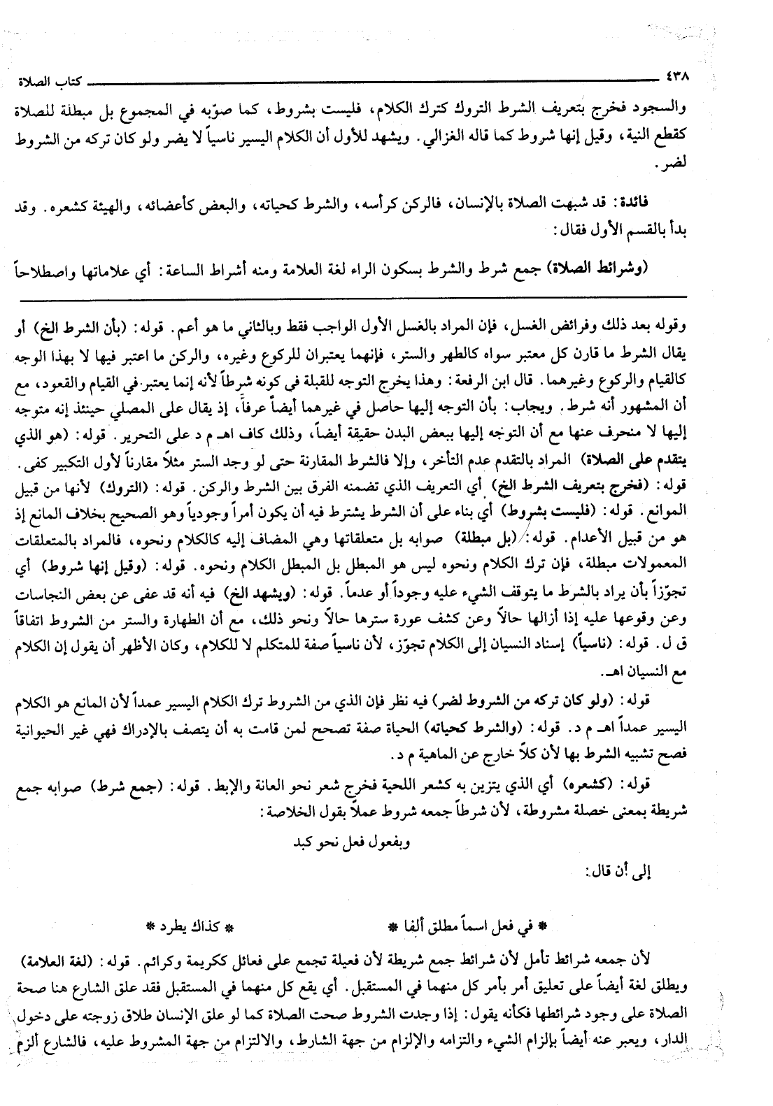 وَالسُّجُودِ فَخَرَجَ بِتَعْرِيفِ الشَّرْطِ التَّرْكُ كَتَرْكِ الْكَلَامِ، فَلَيْسَتْ بِشُرُوطٍ، كَمَا صَوَّبَهُ فِي الْمَجْمُوعِ بَلْ مُبْطِلَةٌ لِلصَّلَاةِ كَقَطْعِ النِّيَّةِ، وَقِيلَ إنَّهَا شُرُوطٌ كَمَا قَالَهُ الْغَزَالِيُّ. وَيَشْهَدُ لِلْأَوَّلِ أَنَّ الْكَلَامَ الْيَسِيرَ نَاسِيًا لَا يَضُرُّ وَلَوْ كَانَ تَرْكُهُ مِنْ الشُّرُوطِ لَضَرَّ. فَائِدَةٌ: قَدْ شُبِّهَتْ الصَّلَاةُ بِالْإِنْسَانِ، فَالرُّكْنُ كَرَأْسِهِ، وَالشَّرْطُ كَحَيَاتِهِ، وَالْبَعْضُ كَأَعْضَائِهِ، وَالْهَيْئَةُ كَشَعْرِهِ. وَقَدْ بَدَأَ بِالْقِسْمِ الْأَوَّلِ فَقَالَ: (وَشَرَائِطُ الصَّلَاةِ) جَمْعُ شَرْطٍ وَالشَّرْطُ بِسُكُونِ الرَّاءِ لُغَةً الْعَلَّامَةُ وَمِنْهُ أَشْرَاطُ السَّاعَةِ أَيْ عَلَامَاتُهَا وَاصْطِلَاحًا