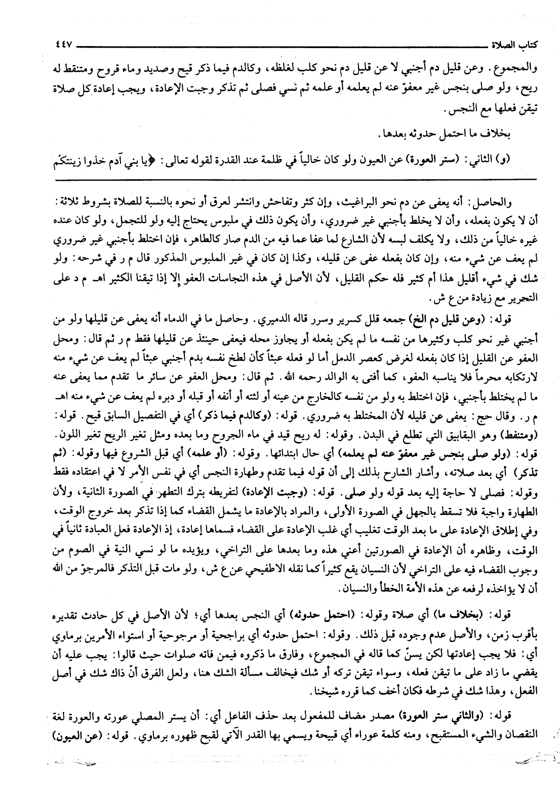 ـــــــــــــــــــــــــــــQوَالْحَاصِلُ: أَنَّهُ يُعْفَى عَنْ دَمِ نَحْوِ الْبَرَاغِيثِ، وَإِنْ كَثُرَ وَتَفَاحَشَ وَانْتَشَرَ لِعَرَقٍ أَوْ نَحْوِهِ بِالنِّسْبَةِ لِلصَّلَاةِ بِشُرُوطٍ ثَلَاثَةٍ: أَنْ لَا يَكُونَ بِفِعْلِهِ، وَأَنْ لَا يُخْلَطَ بِأَجْنَبِيٍّ غَيْرِ ضَرُورِيٍّ، وَأَنْ يَكُونَ ذَلِكَ فِي مَلْبُوسٍ يَحْتَاجُ إلَيْهِ وَلَوْ لِلتَّجَمُّلِ، وَلَوْ كَانَ عِنْدَهُ غَيْرُهُ خَالِيًا مِنْ ذَلِكَ، وَلَا يُكَلَّفُ لُبْسَهُ؛ لِأَنَّ الشَّارِعَ لَمَّا عَفَى عَمَّا فِيهِ مِنْ الدَّمِ صَارَ كَالطَّاهِرِ، فَإِنْ اخْتَلَطَ بِأَجْنَبِيٍّ غَيْرِ ضَرُورِيٍّ لَمْ يُعْفَ عَنْ شَيْءٍ مِنْهُ، وَإِنْ كَانَ بِفِعْلِهِ عُفِيَ عَنْ قَلِيلِهِ، وَكَذَا إنْ كَانَ فِي غَيْرِ الْمَلْبُوسِ الْمَذْكُورِ قَالَ م ر فِي شَرْحِهِ: وَلَوْ شَكَّ فِي شَيْءٍ أَقَلِيلٌ هَذَا أَمْ كَثِيرٌ فَلَهُ حُكْمُ الْقَلِيلِ؛ لِأَنَّ الْأَصْلَ فِي هَذِهِ النَّجَاسَاتِ الْعَفْوُ إلَّا إذَا تَيَقَّنَّا الْكَثِيرَ. اهـ. م د عَلَى التَّحْرِيرِ مَعَ زِيَادَةٍ مِنْ ع ش.