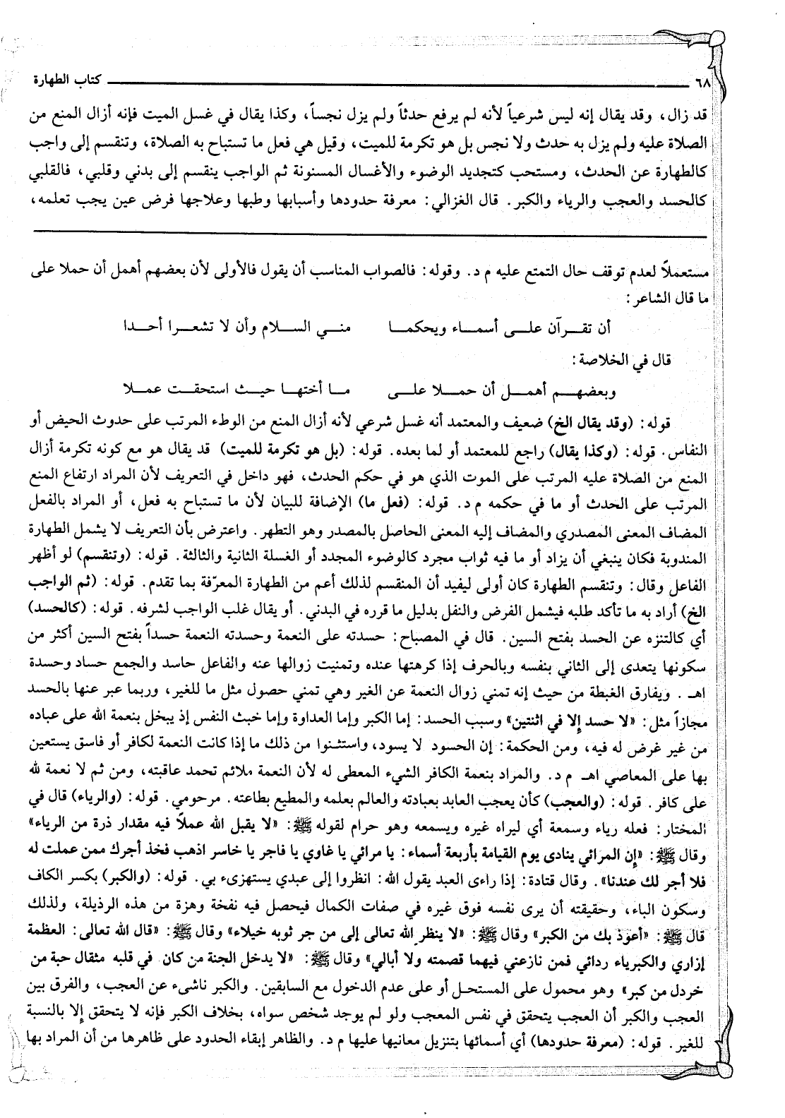 قَوْلُهُ: كَالْحَسَدِ أَيْ كَالتَّنَزُّهِ عَنْ الْحَسَدِ بِفَتْحِ السِّينِ قَالَ فِي الْمِصْبَاحِ حَسَدْته عَلَى النِّعْمَةِ وَحَسَدْته النِّعْمَةَ حَسَدًا بِفَتْحِ السِّينِ أَكْثَرُ مِنْ سُكُونِهَا يَتَعَدَّى إلَى الثَّانِي بِنَفْسِهِ وَبِالْحَرْفِ إذَا كَرِهْتهَا عِنْدَهُ وَتَمَنَّيْت زَوَالَهَا عَنْهُ وَالْفَاعِلُ حَاسِدٌ وَالْجَمْعُ حُسَّادٌ وَحَسَدَةٌ اهـ. وَيُفَارِقُ الْغِبْطَةَ مِنْ حَيْثُ إنَّهُ تَمَنِّي زَوَالِ النِّعْمَةِ عَنْ الْغَيْرِ وَهِيَ تَمَنِّي حُصُولِ مِثْلِ مَا لِلْغَيْرِ، وَرُبَّمَا عُبِّرَ عَنْهَا بِالْحَسَدِ مَجَازًا مِثْلُ: «لَا حَسَدَ إلَّا فِي اثْنَتَيْنِ» وَسَبَبُ الْحَسَدِ: إمَّا الْكِبْرُ وَإِمَّا الْعَدَاوَةُ وَإِمَّا خُبْثُ النَّفْسِ إذْ يَبْخَلُ بِنِعْمَةِ اللَّهِ عَلَى عِبَادِهِ مِنْ غَيْرِ غَرَضٍ لَهُ فِيهِ، وَمِنْ الْحِكْمَةِ: إنَّ الْحَسُودَ لَا يَسُودُ، وَاسْتَثْنَوْا مِنْ ذَلِكَ مَا إذَا كَانَتْ النِّعْمَةُ لِكَافِرٍ أَوْ فَاسِقٍ يَسْتَعِينُ بِهَا عَلَى الْمَعَاصِي اهـ م د. وَالْمُرَادُ بِنِعْمَةِ الْكَافِرِ الشَّيْءُ الْمُعْطَى لَهُ لِأَنَّ النِّعْمَةَ مُلَائِمٌ تُحْمَدُ عَاقِبَتُهُ، وَمِنْ ثَمَّ لَا نِعْمَةَ لِلَّهِ عَلَى كَافِرٍ. قَوْلُهُ: (وَالْعُجْبِ) كَأَنْ يُعْجَبَ الْعَابِدُ بِعِبَادَتِهِ وَالْعَالِمُ بِعِلْمِهِ وَالْمُطِيعُ بِطَاعَتِهِ. مَرْحُومِيٌّ.
