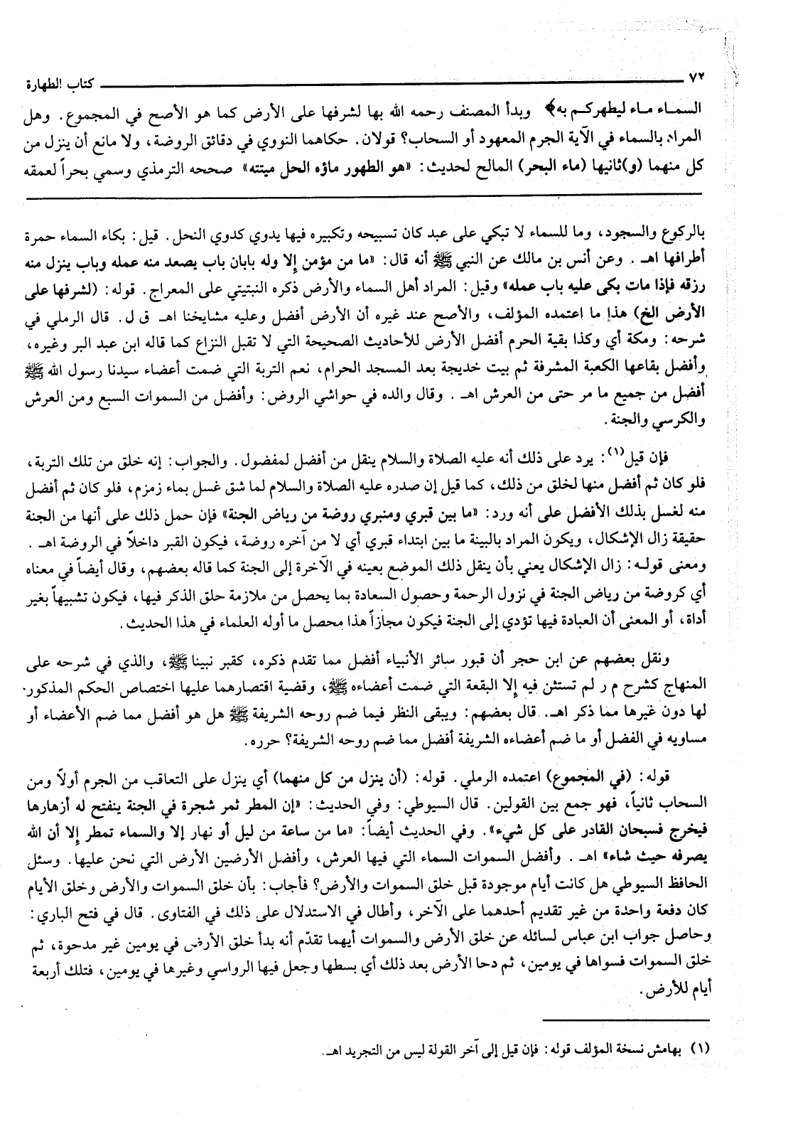 وَبَدَأَ الْمُصَنِّفُ - رَحِمَهُ اللَّهُ - بِهَا لِشَرَفِهَا عَلَى الْأَرْضِ كَمَا هُوَ الْأَصَحُّ فِي الْمَجْمُوعِ. وَهَلْ الْمُرَادُ بِالسَّمَاءِ فِي الْآيَةِ الْجِرْمُ الْمَعْهُودُ أَوْ السَّحَابُ؟ قَوْلَانِ. حَكَاهُمَا النَّوَوِيُّ فِي دَقَائِقِ الرَّوْضَةِ، وَلَا مَانِعَ أَنْ يَنْزِلَ مِنْ كُلٍّ مِنْهُمَا.