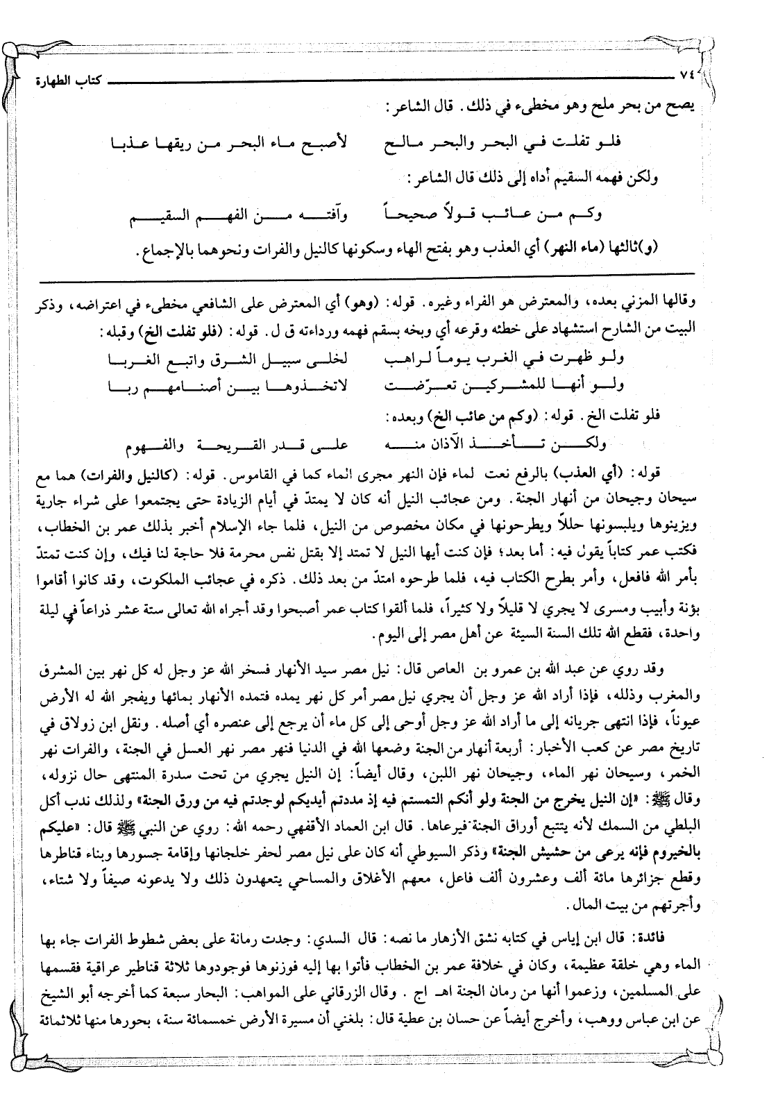 قَوْلُهُ: (كَالنِّيلِ وَالْفُرَاتِ) هُمَا مَعَ سَيْحَانَ وَجَيْحَانَ مِنْ أَنْهَارِ الْجَنَّةِ. وَمِنْ عَجَائِبِ النِّيلِ أَنَّهُ كَانَ لَا يَمْتَدُّ فِي أَيَّامِ الزِّيَادَةِ حَتَّى يَجْتَمِعُوا عَلَى شِرَاءِ جَارِيَةٍ وَيُزَيِّنُوهَا وَيُلْبِسُونَهَا حُلَلًا وَيَطْرَحُونَهَا فِي مَكَان مَخْصُوصٍ مِنْ النِّيلِ، فَلَمَّا جَاءَ الْإِسْلَامُ أُخْبِرَ بِذَلِكَ عُمَرُ بْنُ الْخَطَّابِ، فَكَتَبَ عُمَرُ كِتَابًا يَقُولُ فِيهِ: أَمَّا بَعْدُ؛ فَإِنْ كُنْت أَيُّهَا النِّيلُ لَا تَمْتَدُّ إلَّا بِقَتْلِ نَفْسٍ مُحَرَّمَةٍ فَلَا حَاجَةَ لَنَا فِيك، وَإِنْ كُنْت تَمْتَدُّ بِأَمْرِ اللَّهِ فَافْعَلْ، وَأَمَرَ بِطَرْحِ الْكِتَابِ فِيهِ، فَلَمَّا طَرَحُوهُ امْتَدَّ مِنْ بَعْدِ ذَلِكَ. ذَكَرَهُ فِي عَجَائِبِ الْمَلَكُوتِ، وَقَدْ كَانُوا أَقَامُوا بَئُونَةَ وَأَبِيبَ وَمِسْرَى لَا يَجْرِي لَا قَلِيلًا وَلَا كَثِيرًا، فَلَمَّا أَلْقَوْا كِتَابَ عُمَرَ أَصْبَحُوا وَقَدْ أَجْرَاهُ اللَّهُ تَعَالَى سِتَّةَ عَشَرَ ذِرَاعًا فِي لَيْلَةٍ وَاحِدَةٍ، فَقَطَعَ اللَّهُ تِلْكَ السُّنَّةَ السَّيِّئَةَ عَنْ أَهْلِ مِصْرَ إلَى الْيَوْمِ.
