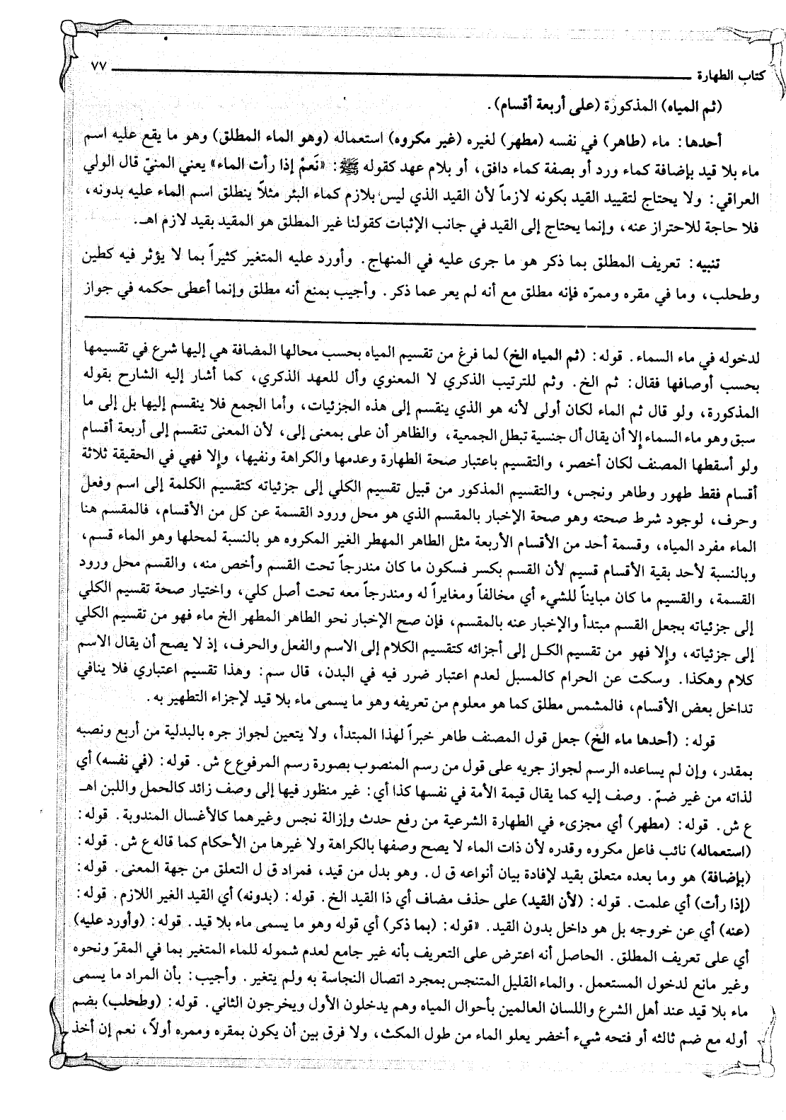 أَحَدُهَا: مَاءٌ (طَاهِرٌ) فِي نَفْسِهِ (مُطَهِّرٌ) لِغَيْرِهِ (غَيْرُ مَكْرُوهٍ) اسْتِعْمَالُهُ (وَهُوَ الْمَاءُ الْمُطْلَقُ) وَهُوَ مَا يَقَعُ عَلَيْهِ اسْمُ مَاءٍ بِلَا قَيْدٍ بِإِضَافَةٍ كَمَاءِ وَرْدٍ أَوْ بِصِفَةٍ كَمَاءٍ دَافِقٍ، أَوْ فَاللَّامُ عَهْدٍ كَقَوْلِهِ - صَلَّى اللَّهُ عَلَيْهِ وَسَلَّمَ -: «نَعَمْ إذَا رَأَتْ الْمَاءَ» يَعْنِي الْمَنِيَّ قَالَ الْوَلِيُّ الْعِرَاقِيُّ: وَلَا يُحْتَاجُ لِتَقْيِيدِ الْقَيْدِ بِكَوْنِهِ لَازِمًا لِأَنَّ الْقَيْدَ الَّذِي لَيْسَ بِلَازِمٍ كَمَاءِ الْبِئْرِ مَثَلًا يَنْطَلِقُ اسْمُ الْمَاءِ عَلَيْهِ بِدُونِهِ، فَلَا حَاجَةَ لِلِاحْتِرَازِ عَنْهُ، وَإِنَّمَا يُحْتَاجُ إلَى الْقَيْدِ فِي جَانِبِ الْإِثْبَاتِ كَقَوْلِنَا غَيْرُ الْمُطْلَقِ هُوَ الْمُقَيَّدُ بِقَيْدٍ لَازِمٍ اهـ.