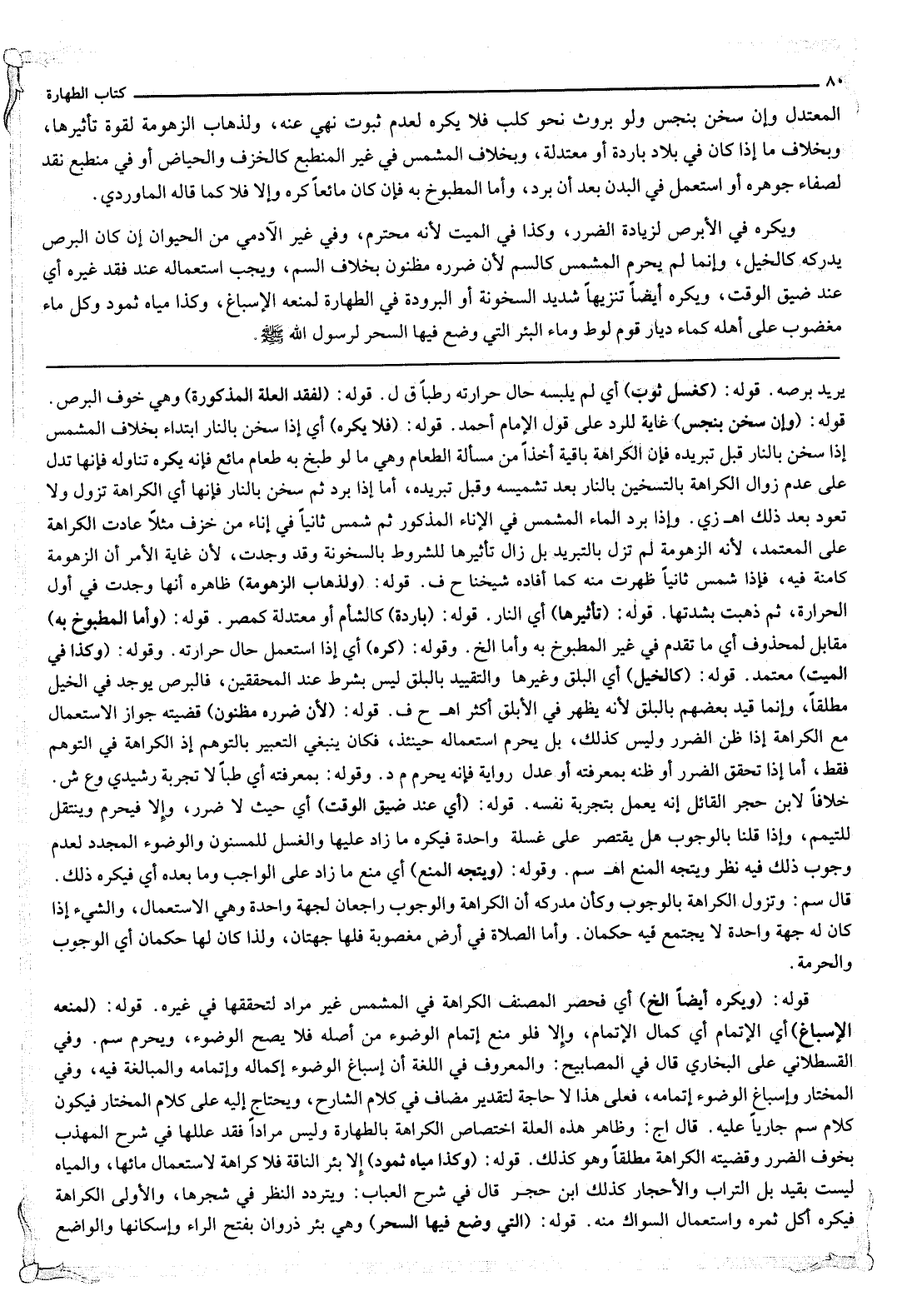 قَوْلُهُ: (وَيُكْرَهُ أَيْضًا إلَخْ) أَيْ فَحَصْرُ الْمُصَنِّفِ الْكَرَاهَةَ فِي الْمُشَمَّسِ غَيْرُ مُرَادٍ لِتَحَقُّقِهَا فِي غَيْرِهِ. قَوْلُهُ: (لِمَنْعِهِ الْإِسْبَاغَ) أَيْ الْإِتْمَامَ أَيْ كَمَالَ الْإِتْمَامِ، وَإِلَّا فَلَوْ مَنَعَ إتْمَامَ الْوُضُوءِ مِنْ أَصْلِهِ فَلَا يَصِحُّ الْوُضُوءُ، وَيَحْرُمُ سم. وَفِي الْقَسْطَلَّانِيِّ عَلَى الْبُخَارِيِّ قَالَ فِي الْمَصَابِيحِ: وَالْمَعْرُوفُ فِي اللُّغَةِ أَنَّ إسْبَاغَ الْوُضُوءِ إكْمَالُهُ وَإِتْمَامُهُ وَالْمُبَالَغَةُ فِيهِ، وَفِي الْمُخْتَارِ وَإِسْبَاغُ الْوُضُوءِ إتْمَامُهُ، فَعَلَى هَذَا لَا حَاجَةَ لِتَقْدِيرِ مُضَافٍ فِي كَلَامِ الشَّارِحِ، وَيَحْتَاجُ إلَيْهِ عَلَى كَلَامِ الْمُخْتَارِ فَيَكُونُ كَلَامُ سم جَارِيًا عَلَيْهِ. قَالَ اج: وَظَاهِرُ هَذِهِ الْعِلَّةِ اخْتِصَاصُ الْكَرَاهَةِ بِالطَّهَارَةِ وَلَيْسَ مُرَادًا فَقَدْ عَلَّلَهَا فِي شَرْحِ الْمُهَذَّبِ بِخَوْفِ الضَّرَرِ وَقَضِيَّتُهُ الْكَرَاهَةُ مُطْلَقًا وَهُوَ كَذَلِكَ.