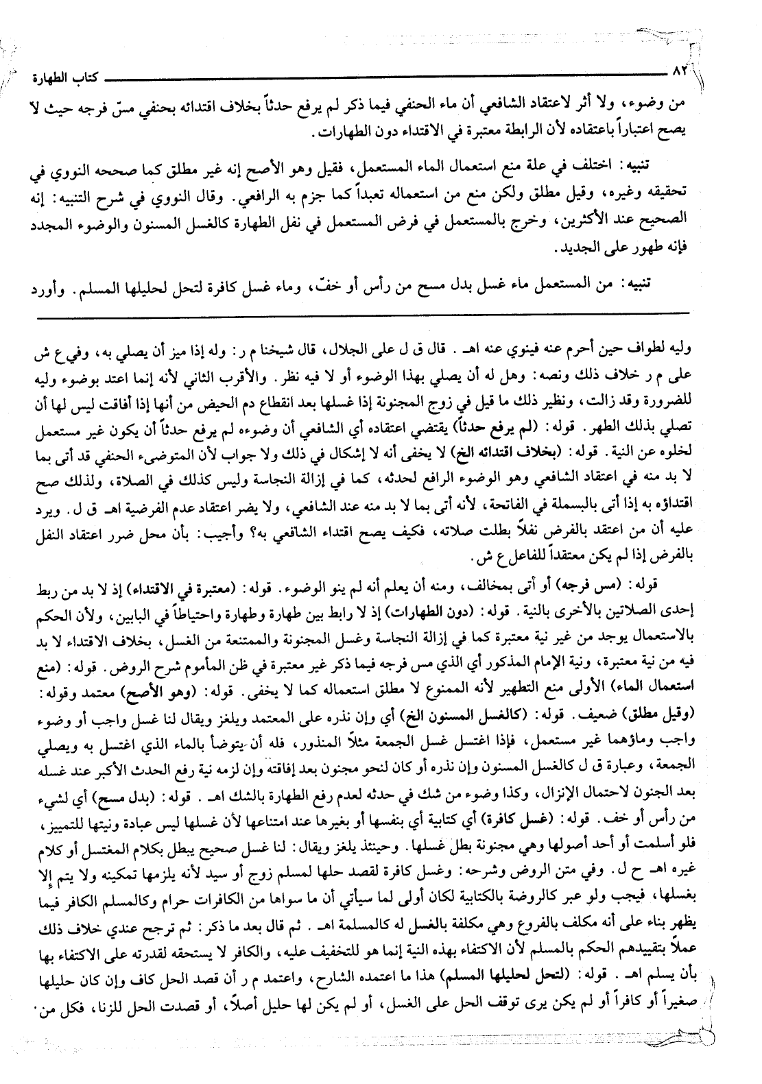 مِنْ وُضُوءٍ، وَلَا أَثَرَ لِاعْتِقَادِ الشَّافِعِيِّ أَنَّ مَاءَ الْحَنَفِيِّ فِيمَا ذُكِرَ لَمْ يَرْفَعْ حَدَثًا بِخِلَافِ اقْتِدَائِهِ بِحَنَفِيٍّ مَسَّ فَرْجَهُ حَيْثُ لَا يَصِحُّ اعْتِبَارًا بِاعْتِقَادِهِ لِأَنَّ الرَّابِطَةَ مُعْتَبَرَةٌ فِي الِاقْتِدَاءِ دُونَ الطِّهَارَاتِ.