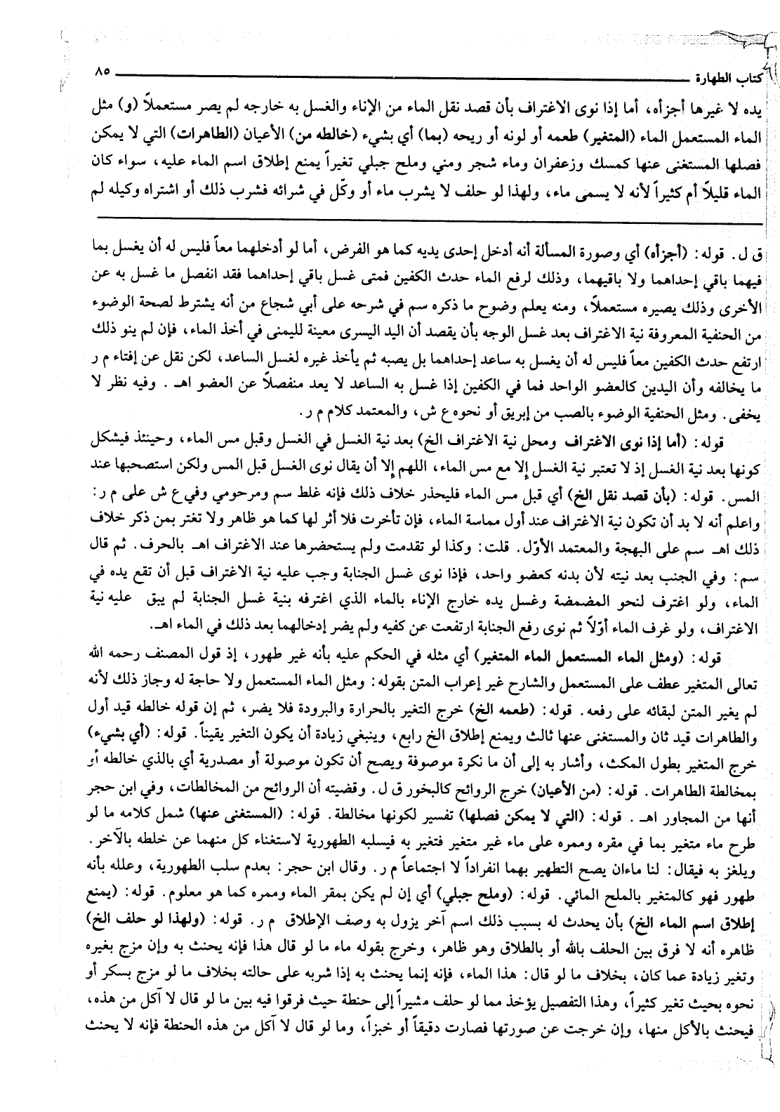 يَدِهِ لَا غَيْرَهَا أَجْزَأَهُ، أَمَّا إذَا نَوَى الِاغْتِرَافَ بِأَنْ قَصَدَ نَقْلَ الْمَاءِ مِنْ الْإِنَاءِ وَالْغُسْلَ بِهِ خَارِجَهُ لَمْ يَصِرْ مُسْتَعْمَلًا (وَ) مِثْلُ الْمَاءِ الْمُسْتَعْمَلِ الْمَاءُ (الْمُتَغَيِّرُ) طَعْمُهُ أَوْ لَوْنُهُ أَوْ رِيحُهُ (بِمَا) أَيْ بِشَيْءٍ (خَالَطَهُ مِنْ) الْأَعْيَانِ (الطَّاهِرَاتِ) الَّتِي لَا يُمْكِنُ فَصْلُهَا الْمُسْتَغْنَى عَنْهَا كَمِسْكٍ وَزَعْفَرَانٍ وَمَاءِ شَجَرٍ وَمَنِيٍّ وَمِلْحٍ جَبَلِيٍّ تَغَيُّرًا يَمْنَعُ إطْلَاقَ اسْمِ الْمَاءِ عَلَيْهِ، سَوَاءٌ كَانَ الْمَاءُ قَلِيلًا أَمْ كَثِيرًا لِأَنَّهُ لَا يُسَمَّى مَاءً، وَلِهَذَا لَوْ حَلَفَ لَا يَشْرَبُ مَاءً أَوْ وَكَّلَ فِي شِرَائِهِ فَشَرِبَ ذَلِكَ أَوْ اشْتَرَاهُ وَكِيلُهُ لَمْ
