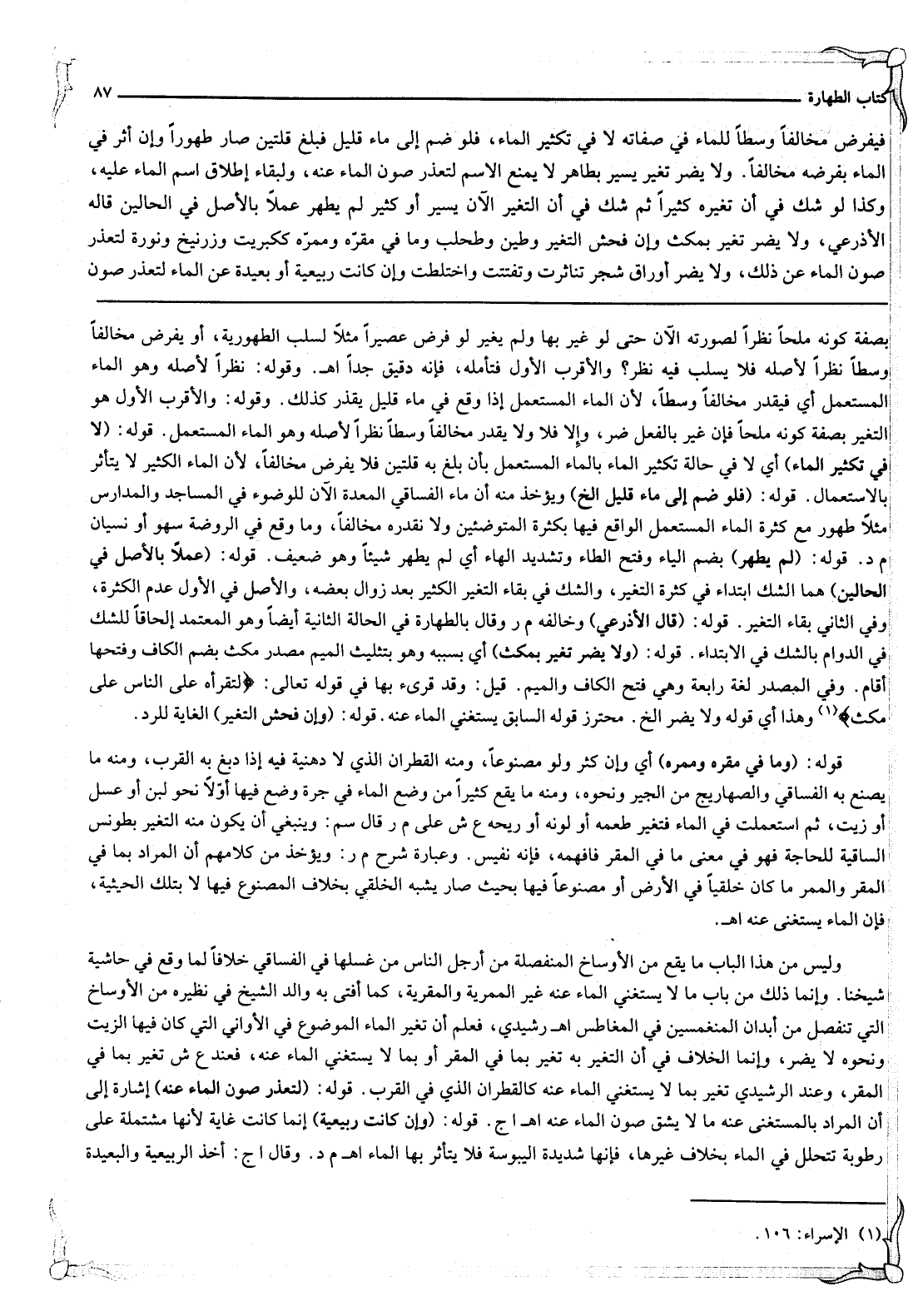 ـــــــــــــــــــــــــــــQبِصِفَةِ كَوْنِهِ مِلْحًا نَظَرًا لِصُورَتِهِ الْآنَ حَتَّى لَوْ غَيَّرَ بِهَا وَلَمْ يُغَيِّرْ لَوْ فُرِضَ عَصِيرًا مَثَلًا لِسَلْبِ الطَّهُورِيَّةِ، أَوْ يَفْرِضُ مُخَالِفًا وَسَطًا نَظَرًا لِأَصْلِهِ فَلَا يُسْلَبُ فِيهِ نَظَرٌ؟ وَالْأَقْرَبُ الْأَوَّلُ فَتَأَمَّلْهُ، فَإِنَّهُ دَقِيقٌ جِدًّا اهـ. وَقَوْلُهُ: نَظَرًا لِأَصْلِهِ وَهُوَ الْمَاءُ الْمُسْتَعْمَلُ أَيْ فَيُقَدَّرُ مُخَالِفًا وَسَطًا، لِأَنَّ الْمَاءَ الْمُسْتَعْمَلَ إذَا وَقَعَ فِي مَاءٍ قَلِيلٍ يَقْذُرُ كَذَلِكَ. وَقَوْلُهُ: وَالْأَقْرَبُ الْأَوَّلُ هُوَ التَّغَيُّرُ بِصِفَةِ كَوْنِهِ مِلْحًا فَإِنْ غَيَّرَ بِالْفِعْلِ ضَرَّ، وَإِلَّا فَلَا وَلَا يُقَدَّرُ مُخَالِفًا وَسَطًا نَظَرًا لِأَصْلِهِ وَهُوَ الْمَاءُ الْمُسْتَعْمَلُ.