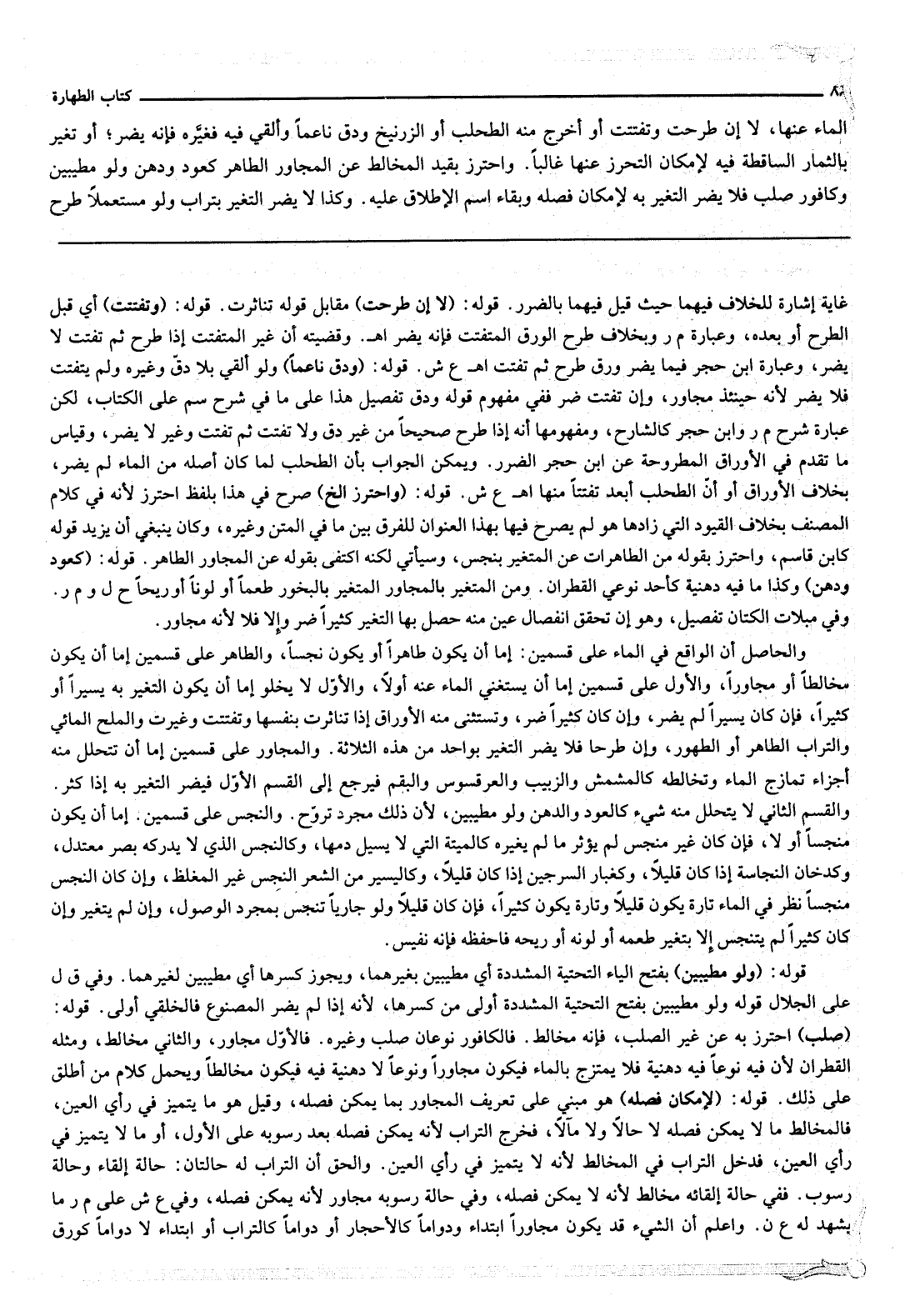 قَوْلُهُ: (كَعُودٍ وَدُهْنٍ) وَكَذَا مَا فِيهِ دُهْنِيَّةٌ كَأَحَدِ نَوْعَيْ الْقَطْرَانِ. وَمِنْ الْمُتَغَيِّرِ بِالْمُجَاوِرِ الْمُتَغَيِّرُ بِالْبَخُورِ طَعْمًا أَوْ لَوْنًا أَوْ رِيحًا ح ل وم ر. وَفِي مُبَلَّاتِ الْكَتَّانِ تَفْصِيلٌ، وَهُوَ إنْ تَحَقَّقَ انْفِصَالُ عَيْنٍ مِنْهُ حَصَلَ بِهَا التَّغَيُّرُ كَثِيرًا ضَرَّ وَإِلَّا فَلَا لِأَنَّهُ مُجَاوِرٌ.