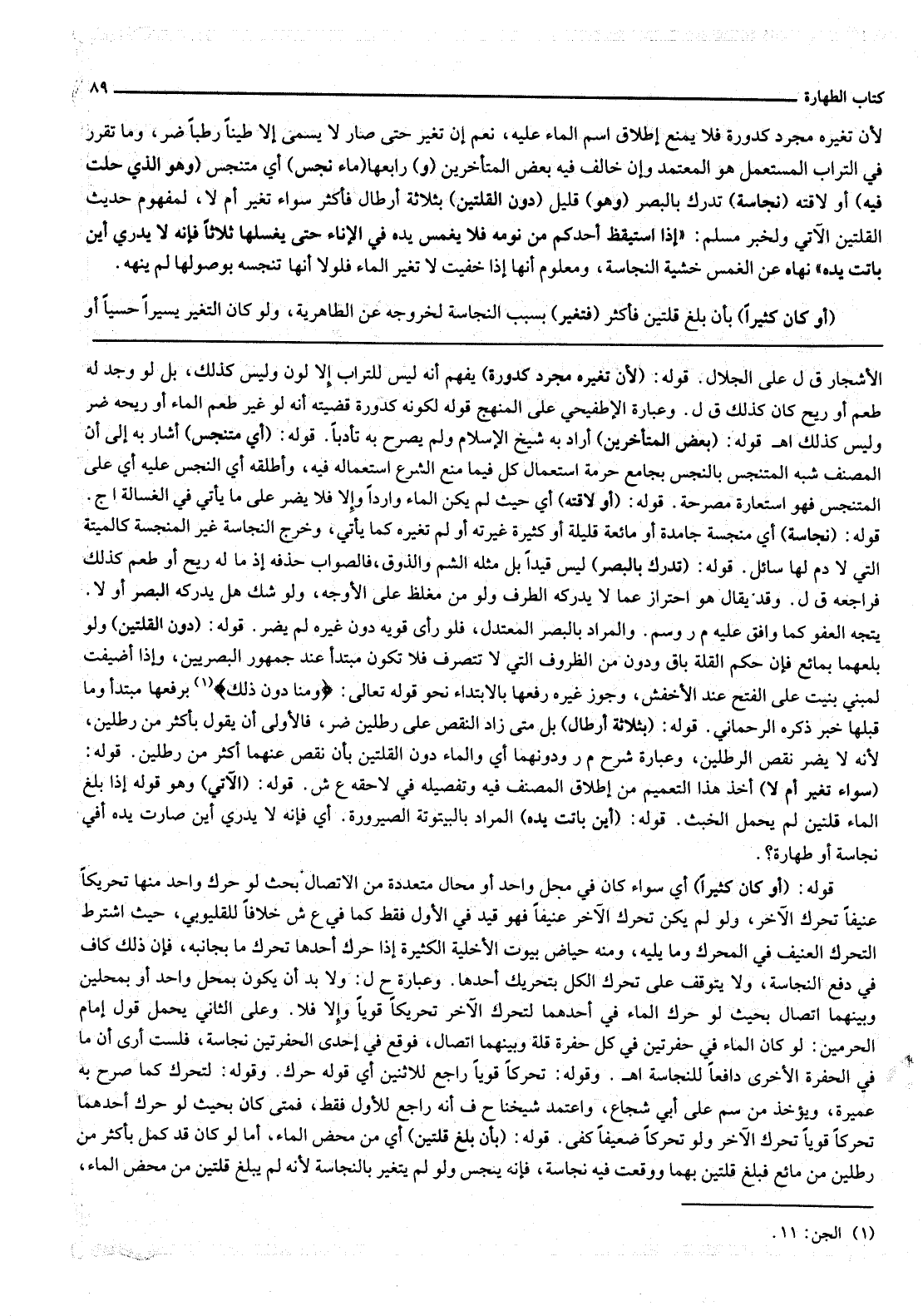 قَوْلُهُ: (دُونَ الْقُلَّتَيْنِ) وَلَوْ بَلَغَهُمَا بِمَائِعٍ فَإِنَّ حُكْمَ الْقُلَّةِ بَاقٍ، وَدُونَ مِنْ الظُّرُوفِ الَّتِي لَا تَتَصَرَّفُ فَلَا تَكُونُ مُبْتَدَأً عِنْدَ جُمْهُورِ الْبَصْرِيِّينَ، وَإِذَا أُضِيفَتْ لِمَبْنِيٍّ بُنِيَتْ عَلَى الْفَتْحِ عِنْدَ الْأَخْفَشِ، وَجَوَّزَ غَيْرُهُ رَفْعَهَا بِالِابْتِدَاءِ نَحْوُ قَوْله تَعَالَى: {وَمِنَّا دُونَ ذَلِكَ} [الجن: 11] بِرَفْعِهَا مُبْتَدَأً وَمَا قَبْلَهَا خَبَرٌ ذَكَرَهُ الرَّحْمَانِيُّ.
