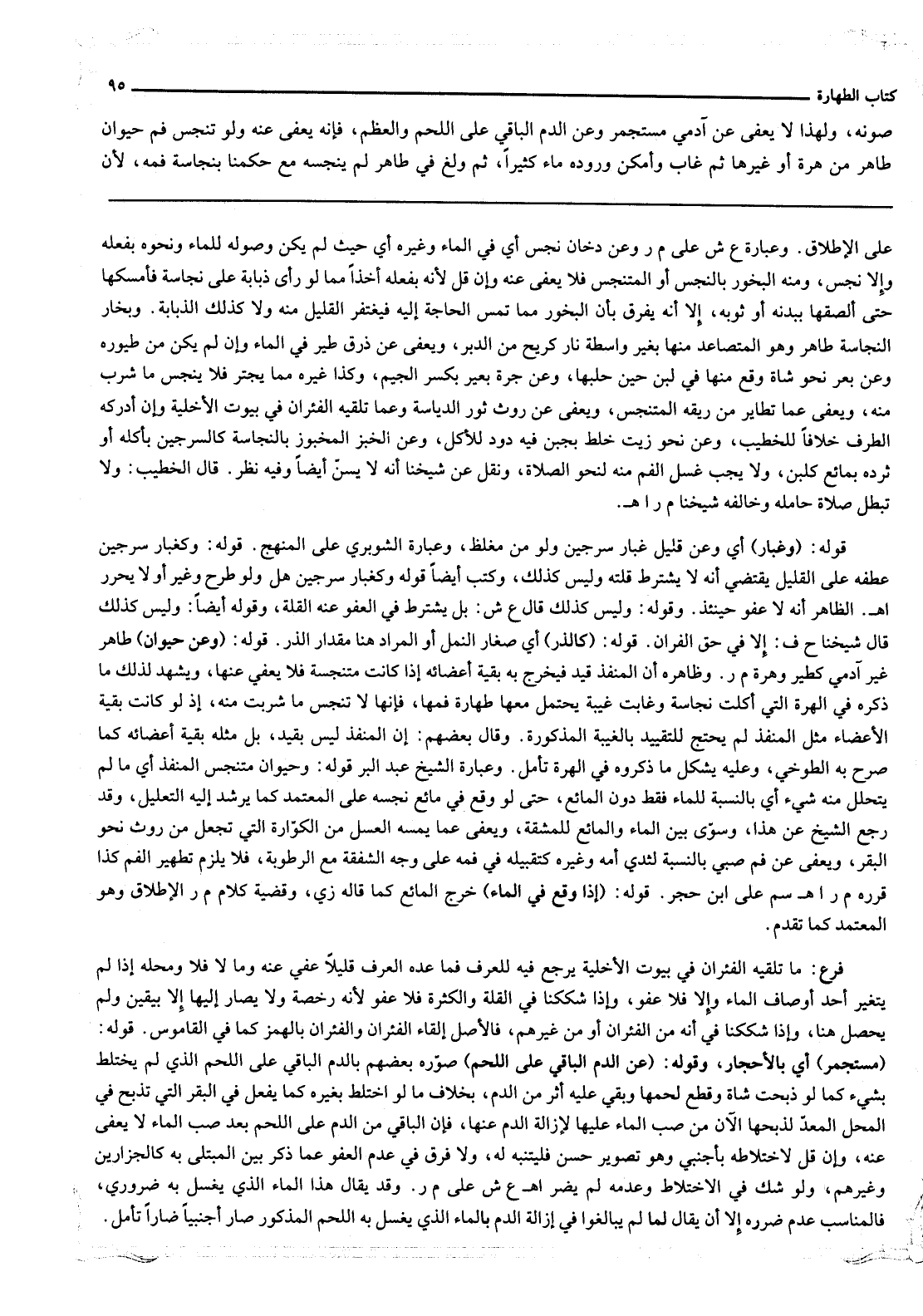 ـــــــــــــــــــــــــــــQعَلَى الْإِطْلَاقِ. وَعِبَارَةُ ع ش عَلَى م ر وَعَنْ دُخَانٍ نَجِسٍ أَيْ فِي الْمَاءِ وَغَيْرِهِ أَيْ حَيْثُ لَمْ يَكُنْ وُصُولُهُ لِلْمَاءِ وَنَحْوِهِ بِفِعْلِهِ وَإِلَّا نَجُسَ، وَمِنْهُ الْبَخُورُ بِالنَّجِسِ أَوْ الْمُتَنَجِّسِ فَلَا يُعْفَى عَنْهُ وَإِنْ قَلَّ لِأَنَّهُ بِفِعْلِهِ أَخْذًا مِمَّا لَوْ رَأَى ذُبَابَةً عَلَى نَجَاسَةٍ فَأَمْسَكَهَا حَتَّى أَلْصَقَهَا بِبَدَنِهِ أَوْ ثَوْبِهِ، إلَّا أَنَّهُ يُفَرَّقُ بِأَنَّ الْبَخُورَ مِمَّا تَمَسُّ الْحَاجَةُ إلَيْهِ فَيُغْتَفَرُ الْقَلِيلُ مِنْهُ وَلَا كَذَلِكَ الذُّبَابَةُ. وَبُخَارُ النَّجَاسَةِ طَاهِرٌ وَهُوَ الْمُتَصَاعِدُ مِنْهَا بِغَيْرِ وَاسِطَةِ نَارٍ كَرِيحٍ مِنْ الدُّبُرِ، وَيُعْفَى عَنْ ذَرْقِ طَيْرٍ فِي الْمَاءِ وَإِنْ لَمْ يَكُنْ مِنْ طُيُورِهِ وَعَنْ بَعْرِ نَحْوِ شَاةٍ وَقَعَ مِنْهَا فِي لَبَنٍ حِينَ حَلْبِهَا، وَعَنْ جِرَّةِ بَعِيرٍ بِكَسْرِ الْجِيمِ، وَكَذَا غَيْرُهُ مِمَّا يَجْتَرُّ فَلَا يُنَجِّسُ مَا شَرِبَ مِنْهُ، وَيُعْفَى عَمَّا تَطَايَرَ مِنْ رِيقِهِ الْمُتَنَجِّسِ، وَيُعْفَى عَنْ رَوْثِ ثَوْرِ الدِّيَاسَةِ وَعَمَّا تُلْقِيهِ الْفِئْرَانُ فِي بُيُوتِ الْأَخْلِيَةِ وَإِنْ أَدْرَكَهُ الطَّرْفُ خِلَافًا لِلْخَطِيبِ، وَعَنْ نَحْوِ زَيْتٍ خُلِطَ بِجُبْنٍ فِيهِ دُودٌ لِلْأَكْلِ، وَعَنْ الْخُبْزِ الْمَخْبُوزِ بِالنَّجَاسَةِ كَالسِّرْجِينِ بِأَكْلِهِ أَوْ ثَرْدِهِ بِمَائِعٍ كَلَبَنٍ، وَلَا يَجِبُ غَسْلُ الْفَمِ مِنْهُ لِنَحْوِ الصَّلَاةِ، وَنُقِلَ عَنْ شَيْخِنَا أَنَّهُ لَا يُسَنُّ أَيْضًا وَفِيهِ نَظَرٌ. قَالَ الْخَطِيبُ: وَلَا تَبْطُلُ صَلَاةُ حَامِلِهِ وَخَالَفَهُ شَيْخُنَا م ر اهـ.
