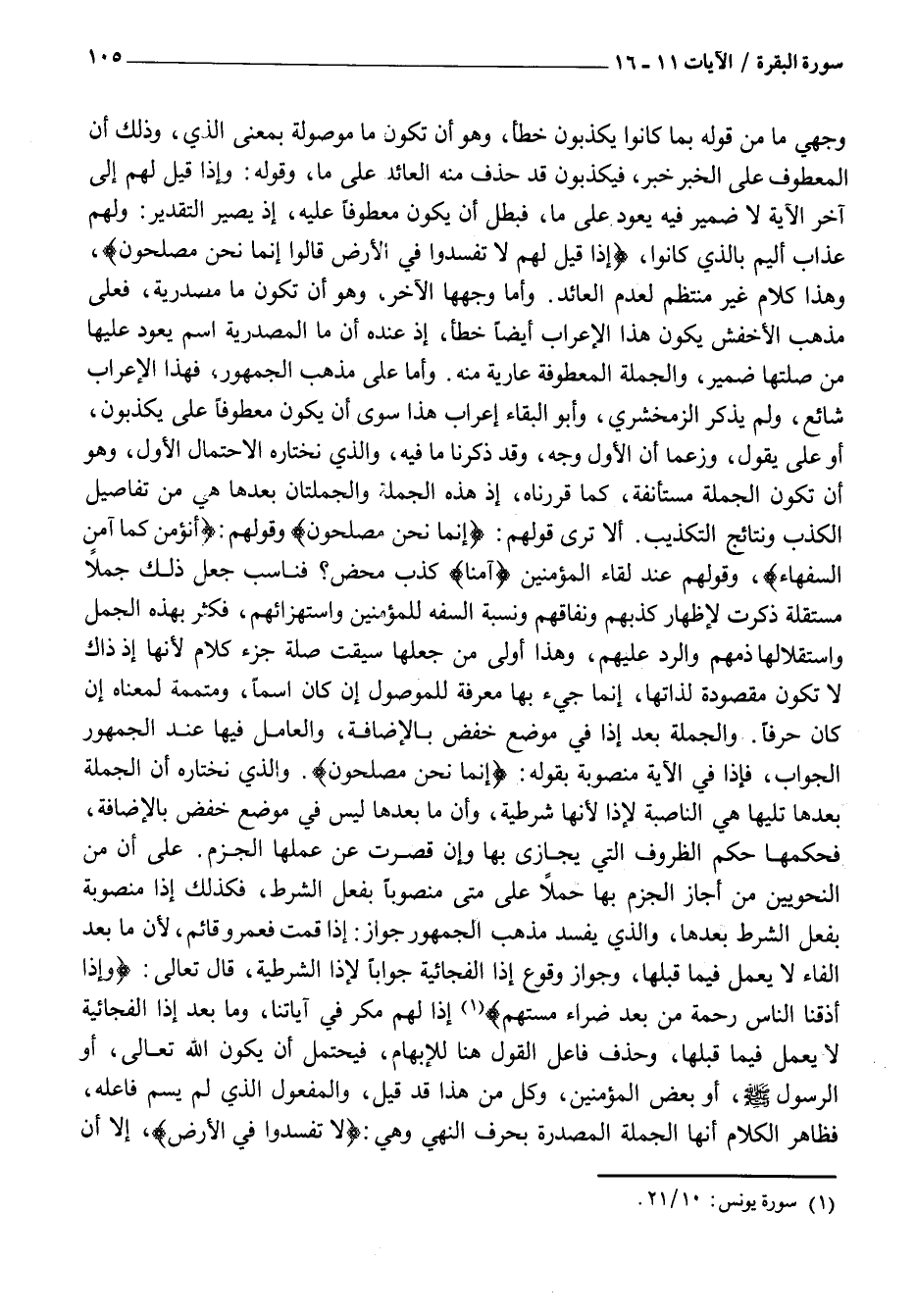 وَجْهَيْ مَا مِنْ قَوْلِهِ بِمَا كَانُوا يَكْذِبُونَ خَطَأٌ، وَهُوَ أَنْ تَكُونَ مَا مَوْصُولَةً بِمَعْنَى الَّذِي، وَذَلِكَ أَنَّ الْمَعْطُوفَ عَلَى الْخَبَرِ خَبَرٌ، فَيَكْذِبُونَ قَدْ حُذِفَ مِنْهُ الْعَائِدُ عَلَى مَا، وَقَوْلُهُ: وَإِذَا قِيلَ لَهُمْ إِلَى آخِرِ الْآيَةِ لَا ضَمِيرَ فِيهِ يَعُودُ عَلَى مَا، فَبَطَلَ أَنْ يَكُونَ مَعْطُوفًا عَلَيْهِ، إِذْ يَصِيرُ التَّقْدِيرُ: وَلَهُمْ عَذَابٌ أَلِيمٌ بالذي كَانُوا، إِذا قِيلَ لَهُمْ لَا تُفْسِدُوا فِي الْأَرْضِ قالُوا إِنَّما نَحْنُ مُصْلِحُونَ، وَهَذَا كَلَامٌ غَيْرُ مُنْتَظِمٍ لِعَدَمِ الْعَائِدِ. وَأَمَّا وَجْهُهَا الْآخَرُ، وَهُوَ أَنْ تَكُونَ مَا مَصْدَرِيَّةً، فَعَلَى مَذْهَبِ الْأَخْفَشِ يَكُونُ هَذَا الْإِعْرَابُ أَيْضًا خَطَأً، إِذْ عِنْدَهُ أَنَّ مَا الْمَصْدَرِيَّةَ اسْمٌ يَعُودُ عَلَيْهَا مِنْ صِلَتِهَا ضَمِيرٌ، وَالْجُمْلَةُ الْمَعْطُوفَةُ عَارِيَةٌ مِنْهُ. وَأَمَّا عَلَى مَذْهَبِ الْجُمْهُورِ، فَهَذَا الْإِعْرَابُ شَائِعٌ، وَلَمْ يَذْكُرِ الزَّمَخْشَرِيُّ، وَأَبُو الْبَقَاءِ إِعْرَابَ هَذَا سِوَى أَنْ يَكُونَ مَعْطُوفًا عَلَى يَكْذِبُونَ، أَوْ عَلَى يَقُولُ، وَزَعَمَا أَنَّ الْأَوَّلَ وَجْهٌ، وَقَدْ ذَكَرْنَا مَا فِيهِ، وَالَّذِي نَخْتَارُهُ الِاحْتِمَالُ الْأَوَّلُ، وَهُوَ أَنْ تَكُونَ الْجُمْلَةُ مُسْتَأْنَفَةً، كَمَا قَرَّرْنَاهُ، إِذْ هَذِهِ الْجُمْلَةُ وَالْجُمْلَتَانِ بَعْدَهَا هِيَ مِنْ تَفَاصِيلِ الْكَذِبِ وَنَتَائِجِ التَّكْذِيبِ. أَلَا تَرَى قَوْلَهُمْ: إِنَّما نَحْنُ مُصْلِحُونَ وَقَوْلَهُمْ: أَنُؤْمِنُ كَما آمَنَ السُّفَهاءُ، وَقَوْلَهُمْ عِنْدَ لِقَاءِ الْمُؤْمِنِينَ آمَنَّا كَذِبٌ مَحْضٌ؟ فَنَاسَبَ جَعَلَ ذَلِكَ جُمَلًا مُسْتَقِلَّةً ذُكِرَتْ لِإِظْهَارِ كَذِبِهِمْ وَنِفَاقِهِمْ وَنِسْبَةِ السَّفَهِ لِلْمُؤْمِنِينَ وَاسْتِهْزَائِهِمْ، فَكَثُرَ بِهَذِهِ الْجُمَلِ وَاسْتِقْلَالِهَا ذَمُّهُمْ وَالرَّدُّ عَلَيْهِمْ، وَهَذَا أَوْلَى مِنْ جَعْلِهَا سِيقَتْ صِلَةَ جُزْءِ كَلَامٍ لِأَنَّهَا إِذْ ذَاكَ لَا تَكُونُ مَقْصُودَةً لِذَاتِهَا، إِنَّمَا جِيءَ بِهَا مُعَرِّفَةً لِلْمَوْصُولِ إِنْ كَانَ اسْمًا، وَمُتَمِّمَةً لِمَعْنَاهُ إِنْ كَانَ حَرْفًا. وَالْجُمْلَةُ بَعْدَ إِذَا فِي مَوْضِعِ خَفْضٍ بِالْإِضَافَةِ، وَالْعَامِلُ فِيهَا عِنْدَ الْجُمْهُورِ الْجَوَابُ، فَإِذَا فِي الْآيَةِ مَنْصُوبَةٌ بِقَوْلِهِ: إِنَّما نَحْنُ مُصْلِحُونَ. وَالَّذِي نَخْتَارُهُ أَنَّ الْجُمْلَةَ بَعْدَهَا تَلِيهَا هِيَ النَّاصِبَةُ لِإِذَا لِأَنَّهَا شَرْطِيَّةٌ، وَأَنَّ مَا بَعْدَهَا لَيْسَ فِي مَوْضِعِ خَفْضٍ بِالْإِضَافَةِ، فَحُكْمُهَا حُكْمُ الظُّرُوفِ الَّتِي يُجَازَى بِهَا وَإِنْ قَصُرَتْ عَنْ عَمَلِهَا الْجَزْمَ. عَلَى أَنَّ مِنَ النَّحْوِيِّينَ مَنْ أَجَازَ الْجَزْمَ بِهَا حَمْلًا عَلَى مَتَى مَنْصُوبًا بِفِعْلِ الشَّرْطِ، فَكَذَلِكَ إِذَا مَنْصُوبَةٌ بِفِعْلِ الشَّرْطِ بَعْدَهَا، وَالَّذِي يُفْسِدُ مَذْهَبَ الْجُمْهُورِ جواز: إِذَا قُمْتَ فَعَمْرٌو قَائِمٌ، لِأَنَّ مَا بَعْدَ الْفَاءِ لَا يَعْمَلُ فِيمَا قَبْلَهَا، وَجَوَازُ وُقُوعِ إِذَا الْفُجَائِيَّةِ جَوَابًا لِإِذَا الشَّرْطِيَّةِ، قَالَ تَعَالَى: وَإِذا أَذَقْنَا النَّاسَ رَحْمَةً مِنْ بَعْدِ ضَرَّاءَ مَسَّتْهُمْ «1» إِذَا لَهُمْ مَكْرٌ فِي آيَاتِنَا، وَمَا بَعْدَ إِذَا الْفُجَائِيَّةِ لَا يَعْمَلُ فِيمَا قَبْلَهَا، وَحَذْفُ فَاعِلِ الْقَوْلِ هُنَا لِلْإِبْهَامِ، فَيُحْتَمَلُ أَنْ يَكُونَ اللَّهُ تَعَالَى، أَوِ الرَّسُولُ صَلَّى اللَّهُ عَلَيْهِ وَسَلَّمَ، أَوْ بَعْضُ الْمُؤْمِنِينَ، وَكُلٌّ مِنْ هَذَا قَدْ قِيلَ، وَ