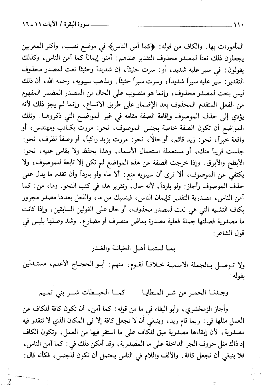الْأَبْطَحِ وَالْأَبْرَقِ. وَإِذَا خَرَجَتِ الصِّفَةُ عَنْ هَذِهِ الْمَوَاضِعِ لَمْ تَكُنْ إِلَّا تَابِعَةً لِلْمَوْصُوفِ، وَلَا يُكْتَفَى عَنِ الْمَوْصُوفِ، أَلَا تَرَى أَنَّ سِيبَوَيْهِ مَنَعَ: أَلَا مَاءً وَلَوْ بَارِدًا وَإِنْ تَقَدَّمَ مَا يَدُلُّ عَلَى حَذْفِ الْمَوْصُوفِ وَأَجَازَ: وَلَوْ بَارِدًا، لِأَنَّهُ حَالٌ، وَتَقْرِيرُ هَذَا فِي كُتُبِ النَّحْوِ. وَمَا، مِنْ: كَمَا آمَنَ النَّاسُ، مَصْدَرِيَّةٌ التَّقْدِيرُ كَإِيمَانِ النَّاسِ، فَيَنْسَبِكُ مِنْ مَا، وَالْفِعْلِ بَعْدَهَا مَصْدَرٌ مَجْرُورٌ بِكَافِ التَّشْبِيهِ الَّتِي هِيَ نَعْتٌ لِمَصْدَرٍ مَحْذُوفٍ، أَوْ حَالٌ عَلَى الْقَوْلَيْنِ السَّابِقَيْنِ، وَإِذَا كَانَتْ مَا مَصْدَرِيَّةً فَصِلَتُهَا جُمْلَةٌ فِعْلِيَّةٌ مُصَدَّرَةٌ بِمَاضٍ مُتَصَرِّفٍ أَوْ مُضَارِعٍ، وَشَذَّ وَصْلُهَا بِلَيَسَ فِي قَوْلِ الشَّاعِرِ: