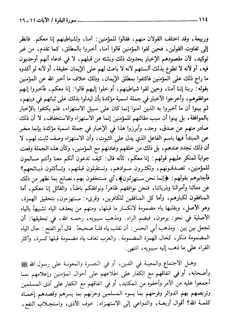 وَرَبِيعَةَ، وَقَدِ اخْتَلَفَ الْقَوْلَانِ مِنْهُمْ، فَقَالُوا لِلْمُؤْمِنِينَ: آمَنَّا، وَلِشَيَاطِينِهِمْ إِنَّا مَعَكُمْ. فَانْظُرْ إِلَى تَفَاوُتِ الْقَوْلَيْنِ، فَحِينَ لَقُوا الْمُؤْمِنِينَ قَالُوا آمَنَّا، أَخْبَرُوا بِالْمُطْلَقِ، كَمَا تَقَدَّمَ، مِنْ غَيْرِ تَوْكِيدٍ، لِأَنَّ مَقْصُودَهُمُ الْإِخْبَارُ بِحُدُوثِ ذَلِكَ وَنَشْئِهِ مِنْ قِبَلِهِمْ، لَا فِي ادِّعَاءِ أَنَّهُمْ أَوْحَدِيُّونَ فِيهِ، أَوْ لِأَنَّهُ لَا تُطَوِّعُ بِذَلِكَ أَلْسِنَتُهُمْ لِأَنَّهُ لَا بَاعِثَ لَهُمْ عَلَى الْإِيمَانِ حَقِيقَةً، أَوْ لِأَنَّهُ لَوْ أَكَّدُوهُ مَا رَاجَ ذَلِكَ عَلَى الْمُؤْمِنِينَ فَاكْتَفَوْا بِمُطْلَقِ الْإِيمَانِ، وَذَلِكَ خِلَافَ مَا أَخْبَرَ اللَّهُ عَنِ الْمُؤْمِنِينَ بِقَوْلِهِ: رَبَّنَا إِنَّنَا آمَنَّا، وَحِينَ لَقُوا شَيَاطِينَهُمْ، أَوْ خَلَوْا إِلَيْهِمْ قَالُوا: إِنَّا مَعَكُمْ، فَأَخْبَرُوا أَنَّهُمْ مُوَافِقُوهُمْ، وَأَخْرَجُوا الْأَخْبَارَ فِي جُمْلَةٍ اسْمِيَّةٍ مُؤَكَّدَةٍ بِإِنَّ لِيَدُلُّوا بِذَلِكَ عَلَى ثَبَاتِهِمْ فِي دِينِهِمْ، ثُمَّ بَيَّنُوا أَنَّ مَا أَخْبَرُوا بِهِ الَّذِينَ آمَنُوا إِنَّمَا كَانَ عَلَى سَبِيلِ الِاسْتِهْزَاءِ، فَلَمْ يَكْتَفُوا بِالْإِخْبَارِ بِالْمُوَافَقَةِ، بَلْ بَيَّنُوا أَنَّ سَبَبَ مَقَالَتِهِمْ لِلْمُؤْمِنِينَ إِنَّمَا هُوَ الِاسْتِهْزَاءُ وَالِاسْتِخْفَافُ، لَا أَنَّ ذَلِكَ صَادِرٌ مِنْهُمْ عَنْ صِدْقٍ، وَجِدٍّ، وَأَبْرَزُوا هَذَا فِي الأخبار في جملة اسمية مُؤَكَّدَةٍ بِإِنَّمَا مُخْبَرٌ عَنِ الْمُبْتَدَأِ فِيهَا بِاسْمِ الْفَاعِلِ الَّذِي يَدُلُّ عَلَى الثُّبُوتِ، وَأَنَّ الِاسْتِهْزَاءَ وَصْفٌ ثَابِتٌ لَهُمْ، لَا أَنَّ ذَلِكَ تَجَدُّدٌ عِنْدَهُمْ، بَلْ ذَلِكَ مِنْ خُلُقِهِمْ وَعَادَتِهِمْ مَعَ الْمُؤْمِنِينَ، وَكَأَنَّ هَذِهِ الْجُمْلَةَ وَقَعَتْ جَوَابًا لِمُنْكِرٍ عَلَيْهِمْ قَوْلَهُمْ: إِنَّا مَعَكُمْ، كَأَنَّهُ قَالَ: كَيْفَ تَدَّعُونَ أَنَّكُمْ مَعَنَا وَأَنْتُمْ مُسَالِمُونَ لِلْمُؤْمِنِينَ، تُصَدِّقُونَهُمْ، وَتُكَثِّرُونَ سَوَادَهُمْ، وَتَسْتَقْبِلُونَ قِبْلَتَهُمْ، وَتَأْكُلُونَ ذَبَائِحَهُمْ؟