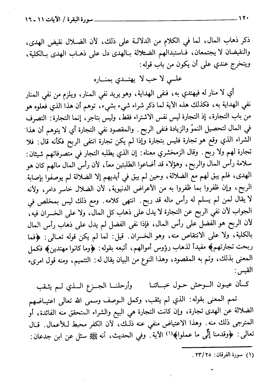 علي لا حب لَا يَهْتَدِي بِمَنَارِهِ أَيْ لَا مَنَارَ لَهُ فَيَهْتَدِي بِهِ، فَنَفَى الْهِدَايَةَ، وَهُوَ يُرِيدُ نَفْيَ الْمَنَارِ، وَيَلْزَمُ مِنْ نَفْيِ الْمَنَارِ نَفْيُ الْهِدَايَةِ بِهِ، فَكَذَلِكَ هَذِهِ الْآيَةُ لَمَّا ذَكَرَ شِرَاءَ شَيْءٍ بِشَيْءٍ، تَوَهَّمَ أَنَّ هَذَا الَّذِي فَعَلُوهُ هُوَ مِنْ بَابِ التِّجَارَةِ، إِذِ التِّجَارَةُ لَيْسَ نَفْسُ الِاشْتِرَاءِ فَقَطْ، وَلَيْسَ بِتَاجِرٍ، إِنَّمَا التِّجَارَةُ: التَّصَرُّفُ فِي الْمَالِ لِتَحْصِيلِ النُّمُوِّ وَالزِّيَادَةِ فَنَفَى الرِّبْحَ. وَالْمَقْصُودُ نَفْيُ التِّجَارَةِ أَيْ لَا يُتَوَهَّمُ أَنَّ هَذَا الشِّرَاءَ الَّذِي وَقَعَ هُوَ تِجَارَةٌ فَلَيْسَ بِتِجَارَةٍ وَإِذَا لَمْ يَكُنْ تِجَارَةً انْتَفَى الرِّبْحَ فَكَأَنَّهُ قَالَ: فَلَا تِجَارَةَ لَهُمْ وَلَا رِبْحَ. وَقَالَ الزَّمَخْشَرِيُّ مَعْنَاهُ: أَنَّ الَّذِي يَطْلُبُهُ التُّجَّارُ فِي مُتَصَرَّفَاتِهِمْ شَيْئَانِ: