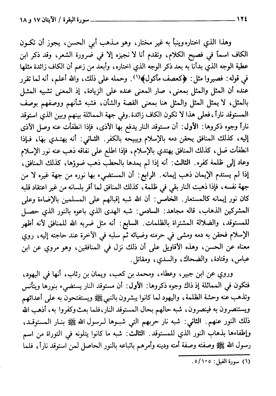 وَرُوِيَ عَنِ ابْنِ جُبَيْرٍ، وَعَطَاءٍ، وَمُحَمَّدِ بْنِ كَعْبٍ، وَيَمَانِ بْنِ رِئَابٍ، أَنَّهَا فِي الْيَهُودِ، فَتَكُونُ فِي الْمُمَاثَلَةِ إِذْ ذَاكَ وُجُوهٌ ذَكَرُوهَا: الْأَوَّلُ: أَنَّ مُسْتَوْقِدَ النَّارِ يَسْتَضِيءُ بِنُورِهَا وَيَتَأَنَّسُ وَتَذْهَبُ عَنْهُ وَحْشَةُ الظَّلْمَةِ، وَالْيَهُودُ لَمَّا كانوا يبشرون بِالنَّبِيِّ صَلَّى اللَّهُ عَلَيْهِ وَسَلَّمَ وَيَسْتَفْتِحُونَ بِهِ عَلَى أَعْدَائِهِمْ وَيَسْتَنْصِرُونَ بِهِ فَيُنْصَرُونَ، شَبَّهَ حَالَهُمْ بِحَالِ الْمُسْتَوْقِدِ النَّارَ، فَلَمَّا بُعِثَ وَكَفَرُوا بِهِ، أَذْهَبَ اللَّهُ ذَلِكَ النُّورَ عَنْهُمْ. الثَّانِي: شَبَّهَ نَارَ حَرْبِهِمُ الَّتِي شَبُّوهَا لِرَسُولِ اللَّهِ صَلَّى اللَّهُ عَلَيْهِ وَسَلَّمَ بِنَارِ الْمُسْتَوْقِدِ، وَإِطْفَاءَهَا بِذَهَابِ النُّورِ الَّذِي لِلْمُسْتَوْقِدِ. الثَّالِثُ: شَبَّهَ مَا كَانُوا يَتْلُونَهُ فِي التَّوْرَاةِ مِنِ اسْمِ رَسُولِ اللَّهِ صلى الله عليه وسلم وَصِفَتِهِ وَصِفَةِ أُمَّتِهِ وَدِينِهِ وَأَمْرِهِمْ بِاتِّبَاعِهِ بِالنُّورِ الْحَاصِلِ لِمَنِ اسْتَوْقَدَ نَارًا، فَلَمَّا