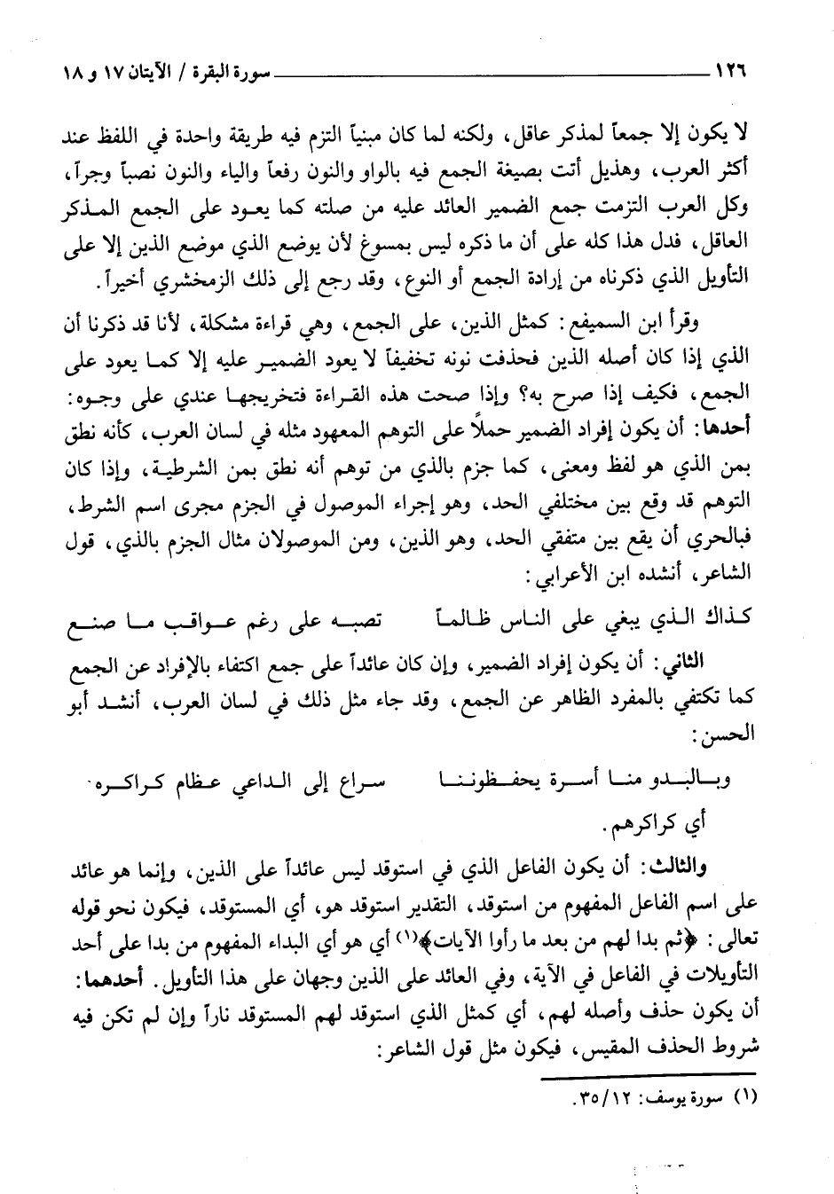 لَا يَكُونُ إِلَّا جَمْعًا لِمُذَكَّرٍ عَاقِلٍ، وَلَكِنَّهُ لَمَّا كَانَ مَبْنِيًّا الْتُزِمَ فِيهِ طَرِيقَةٌ وَاحِدَةٌ فِي اللَّفْظِ عِنْدَ أَكْثَرِ الْعَرَبِ، وَهُذَيْلٌ أَتَتْ بِصِيغَةِ الْجَمْعِ فِيهِ بِالْوَاوِ وَالنُّونِ رَفْعًا وَالْيَاءِ وَالنُّونِ نَصْبًا وَجَرًّا، وَكُلُّ الْعَرَبِ الْتَزَمَتْ جَمْعَ الضَّمِيرِ الْعَائِدِ عَلَيْهِ مِنْ صِلَتِهِ كَمَا يَعُودُ عَلَى الْجَمْعِ الْمُذَكَّرِ الْعَاقِلِ، فَدَلَّ هَذَا كُلُّهُ عَلَى أَنَّ مَا ذَكَرَهُ لَيْسَ بِمُسَوِّغٍ لِأَنْ يُوضَعَ الَّذِي مَوْضِعَ الَّذِينَ إِلَّا عَلَى التَّأْوِيلِ الَّذِي ذَكَرْنَاهُ مِنْ إِرَادَةِ الْجَمْعِ أَوِ النَّوْعِ، وَقَدْ رَجَعَ إِلَى ذَلِكَ الزَّمَخْشَرِيُّ أَخِيرًا.