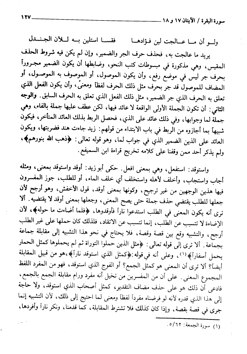 وَاسْتَوْقَدَ: اسْتَفْعَلَ، وَهِيَ بِمَعْنَى أَفْعَلَ. حَكَى أَبُو زَيْدٍ: أَوْقَدَ وَاسْتَوْقَدَ بِمَعْنًى، وَمِثْلُهُ أَجَابَ وَاسْتَجَابَ، وَأَخْلَفَ لِأَهْلِهِ وَاسْتَخْلَفَ أَيْ خَلَّفَ الْمَاءَ، أَوْ لِلطَّلَبِ، جَوَّزَ الْمُفَسِّرُونَ فِيهَا هَذَيْنِ الْوَجْهَيْنِ مِنْ غَيْرِ تَرْجِيحٍ، وَكَوْنُهَا بِمَعْنَى أَوْقَدَ، قَوْلُ الْأَخْفَشِ، وَهُوَ أَرْجَحُ لِأَنَّ جَعْلَهَا لِلطَّلَبِ يَقْتَضِي حَذْفَ جُمْلَةٍ حَتَّى يَصِحَّ الْمَعْنَى، وَجَعْلُهَا بِمَعْنَى أَوْقَدَ لَا يَقْتَضِيهِ. أَلَا تَرَى أَنَّهُ يَكُونُ الْمَعْنَى فِي الطَّلَبِ اسْتَدْعَوْا نَارًا فَأَوْقَدُوهَا، فَلَمَّا أَضاءَتْ مَا حَوْلَهُ، لِأَنَّ الْإِضَاءَةَ لَا تَتَسَبَّبُ عَنِ الطَّلَبِ، إِنَّمَا تَتَسَبَّبُ عَنِ الِاتِّقَادِ، فَلِذَلِكَ كَانَ حَمْلُهَا عَلَى غَيْرِ الطَّلَبِ أَرْجَحَ، وَالتَّشْبِيهُ وَقَعَ بَيْنَ قِصَّةٍ وَقِصَّةٍ، فَلَا يَحْتَاجُ فِي نَحْوِ هَذَا التَّشْبِيهِ إِلَى مُقَابَلَةِ جَمَاعَةٍ بِجَمَاعَةٍ. أَلَا تَرَى إِلَى قَوْلِهِ تَعَالَى: مَثَلُ الَّذِينَ حُمِّلُوا التَّوْراةَ ثُمَّ لَمْ يَحْمِلُوها كَمَثَلِ الْحِمارِ يَحْمِلُ أَسْفاراً «1» ، وَعَلَى أَنَّهُ فِي قَوْلِهِ: كَمَثَلِ الَّذِي اسْتَوْقَدَ نَارًا، هُوَ مِنْ قَبِيلِ الْمُقَابَلَةِ أَيْضًا؟ أَلَا تَرَى أَنَّ الْمَعْنَى هُوَ كَمَثَلِ الْجَمْعِ؟ أَوِ الْفَوْجِ الَّذِي اسْتَوْقَدَ، فَهُوَ مِنَ الْمُفْرَدِ اللَّفْظِ الْمَجْمُوعِ الْمَعْنَى. عَلَى أَنَّ مِنَ الْمُفَسِّرِينَ مَنْ تَخَيَّلَ أَنَّهُ مُفْرِدٌ وَرَامَ مُقَابَلَةَ الْجَمْعِ بِالْجَمْعِ، فَادَّعَى أَنَّ ذَلِكَ هُوَ عَلَى حَذْفِ مُضَافٍ التَّقْدِيرُ، كَمَثَلِ أَصْحَابِ الَّذِي اسْتَوْقَدَ، وَلَا حَاجَةَ إِلَى هَذَا الَّذِي قَدَّرَهُ لِأَنَّهُ لَوْ فَرَضْنَاهُ مُفْرَدًا لَفْظًا وَمَعْنًى لَمَا احْتِيجَ إِلَى ذَلِكَ، لِأَنَّ التَّشْبِيهَ إِنَّمَا جَرَى فِي قِصَّةٍ بِقِصَّةٍ، وَإِذَا كَانَ كَذَلِكَ فَلَا تُشْتَرَطُ الْمُقَابَلَةُ، كَمَا قَدَّمْنَا، وَنَكَّرَ نَارًا وَأَفْرَدَهَا،